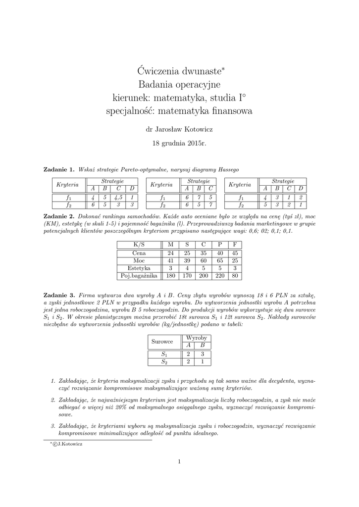 Ćwiczenia dwunaste∗ Badania operacyjne kierunek: matematyka, studia I◦ specjalność: matematyka finansowa dr Jarosław Kotowicz 18 grudnia 2015r. Zadanie 1. Wskaż strategie Pareto-optymalne, narysuj diagramy Hassego Kryteria f1 f2 A 4 6 Strategie B C D 5 4,5 1 5 3 3 Strategie A B C 6 7 5 6 5 7 Kryteria f1 f2 Kryteria f1 f2 A 4 5 Strategie B C D 3 1 2 3 2 1 Zadanie 2. Dokonać rankingu samochodów. Każde auto oceniane było ze względu na cenę (tyś zł), moc (KM), estetykę (w skali 1-5) i pojemność bagażnika (l). Przeprowadziwszy badania marketingowe w grupie potencjalnych klientów poszczególnym kryteriom przypisano następujące wagi: 0,6; 02; 0,1; 0,1. K/S Cena Moc Estetyka Poj.bagażnika M 24 41 3 180 S 25 39 4 170 C 35 60 5 200 P 40 65 5 220 F 45 25 3 80 Zadanie 3. Firma wytwarza dwa wyroby A i B. Ceny zbytu wyrobów wynoszą 18 i 6 PLN za sztukę, a zyski jednostkowe 2 PLN w przypadku każdego wyrobu. Do wytworzenia jednostki wyrobu A potrzebna jest jedna roboczogodzina, wyrobu B 5 roboczogodzin. Do produkcji wyrobów wykorzystuje się dwa surowce S1 i S2 . W okresie planistycznym można przerobić 18t surowca S1 i 12t surowca S2 . Nakłady surowców niezbędne do wytworzenia jednostki wyrobów (kg/jednostkę) podano w tabeli: Wyroby A B 2 3 2 1 Surowce S1 S2 1. Zakładając, że kryteria maksymalizacji zysku i przychodu są tak samo ważne dla decydenta, wyznaczyć rozwiązanie kompromisowe maksymalizujące ważoną sumę kryteriów. 2. Zakładając, że najważniejszym kryterium jest maksymalizacja liczby roboczogodzin, a zysk nie może odbiegać o więcej niż 20% od maksymalnego osiągalnego zysku, wyznaczyć rozwiązanie kompromisowe. 3. Zakładając, że kryteriami wyboru są maksymalizacja zysku i roboczogodzin, wyznaczyć rozwiązanie kompromisowe minimalizujące odległość od punktu idealnego. ∗ J.Kotowicz c 1 Zadanie 4. Firma produkująca dwa gatunki lodów B i C może ich tygodniowo wytworzyć maksymalnie 12 ton. Popyt na lody B jest ograniczony do co najwyżej 6 ton. Cena sprzedaży tony lodów B wynosi 6 tys. PLN, a lodów C – 7 tys. PLN Zyski jednostkowe z 1 tony wynoszą odpowiednio 2 tys. PLN oraz 1 tys. PLN. 1. Ustalić optymalny tygodniowy plan produkcji lodów, jeżeli dla właściciela złotówka zysku jest dwa razy ważniejsza od złotówki przychodu. 2. Wyznaczyć plan produkcji maksymalizujący przychód, jeżeli zadawalający poziom zysku wynosi 16 tys. PLN 3. Ustalić rozwiązanie problemu (przy jednoczesnej maksymalizacji zysku i przychodu), które będzie minimalizowało odległość od punktu idealnego. Zadanie 5. Rozważamy 6 projektów inwestycyjnych (P1 – P6 ). Każdy z tych projektów można scharakteryzować 3 wskaźnikami: r - wielkością robót, n - nakładami inwestycyjnymi, c - oczekiwanym efektem ekonomicznym. Wskaźniki te podano w tablicy. wskaźnik r n c P1 5 7 6 P2 6 6 10 P3 3 4 11 P4 8 8 13 P5 8 11 17 P6 4 8 9 Należy wyznaczyć zbiór projektów do realizacji, dający maksymalny łączny efekt ekonomiczny, przy ograniczeniach: 1. wielkość robót nie może przekraczać 26 jedn.; 2. nakłady inwestycyjne nie mogą być większe niż 28 jedn.; 3. projekty nie będą realizowane niezależnie od siebie: (a) (b) (c) (d) z projektów P1 , P3 może być zrealizowany co najwyżej jeden; z projektów P2 , P4 , P5 musi być zrealizowany co najmniej jeden; jeżeli zostanie zrealizowany projekt P4 , to musi być zrealizowany projekt P6 ; jeżeli zostanie zrealizowany co najmniej jeden z projektów P1 , P2 , to musi być zrealizowany co najmniej jeden z projektów P4 , P5 , P6 . Zadanie 6. Przedsiębiorstwo wytwarza 3 rodzaje wyrobów (W1 , W2 , W3 ) na dwóch maszynach. Współczynniki technologiczne oraz maksymalne czasy pracy maszyn podano w tablicy. Czas pracy Maszyna I Maszyna II Zysk jednostkowy W1 5 2 c1 W2 3 4 c2 W3 2 2 c3 Max czas pracy 28 20 Względy ekonomiczne nakazują: 1. wytwarzanie j-tego wyrobu w ilości nie mniejszej niż pj jedn. albo 2. nie wytwarzanie go w ogóle. Ustalono, że p1 = 2, p2 = 3 i p3 = 4. Należy znaleźć taki plan produkcji, aby zmaksymalizować zysk otrzymywany z produkcji wyrobów W1 , W2 , W3 . Zadanie 7. Mamy 4 stanowiska i 4 pracowników. Znamy macierz wydajności W = [wi,j ], gdzie wi,j jest wydajnością j-tego pracownika na i-tym stanowisku. Należy ustalić taki przydział pracowników do stanowisk pracy, aby łączna wydajność całego zespołu była maksymalna. Wyznacz wszystkie optymalne przydziały, gdy 10 8 9 7 6 4 12 7 W = 5 4 5 6 . 5 2 4 4 2 Zadanie 8. Stolarz produkuje stoły i krzesła, zużywając dwa limitowane środki: siłę roboczą (w roboczogodzinach) i drewno (w metrach). Normy zakładu, zasoby środków oraz cena wyrobów zawiera tabela. Stolarz dąży do maksymalizacji dochodu. Środki Robocizna Drewno Ceny Stoły 4 4 3 Krzesła 5 2 1 Zasób 10 7 1. Rozwiązać to zagadnienie przy użyciu metody Gomory’ego. 2. Rozwiązać to zagadnienie przy użyciu metody podziału i ograniczeń. 3. Rozwiązać to zagadnienie przy użyciu Solvera Excela. Literatura 3