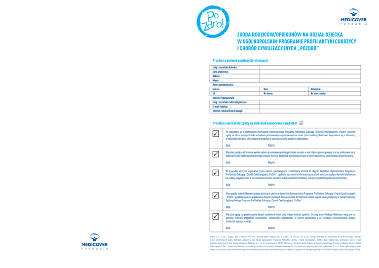 ZGODA RODZICÓW/OPIEKUNÓW NA UDZIAŁ DZIECKA W OGÓLNOPOLSKIM PROGRAMIE PROFILAKTYKI CUKRZYCY I CHORÓB CYWILIZACYJNYCH „POZDRO” Prosimy o podanie poniższych informacji: Imię i nazwisko dziecka: Data urodzenia: Szkoła: Klasa: Adres zamieszkania: Miasto: Kod: Dzielnica: Ul. Nr domu: Nr mieszkania: Rodzice/opiekunowie Imię i nazwisko rodzica/opiekuna: E-mail rodzica: Telefon rodzica (komórkowy): Prosimy o wyrażenie zgody na działania zaznaczone symbolem: Po zapoznaniu się z informacjami dotyczącymi Ogólnopolskiego Programu Profilaktyki Cukrzycy i Chorób Cywilizacyjnych „PoZdro” wyrażam zgodę na udział mojego dziecka w badaniu przesiewowym organizowanym w szkole przez Fundację Medicover. Zapoznałem się z informacją o możliwości kontaktu z Realizatorem programu w celu wyjaśnienia wszelkich wątpliwości. DATA PODPIS Wyrażam zgodę na otrzymanie wyniku badania przesiewowego mojego dziecka na adres e-mail rodzica podany powyżej oraz na przekazanie karty badania (wyniki badania przesiewowego) poprzez dyrekcję szkoły lub wychowawcę klasy w formie zamkniętej, adresowanej imiennie koperty. DATA PODPIS W przypadku wykrycia czynników ryzyka chorób cywilizacyjnych i kwalifikacji dziecka do objęcia dwuletnim Ogólnopolskim Programem Profilaktyki Cukrzycy i Chorób Cywilizacyjnych „PoZdro”, zgodnie z opisanymi w informatorze zasadami, wyrażam zgodę na kontakt telefoniczny na podany powyżej numer w celu ustalenia terminu pierwszej wizyty w ramach bezpłatnej, interdyscyplinarnej opieki specjalistycznej. DATA PODPIS W przypadku zakwalifikowania mojego dziecka do udziału w dwuletnim Ogólnopolskim Programie Profilaktyki Cukrzycy i Chorób Cywilizacyjnych „PoZdro” wyrażam zgodę na przekazanie danych osobowych mojego dziecka do Medicover celem objęcia opieką medyczną w ramach realizacji Ogólnopolskiego Programu Profilaktyki Cukrzycy i Chorób Cywilizacyjnych „PoZdro”. DATA PODPIS Wyrażam zgodę na przetwarzanie danych osobowych moich oraz mojego dziecka zgodnie z Ustawą przez Fundację Medicover wyłącznie na potrzeby realizacji programów zdrowotnych. Jednocześnie oświadczam, że jestem uprawniona/-y do prawnego reprezentowania dziecka (rodzic lub opiekun prawny). DATA PODPIS Zgodnie z art. 24 ust. 1 ustawy z dnia 29 sierpnia 1997 roku o ochronie danych osobowych (Dz. U. z 2002 r., Nr 101, poz. 926, ze zm.), Fundacja Medicover, Al. Jerozolimskie 96, 00-807 Warszawa, informuje, iż jest Administratorem Danych Osobowych podanych w celu objęcia Ogólnopolskim Programem Profilaktyki Cukrzycy i Chorób Cywilizacyjnych „PoZdro”. Dane osobowe będą przetwarzane także w celach archiwalno-statystycznych. Dane zostaną udostępnione Medicover Sp. z o.o., Al. Jerozolimskie 96, 00-807 Warszawa w celu objęcia opieką medyczną w ramach Ogólnopolskiego Programu Profilaktyki Cukrzycy i Chorób Cywilizacyjnych „PoZdro”. Jednocześnie informujemy, że niezależnym administratorem danych osobowych przetwarzanych w celu świadczenia usług medycznych staje się Medicover Sp. z o. o. Osoba objęta opieką ma prawo dostępu do treści swoich danych osobowych i ich poprawiania. Podanie danych osobowych jest dobrowolne jednak niezbędne do przystąpienia do Ogólnopolskiego Programu Profilaktyki Cukrzycy i Chorób Cywilizacyjnych „PoZdro”. 12. Jak często dziecko w ciągu tygodnia pije słodzone napoje (napoje gazowane, „wody smakowe”)? min. 5 razy w tygodniu 3-5 razy w tygodniu 1-3 razy w tygodniu nie pije takich napojów ANKIETA DLA RODZICÓW/OPIEKUNÓW W RAMACH OGÓLNOPOLSKIEGO PROGRAMU PROFILAKTYKI CUKRZYCY I CHORÓB CYWILIZACYJNYCH „POZDRO” 1. Jak ocenia Pani/Pan ogólny stan zdrowia dziecka? bardzo dobry b. dobry c. średni d. a. zły e. trudno mi ocenić 2. C zy dziecko choruje na choroby przewlekłe? nie tak, zaznacz jakie (może być kilka odpowiedzi) cukrzyca b. astma c. niedoczynność tarczycy d. zapalenie jelit e. alergie (skórne, pokarmowe) a. choroby serca i ukł. krążenia g. choroby ukł. oddechowego h. choroby ukł. pokarmowego f. choroby endokrynologiczne j. choroby neurologiczne k. inne …………............................................................................. i. 3. Czy dziecko pozostaje pod opieką lekarza specjalisty? nie tak, zaznacz jakiego (może być kilka odpowiedzi) alergologa b. pulmonologa c. endokrynologa d. kardiologa e. nefrologa f. gastrologa a. neurologa h. inny specjalista ………….................................... Z jakiego powodu …………........................................................ g. 4. Jak ocenia Pani/Pan masę ciała dziecka? znaczna niedowaga nieznaczna niedowaga prawidłowa nieznaczna nadwaga znaczna nadwaga 5. C zy w Pani/Pana opinii dziecko prawidłowo się odżywia? nie tak nie wiem 6. Czy w Pani/Pana opinii dziecko ma wystarczająco dużo ruchu w ciągu dnia? nie tak nie wiem 7. Jak często dziecko je słodycze i słone przekąski? kilka razy dziennie nie więcej niż raz dziennie nie jada słodyczy nie wiem 8. Ile razy w tygodniu dziecko je śniadanie (w domu)? min. 5 razy w tygodniu 3-5 razy w tygodniu kilka razy w tygodniu 1-3 razy w tygodniu 9. D ziecko zazwyczaj dostaje do szkoły (min. 3 dni w tygodniu): gotowe drugie śniadanie pieniądze na drugie śniadanie 13. Jak często dziecko w ciągu tygodnia pije wodę (wodę butelkowaną, przegotowaną, „kranówkę”)? min. 5 razy w tygodniu 3-5 razy w tygodniu 1-3 razy w tygodniu nie pije wody nie wiem 14. Ile godzin tygodniowo dziecko spędza w formie aktywności fizycznej – na aktywnej zabawie, uprawianiu sportu (nie wliczając zajęć w-f)? min. 5 godz. tygodniowo między 3 a 5 godz. między 1 a 3 godz. mniej niż 1 godz. tygodniowo 15. Czy Państwa dziecko ma trudności z zaśnięciem? nigdy bardzo rzadko tak, 1 raz w miesiącu więcej niż 5 razy w tygodniu tak, 1-2 razy w tygodniu 16. Jak często w ciągu tygodnia dziecko zgłasza, że jest zmęczone, niewyspane? nigdy bardzo rzadko rzadziej n