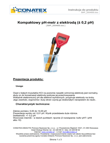 Instrukcja do produktu BAP_2004955.doc Kompaktowy pH-metr z elektrodą (± 0,2 pH) [ BAP_2004955.doc ] Prezentacja produktu: Uwaga: Osad z białych kryształów KCI na poziomie nasadki ochronnej elektrody jest normalny, służy on do konserwacji elektrody podczas jej przechowywania. Wskaźnik elektroniczny pH dla elektrod wymiennych, przyjmuje elektrody na śruby. Jego zwartość, ergonomia i duży ekran czynią go doskonałym narzędziem do nauki.. Charakterystyki techniczne: Zakres pomiaru: 0,00 do 14,00 pH Prezentacja wyniku od: 0,01 pH. Wynik przedstawia duże różnice. Dokładność: +/- 0,2 pH Wzorcowe mierniki - w dwóch punktach: ręcznie (2 rozwiązania: bufor pH7 i pH4 albo 10) CONATEX-DIDACTIC Pomoce Naukowe Sp. z o.o. - ul. Powstańców Śląskich 103/1, 01-355 Warszawa Dział Obsługi Klienta: tel.: 22 228 88 51, faks: 22 228 88 52 Internet: www.conatex.pl – e-mail: [email protected] Wszelkie prawa zastrzeżone. Powielanie i rozpowszechnianie części lub całości tej publikacji bez wyraźnej pisemnej zgody Conatex-Didactic Pomoce Naukowe Sp. z o.o. jest zabronione. Strona 1 z 3 Instrukcja do produktu BAP_2004955.doc Temperatura pracy: 0° do 50°C Baterie: 2 x 1,4V. Żywotność: około 3000h Wymiary (L x l x H mm): 66 x 50 x 25 mm. 38g Przygotowywanie do pracy. Instalacja: Aktywacja elektrody: przed jej pierwszym użyciem, albo po długim okresie, w którym nie była używana, elektroda mierząca pH wymaga rehydratacji należy ją więc umieścić na kilka godzin lub na 1 lub 2 dni (stosownie do stanu wysuszenia danej elektrody), w roztworze wodnym KCI (albo w roztworze do składowania) Połączyć sondę z aparatem aby uniknąć rozłożenia wzorców, Przewidywać roztwór buforu pH i mały śrubokręt zegarmistrza, pH7 pH4 albo pH10 Aparat funkcjonuje tylko z dwiema bateriami V13GA Utrzymanie: Płukać elektrodę po każdym użyciu i nakładać nasadkę ochronną, Okresowo oczyszczać błony szkła poprzez moczenie ich w roztworze rozpuszczonego kwasu solnego, Nigdy nie zostawiać osuszonej elektrody. Dodać trochę roztworu składowania do nasadki ochronnej przed umieszczeniem jej na elektrodzie. Na wypadek... Poważne odchylenia odczytu pH mogą być spowodowane przez osłabienie baterii i przede wszystkim przez stan elektrody: osuszenie, zanieczyszczenie i starzenie się elektrody często bywają odpowiedzialne za mylne pomiary. Wymieniać baterie, gdy wyświetlacz słabnie albo gdy wartości wskazywane zdecydowanie różnią się od wartości oczekiwanych (np.: pH=3 w roztworze buforowym pH4 do 20 °C…) Przy wykonywaniu rehydratacji elektrody (patrz powyżej), dobrze jest pamiętać, że: CONATEX-DIDACTIC Pomoce Naukowe Sp. z o.o. - ul. Powstańców Śląskich 103/1, 01-355 Warszawa Dział Obsługi Klienta: tel.: 22 228 88 51, faks: 22 228 88 52 Internet: www.conatex.pl – e-mail: [email protected] Wszelkie prawa zastrzeżone. Powielanie i rozpowszechnianie części lub całości tej publikacji bez wyraźnej pisemnej zgody Conatex-Didactic Pomoce Naukowe Sp. z o.o. jest zabronione. Strona 2 z 3 Instrukcja do produktu BAP_2004955.doc czysta woda (zdejonizowana albo destylowana…) zubaża elektrolit i sprawia, że zawiera on zbyt wiele naładowanych jonów ciężkich, które «zatruwają» elektrodę. Termin przydatności elektrody jest ograniczony: od 1 do 2 lat (stosownie do jakości użytkowania i utrzymywania). Użytkowanie techniczne Sposób użycia. Ściągnąć nasadkę ochronną elektrody. Płukać ciało w wodzie destylowanej by zmyć cały osad krystaliczny. Rehydratować elektrodę - po długim okresie nie używania, Odkręcić ochronę łącznika. Podłączyć elektrodę do wskaźnika pH, Włączyć aparat przy pomocy guzika start/zatrzymanie, Zanurzyć elektrodę w roztworze roboczym (poziom zanurzenia nie może dosięgać połączenia), Łagodnie pomieszać i czekać na ustabilizowanie się pomiaru. Przystąpić do wzorcowania elektrody, jeżeli jest to niezbędne. Wzorcowanie Kiedy temperatura nie jest wyrównana, lepiej jest wszystkie roztwory doprowadzić do tej samej temperatury. Ogółem, odchylenie między dwiema wartościami pH roztworów buforowych wybierane jest z 3 jednostek pH. Śruby regulujące znajdują się na górze aparatu. Regulowanie standaryzacji roztworu buforowego pH7 (albo sąsiedniego dla 7). Dopasować wartość uzyskaną w okienku poprzez manipulowanie śrubą potencjometryczną « pH7 », przy pomocy małego śrubokrętu. Regulowanie odchylenia w roztworze buforowym pH4 albo pH10. Dopasować na śrubie « pH4/10 ». Wzorcowanie jest niezbędne, kiedy chce się otrzymać pomiar z dobrą dokładnością, albo dobry pomiar po zmianie elektrody. Środki ostrożności Nie zostawiać na długo elektrody w wodzie zdejonizowanej albo destylowanej, to pociąga za sobą zubożenie elektrolitu. ·Należy respektować poziom zanurzenia, żeby ochronić elektryką krótkiego obwodu. CONATEX-DIDACTIC Pomoce Naukowe Sp. z o.o. - ul. Powstańców Śląskich 103/1, 01-355 Warszawa Dział Obsługi Klienta: tel.: 22 228 88 51, faks: 22 228 88 52 Internet: www.conatex.pl – e-mail: [email protected] Wszelkie prawa zastrzeżone. Powielanie i rozpowszechnianie części lub całości tej publikacji bez wyraźnej pisemnej zgody Conatex-Didactic Pomoce Naukowe Sp. z o.o. jest zabronione. Strona 3 z 3