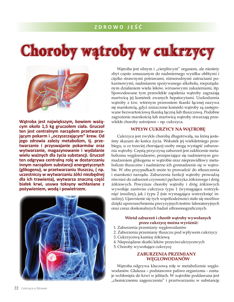 ZDROWO JEŚĆ Choroby wątroby w cukrzycy Wątroba jest największym, bowiem ważącym około 1,5 kg gruczołem ciała. Gruczoł ten jest centralnym narządem przetwarzającym pokarm i „oczyszczającym” krew. Od jego zdrowia zależy metabolizm, tj. przetwarzanie i przyswajanie pokarmów oraz wytwarzanie, magazynowanie i wydalanie wielu ważnych dla życia substancji. Gruczoł ten odgrywa centralną rolę w dostarczaniu innym narządom substancji energetycznych (glikogenu), w przetwarzaniu tłuszczu, ( np. uczestniczy w wytwarzaniu żółci niezbędnej dla ich trawienia), wytwarza znaczną część białek krwi, usuwa toksyny wchłaniane z pożywieniem, wodą i powietrzem. Wątroba jest silnym i „cierpliwym” organem, ale niestety zbyt często zmuszanym do nadmiernego wysiłku obfitymi i ciężko strawnymi potrawami, różnorodnymi zatruciami pokarmowymi, nadmiarem spożywanego alkoholu, niepożądanym działaniem wielu leków, wirusowymi zakażeniami, itp. Spowodowane tym przewlekłe zapalenia wątroby zagrażają martwicą jej komórek zwanych hepatocytami. Uszkodzenia wątroby z tzw. wtórnym przerostem tkanki łącznej nazywa się marskością, gdyż zniszczone komórki wątroby są zastępowane bezwartościową tkanką łączną lub tłuszczową. Podobne zagrożenie marskością lub martwicą wątroby stwarzają przewlekłe choroby ustrojowe – np. cukrzyca. WPŁYW CUKRZYCY NA WĄTROBĘ Cukrzyca jest zwykle chorobą długotrwałą, na którą jesteśmy skazani do końca życia. Wskutek jej wieloletniego przebiegu, u co trzeciej chorującej osoby mogą wystąpić zaburzenia wątroby. Częstą przyczyną zaburzeń jest zakłócenie metabolizmu węglowodanów, przejawiające się nadmiernym gromadzeniem glikogenu w wątrobie oraz nieprawidłowy metabolizm tłuszczów i nadmierne ich gromadzenie się w wątrobie. W obu przypadkach może to prowadzić do stłuszczenia i marskości narządu. Zaburzenia funkcji wątroby prowadzą również do zaburzeń czynności pęcherzyka żółciowego i dróg żółciowych. Powyższe choroby wątroby i dróg żółciowych wywołuje zarówno cukrzyca typu 1 (wymagająca wstrzyknięć insuliny), jak i typu 2 (nie wymagająca wstrzyknięć insuliny). Ujawnienie się tych współzależności stało się możliwe dzięki upowszechnieniu precyzyjnych testów laboratoryjnych oraz coraz doskonalszych badań ultrasonograficznych. Wśród zaburzeń i chorób wątroby wywołanych przez cukrzycę można wyróżnić: 1. Zaburzenia przemiany węglowodanów 2. Zaburzenia przemiany tłuszczu pod wpływem cukrzycy 3. Cukrzycową kamicę żółciową 4. Niepożądane skutki leków przeciwcukrzycowych 5. Choroby wywołujące cukrzycę ZABURZENIA PRZEMIANY WĘGLOWODANÓW Wątroba odgrywa kluczową rolę w metabolizmie węglowodanów. Glukoza – podstawowe paliwo organizmu - zostaje wchłonięta do krwi w jelitach. W wątrobie poddawana jest „chemicznemu zagęszczeniu” i przetwarzaniu w substancję 22 Cukrzyca a Zdrowie ZDROWO JEŚĆ zapasową, tzw. glikogen. Glikogen gromadzony jest w wątrobie jak w spichrzu, podobnie zresztą jak też częściowo w innych narządach. Gdy we krwi zaczyna brakować glukozy, jest bardzo szybko rozkładany, a wytworzona z niego glukoza jest uwalniana do krwi. Niestety, u osób chorych na cukrzycę może dochodzić do nieuzasadnionej nadprodukcji i gromadzenia się glikogenu w wątrobie, co prowadzi do zaburzeń chorobowych. Współistnienie zwyrodnienia jąder komórek wątrobowych pod wpływem glikogenu i późniejszego stłuszczenia tego organu uważa się za typowy obraz uszkodzenia wątroby w przebiegu cukrzycy. Dlaczego wątroba wytwarza i gromadzi zbyt dużo glikogenu? Czy stłuszczenie wątroby wskutek nadprodukcji glikogenu jest odwracalne? Obecnie uważa się, że jednym z powodów nadprodukcji glikogenu w wątrobie są duże wahania glukozy we krwi, co cechuje zwłaszcza źle kontrolowaną cukrzycę typu 1. Dowodzą tego eksperymenty na zwierzętach, w których udowodniono, że podanie insuliny w sytuacji jej dużego niedoboru wywołuje przedłużone, intensywne tworzenie się glikogenu w wątrobie, utrzymujące się aż do powrotu glikemii do pozycji wyjściowych, często o wysoce podwyższonych wartościach. Wydaje się, że podobnie wygląda to w organizmie człowieka. Czy dobra kontrola cukrzycy zapobiega nadprodukcji glikogenu? Dobra kontrola, prowadząca do pełnej normalizacji poziomu cukru może doprowadzić do cofnięcia się opisywanych zmian. Jednak dodatkowym czynnikiem wywołującym nadmierną kumulację glikogenu w wątrobie może być nadmiar pewnego hormonu - kortyzolu. W okresach złego leczenia, długotrwałe podawanie nadmiernej ilości insuliny stymuluje wydzielanie tego hormonu – ten zaś przyczynia się do nadmiernego wątrobowego gromadzenia glikogenu. Jaki wpływ ma nadmiaru glikogenu na wątrobę? Nadmiar glikogenu kumuluje się w jądrach komórek wątroby, zwanych hepatocytami, jak i w ich cytoplazmie. Pod wpływem intensywnego napływu glikogenu - jądra komórek wątrobowych ulegają stopniowemu zwyrodnieniu. Zjawisko to dotyczy około 75% przypadków cukrzycy obu typów (typu 1 i 2 ), ale może się ono pojawiać także u osób zdrowych w takich chorobach jak: hepatomegalia, gruźlica, niewydolność krążenia, zawał serca, nadczynność tarczycy, marskość i przewlekłe aktywne zapalenie wątroby, a także w ostrych chorobach zakaźnych (np. mononukleozie, odrze, błonicy, różyczce). Tak. Pomimo, że nadmierne gromadzenie się glikogenu w wątrobie u dorosłych osób, ze źle leczoną (bądź nieleczoną) cukrzycą występuje aż w blisko 80% przypadków choroby, to zjawisko to szybko się cofa pod warunkiem podjęcia prawidłowego leczenia i właściwego wyrównania metabolicznego cukrzycy. Wówczas stłuszczenie wywołane nadprodukcją glikogenu nie prowadzi do zapalenia ani marskości narządu. ZABURZENIA PRZEMIANY TŁUSZCZU PO WPŁYWEM CUKRZYCY Wątroba odgrywa bardzo ważną r