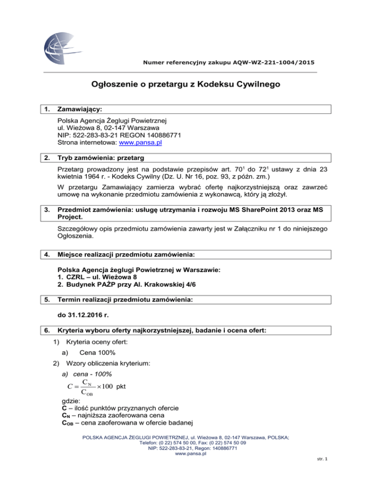 Numer referencyjny zakupu AQW-WZ-221-1004/2015 Ogłoszenie o przetargu z Kodeksu Cywilnego 1. Zamawiający: Polska Agencja Żeglugi Powietrznej ul. Wieżowa 8, 02-147 Warszawa NIP: 522-283-83-21 REGON 140886771 Strona internetowa: www.pansa.pl 2. Tryb zamówienia: przetarg Przetarg prowadzony jest na podstawie przepisów art. 701 do 721 ustawy z dnia 23 kwietnia 1964 r. - Kodeks Cywilny (Dz. U. Nr 16, poz. 93, z późn. zm.) W przetargu Zamawiający zamierza wybrać ofertę najkorzystniejszą oraz zawrzeć umowę na wykonanie przedmiotu zamówienia z wykonawcą, który ją złożył. 3. Przedmiot zamówienia: usługę utrzymania i rozwoju MS SharePoint 2013 oraz MS Project. Szczegółowy opis przedmiotu zamówienia zawarty jest w Załączniku nr 1 do niniejszego Ogłoszenia. 4. Miejsce realizacji przedmiotu zamówienia: Polska Agencja żeglugi Powietrznej w Warszawie: 1. CZRL – ul. Wieżowa 8 2. Budynek PAŻP przy Al. Krakowskiej 4/6 5. Termin realizacji przedmiotu zamówienia: do 31.12.2016 r. 6. Kryteria wyboru oferty najkorzystniejszej, badanie i ocena ofert: 1) Kryteria oceny ofert: a) 2) Cena 100% Wzory obliczenia kryterium: a) cena - 100% C CN 100 pkt C OB gdzie: C – ilość punktów przyznanych ofercie CN – najniższa zaoferowana cena COB – cena zaoferowana w ofercie badanej POLSKA AGENCJA ŻEGLUGI POWIETRZNEJ, ul. Wieżowa 8, 02-147 Warszawa, POLSKA; Telefon: (0 22) 574 50 00, Fax: (0 22) 574 50 09 NIP: 522-283-83-21, Regon: 140886771 www.pansa.pl str. 1 Numer referencyjny zakupu AQW-WZ-221-1004/2015 Maksymalna łączna liczba punktów jaką może uzyskać oferta wynosi – 100 pkt. Zamawiający wybierze jako ofertę najkorzystniejszą ofertę, która spełnia wszystkie wymagania formalno – prawne i uzyska najwyższą ilość punktów w ocenie dokonanej w oparciu o kryteria oceny ofert wskazane w pkt. 1. 3) Zamawiający odrzuca ofertę jeżeli oferta została złożona po wyznaczonym terminie lub/i w niewłaściwym miejscu. 4) Zamawiający może odrzucić ofertę, jeżeli: 5) 7. a) jest niezgodna z wymaganiami niniejszego przetargu, b) będzie niekompletna lub nie będzie zawierała wszystkich wymaganych przez Zamawiającego dokumentów lub oświadczeń, Zamawiający może wezwać wykonawcę, którego oferta jest najkorzystniejsza i który w terminie nie złożył wymaganych niniejszym ogłoszeniem oświadczeń lub dokumentów lub który nie złożył pełnomocnictw, albo który złożył wymagane oświadczenia i dokumenty zawierające błędy lub który złożył wadliwe pełnomocnictwa, do ich złożenia w wyznaczonym terminie, chyba że mimo ich złożenia oferta wykonawcy podlega odrzuceniu albo konieczne byłoby unieważnienie przetargu lub jego odwołania albo jego zamknięcia bez dokonania wyboru oferty. Termin związania ofertą: 1) Wykonawca związany jest ofertą przez okres nie krótszy niż 30 dni licząc od dnia, w którym upływa termin składania ofert. 2) Wykonawca samodzielnie lub na wniosek Zamawiającego może przedłużyć termin związania ofertą. 8. Opis sposobu przygotowania oferty: 1) Oferta musi być sporządzona w języku polskim. 2) Zamawiający nie dopuszcza składania ofert częściowych lub wariantowych. 3) Oferta musi być złożona w formie pisemnej lub elektronicznej. W przypadku złożenia oferty w formie elektronicznej Wykonawca, którego oferta zostanie wybrana jako najkorzystniejsza, zobowiązany będzie do przedłożenia Zamawiającemu oferty w formie pisemnej w terminie 7 dni od daty powiadomienia o wyborze jego oferty. 4) Oferta musi być podpisana przez osoby upoważnione do reprezentowania wykonawcy. 5) Oferta musi odpowiadać wymogom formalnym wskazanym w ogłoszeniu o przetargu. 9. 1) Termin oraz miejsce składania i otwarcia ofert: Ofertę należy złożyć w formie pisemnej lub elektronicznej do dnia 10.02.2016 r. do godz. 15.00 POLSKA AGENCJA ŻEGLUGI POWIETRZNEJ, ul. Wieżowa 8, 02-147 Warszawa, POLSKA; Telefon: (0 22) 574 50 00, Fax: (0 22) 574 50 09 NIP: 522-283-83-21, Regon: 140886771 www.pansa.pl str. 2 Numer referencyjny zakupu AQW-WZ-221-1004/2015 2) Ofertę pisemną należy złożyć w Budynku Polskiej Agencji Żeglugi Powietrznej, ul. Gałczyńskiego 2 a - Kancelaria. Z dopiskiem: Oferta na usługę utrzymania i rozwoju MS SharePoint 2013 oraz MS Project. 3) Za datę złożenia oferty pisemnej uważa się datę wpływu oferty do Zamawiającego potwierdzoną przez pracownika Zamawiającego. 4) Ofertę przesłaną elektronicznie należy przesłać na adres e-mail: [email protected]. Za datę złożenia oferty przesłanej elektronicznie uważa się moment wpływu e-mail z ofertą do sieci informatycznej Zamawiającego. 5) Zamawiający dopuszcza wydłużenie terminu składania ofert. Informacja w powyższym zakresie zostanie niezwłocznie opublikowana w miejscu publikacji ogłoszenia o przetargu. 10. Wymagania wobec Wykonawców 1. Dobra znajomość systemów operacyjnych firmy Microsoft; 2. Dobra znajomość instalacji i konfiguracji systemów Microsoft Project Serwer 2013 w tym PWA, baz danych, a w szczególności Microsoft SQL DataBase, Microsoft SharePoint 2013; 3. Przynajmniej 2 letnie doświadczenie w administracji i konfiguracji systemów Microsoft Project Server i Microsoft SharePoint Serwer; 4. Potwierdzone referencjami usługi wykonane lub wykonywane w zakresie administrowania, utrzymania i rozwoju systematów: Microsoft Project Server i Microsoft SharePoint Serwer; 5. Osoby, które bedą uczestniczyły w realizacji umowy bedą posiadały Certyfikat MCDBA (Microsoft Certified Database Administrator) oraz Microsoft Certified Solutions Developer (MCSD); 11. Sposób porozumiewania się z wykonawcami 1) Osobą wyznaczoną do kontaktów z wykonawcami jest: w zakresie merytorycznym: Mariusz Surdy tel. nr: 22 574 67 15 adres e-mail: [email protected] w zakresie handlowym: Grażyna Jakubik tel. nr: 22 574 52 05 adres e-mail: [email protected] 2) W przetargu wnioski, zawiadomienia oraz informacje Zamawiający i wykona