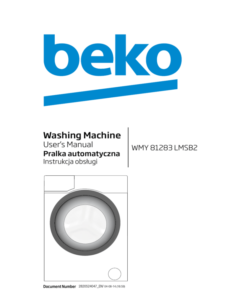 Washing Machine User’s Manual Pralka automatyczna Instrukcja obsługi Document Number 2820524047_EN/ 04-08-14.(16:59) WMY 81283 LMSB2 This product was manufactured using the latest technology in environmentally friendly conditions. 1 General safety instructions This section includes security instructions which may help prevent the injuries and material damage risks. All kinds of warranties shall be invalid if these instructions are not observed. 1.1 Life and property safety u Never place the product on a carpet-covered floor. Electrical parts will get overheated since air cannot circulate from under the device. This will cause problems with your product. u Unplug the product if it is not in use. uAlways have the installation and repairing procedures carried out by the Authorized Service Agent. Manufacturer shall not be held liable for damages that may arise from procedures carried out by unauthorized persons. u The water supply and draining hoses must be securely fastened and remain undamaged. Otherwise, water leak may occur. u While there is still water inside the product, never open the loading door or remove the filter. Otherwise, risk of flooding and injury from hot water will occur. uDo not force open the locked loading door. Door can be opened a few minutes after the washing cycle ends. In case of forcing the loading door to open, the door and the lock mechanism may get damaged. u Use detergents, softeners and supplements suitable for automatic washing machines only. u Follow the instructions on the label of textiles and the detergent package. 1.2 Children's safety u This product can be used by the children who are at the age of 8 and over and the people whose physical, sensory or mental skills are not fully developed or who do not have necessary required experience and knowledge as long as they are supervised or trained about the safe use of the product and its risks. Children should not play with the device. Cleaning and maintenance works should not be performed by children unless they are supervised by someone. uPackaging materials may be dangerous for the children. Keep packaging materials in a safe place away from reach of the children. u Electrical products are dangerous for the children. Keep the children away from the product when it is in use. Do not allow them to play with the product. Use child lock to prevent children from intervening with the product. u Do not forget to close the loading door when leaving the room where the product is located. 3 / EN Washing Machine / User’s Manual u store all detergents and additives in a safe place away from the reach of the children by closing the cover of the detergent container or sealing the detergent package. 1.3 Electrical safety u If the product has a failure, it should not be operated unless it is repaired by the Authorized Service Agent. Risk of electric shock! product is designed to resume operating in the event of powering on after a power interruption. If you wish to cancel the programme, see "Cancelling the programme" section. u Plug the product into a grounded outlet protected by a 16 A fuse. Do not neglect to have the grounding installation made by a qualified electrician. Our company shall not be liable for any damages that will arise when the product is used without grounding in accordance with the local regulations. u Do not wash the product by spraying or pouring water onto it! Risk of electric shock! u Never touch the power cable plug with wet hands! Do not grab the power cord to unplug the machine, always unplug it by holding the socket with one hand, and pulling the plug with the other hand. uProduct should be unplugged during installation, maintenance, cleaning and repair procedures. uIf the power cable is damaged, it must be replaced by the manufacturer, after sales service or a similarly qualified person (preferably an electrician) or someone designated by the importer in order to avoid possible risks. uThis 1.4 Hot surface safety While washing the laundry at high temperatures, the loading door glass will get hot. Considering this fact, during washing operation keep the children away from the loading door of the product to prevent them touching it. 4 / EN Washing Machine / User’s Manual 2 Important instructions for environment 2.1 Compliance with WEEE Directive This product complies with EU WEEE Directive (2012/19/EU). This product bears a classification symbol for waste electrical and electronic equipment (WEEE). This product has been manufactured with high quality parts and materials which can be reused and are suitable for recycling. Do not dispose of the waste product with normal domestic and other wastes at the end of its service life. Take it to the collection center for the recycling of electrical and electronic equipment. Please consult your local authorities to learn about these collection centers. Compliance with RoHS Directive: The product you have purchased complies with EU RoHS Directive (2011/65/EU). It does not contain harmful and prohibited materials specified in the Directive. 2.2 Package information Packaging materials of the product are manufactured from recyclable materials in accordance with our National Environment Regulations. Do not dispose of the packaging materials together with the domestic or other wastes. Take them to the packaging material collection points designated by the local authorities. 3 Intended use • This product has been designed for domestic use. It is not for commercial purposes or it should not be used out of its intended use. • The product must only be used for washing and rinsing of laundry that are marked accordingly. • The manufacturer waives any responsibility arisen from incorrect usage or transportation. • The service life of your product is 10 years. During this period, original spare parts will be available to operate the appliance properly. 5 / EN Washing Machine / User’s Manual 4 Technical specifications Complying Commission Delegated Regu