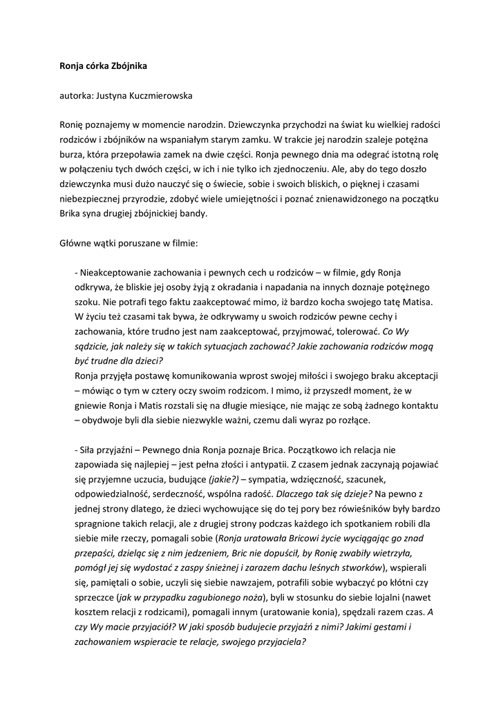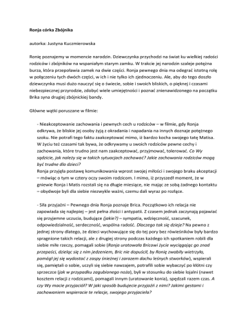 Ronja córka Zbójnika autorka: Justyna Kuczmierowska Ronię poznajemy w momencie narodzin. Dziewczynka przychodzi na świat ku wielkiej radości rodziców i zbójników na wspaniałym starym zamku. W trakcie jej narodzin szaleje potężna burza, która przepoławia zamek na dwie części. Ronja pewnego dnia ma odegrać istotną rolę w połączeniu tych dwóch części, w ich i nie tylko ich zjednoczeniu. Ale, aby do tego doszło dziewczynka musi dużo nauczyć się o świecie, sobie i swoich bliskich, o pięknej i czasami niebezpiecznej przyrodzie, zdobyć wiele umiejętności i poznać znienawidzonego na początku Brika syna drugiej zbójnickiej bandy. Główne wątki poruszane w filmie: - Nieakceptowanie zachowania i pewnych cech u rodziców – w filmie, gdy Ronja odkrywa, że bliskie jej osoby żyją z okradania i napadania na innych doznaje potężnego szoku. Nie potrafi tego faktu zaakceptować mimo, iż bardzo kocha swojego tatę Matisa. W życiu też czasami tak bywa, że odkrywamy u swoich rodziców pewne cechy i zachowania, które trudno jest nam zaakceptować, przyjmować, tolerować. Co Wy sądzicie, jak należy się w takich sytuacjach zachować? Jakie zachowania rodziców mogą być trudne dla dzieci? Ronja przyjęła postawę komunikowania wprost swojej miłości i swojego braku akceptacji – mówiąc o tym w cztery oczy swoim rodzicom. I mimo, iż przyszedł moment, że w gniewie Ronja i Matis rozstali się na długie miesiące, nie mając ze sobą żadnego kontaktu – obydwoje byli dla siebie niezwykle ważni, czemu dali wyraz po rozłące. - Siła przyjaźni – Pewnego dnia Ronja poznaje Brica. Początkowo ich relacja nie zapowiada się najlepiej – jest pełna złości i antypatii. Z czasem jednak zaczynają pojawiać się przyjemne uczucia, budujące (jakie?) – sympatia, wdzięczność, szacunek, odpowiedzialność, serdeczność, wspólna radość. Dlaczego tak się dzieje? Na pewno z jednej strony dlatego, że dzieci wychowujące się do tej pory bez rówieśników były bardzo spragnione takich relacji, ale z drugiej strony podczas każdego ich spotkaniem robili dla siebie miłe rzeczy, pomagali sobie (Ronja uratowała Bricowi życie wyciągając go znad przepaści, dzieląc się z nim jedzeniem, Bric nie dopuścił, by Ronię zwabiły wietrzyła, pomógł jej się wydostać z zaspy śnieżnej i zarazem dachu leśnych stworków), wspierali się, pamiętali o sobie, uczyli się siebie nawzajem, potrafili sobie wybaczyć po kłótni czy sprzeczce (jak w przypadku zagubionego noża), byli w stosunku do siebie lojalni (nawet kosztem relacji z rodzicami), pomagali innym (uratowanie konia), spędzali razem czas. A czy Wy macie przyjaciół? W jaki sposób budujecie przyjaźń z nimi? Jakimi gestami i zachowaniem wspieracie te relacje, swojego przyjaciela? Przyjaźń niesie w sobie olbrzymią moc, jest wielką wartością, czymś w co warto inwestować (Dlaczego? Czy się zgadzacie?). Przyjaźń potrafi nawet, jak w filmie Ronja córka zbójnika połączyć dwie rozdzielone części zamku i zjednoczyć zwaśnione bandy zbójnickie. A co Wam dają Wasze przyjaźnie? - Wzrastanie w czasach zbójnickich – ciekawe jest zobaczyć, jak kiedyś ludzie żyli, gdy nie było telewizorów, telefonów tabletów, sklepów, w których można było wszystko kupić. Co wtedy było dla nich radością? Jak spędzali czas? - Silne strony dziewczynki i chłopca – każdy z nas ma swoje silne strony, co było mocną stroną Roni a co Bricka, co wam się w nich podobało? Literatura polecana: - "Król Maciuś Pierwszy" Janusz Korczak
