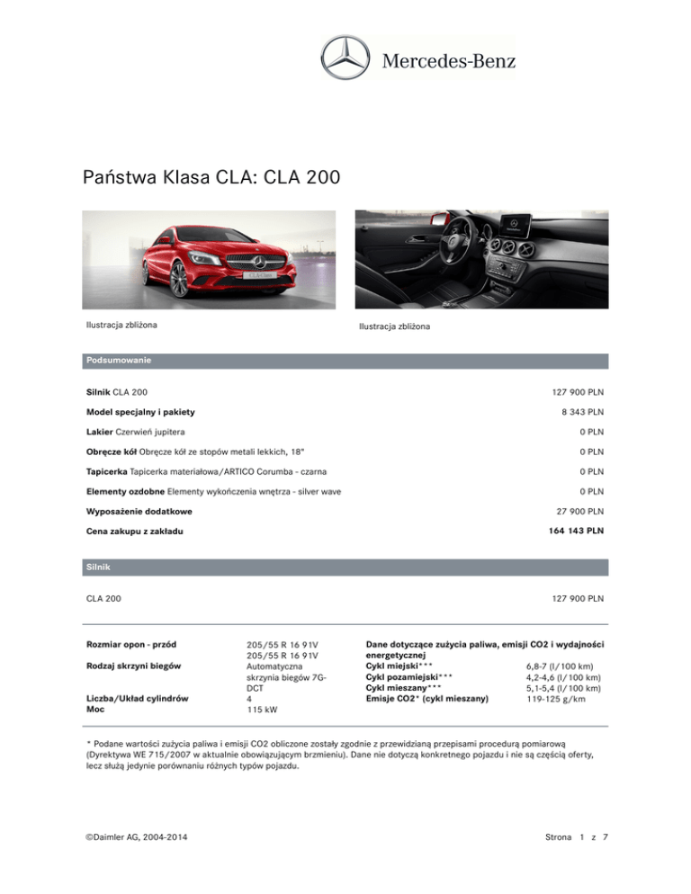 Państwa Klasa CLA: CLA 200 Ilustracja zbliżona Ilustracja zbliżona Podsumowanie Silnik CLA 200 127 900 PLN Model specjalny i pakiety 8 343 PLN Lakier Czerwień jupitera 0 PLN Obręcze kół Obręcze kół ze stopów metali lekkich, 18" 0 PLN Tapicerka Tapicerka materiałowa/ARTICO Corumba - czarna 0 PLN Elementy ozdobne Elementy wykończenia wnętrza - silver wave 0 PLN Wyposażenie dodatkowe 27 900 PLN 164 143 PLN Cena zakupu z zakładu Silnik CLA 200 127 900 PLN Rozmiar opon - przód Rodzaj skrzyni biegów Liczba/Układ cylindrów Moc 205/55 R 16 91V 205/55 R 16 91V Automatyczna skrzynia biegów 7GDCT 4 115 kW Dane dotyczące zużycia paliwa, emisji CO2 i wydajności energetycznej Cykl miejski*** 6,8-7 (l/100 km) Cykl pozamiejski*** 4,2-4,6 (l/100 km) Cykl mieszany*** 5,1-5,4 (l/100 km) Emisje CO2* (cykl mieszany) 119-125 g/km * Podane wartości zużycia paliwa i emisji CO2 obliczone zostały zgodnie z przewidzianą przepisami procedurą pomiarową (Dyrektywa WE 715/2007 w aktualnie obowiązującym brzmieniu). Dane nie dotyczą konkretnego pojazdu i nie są częścią oferty, lecz służą jedynie porównaniu różnych typów pojazdu. ©Daimler AG, 2004-2014 Strona 1 z 7 Państwa Klasa CLA: CLA 200 Model specjalny i pakiety Pakiet komfortowych siedzeń 0 PLN Pakiet zabezpieczenia pojazdu 0 PLN Pakiet wizualny i oświetleniowy 1 865 PLN Pakiet Urban 6 478 PLN Lakiery i obręcze kół Lakier Czerwień jupitera (LU_589) 0 PLN Obręcze kół Obręcze kół ze stopów metali lekkich, 18" (66R) 0 PLN Tapicerka i elementy ozdobne Tapicerka Tapicerka materiałowa/ARTICO Corumba - czarna (AU_361) 0 PLN Elementy ozdobne Elementy wykończenia wnętrza - silver wave (H50) 0 PLN ©Daimler AG, 2004-2014 Strona 2 z 7 Państwa Klasa CLA: CLA 200 Wyposażenie dodatkowe Aktywny asystent parkowania (SA_235) 3 313 PLN Audio 20 (SA_522) 1 472 PLN Automatyczna skrzynia biegów 7G-DCT (GC_429) 8 932 PLN Ciśnieniowe spryskiwacze reflektorów (SA_600) Dywaniki welurowe (SA_U12) 0 PLN Manetki zmiany biegów przy kierownicy (SA_428) 0 PLN Oświetlenie lusterka w przesłonach słonecznych (SA_543) 0 PLN Podłokietnik kanapy tylnej (SA_400) 393 PLN Kierownica pokryta skórą (SA_280) Podgrzewane fotele przednie (SA_873) 0 PLN Podświetlane listwy progowe (SA_U25) 1 423 PLN 810 PLN 0 PLN ©Daimler AG, 2004-2014 Strona 3 z 7 Państwa Klasa CLA: CLA 200 Wyposażenie dodatkowe Przyciemniane szyby z funkcją termoizolacji (SA_840) 1 227 PLN Reflektory bi-ksenonowe (SA_614) 4 147 PLN System nawigacji - urządzenie dodatkowe (SA_357) 3 681 PLN Tempomat (SA_440) THERMOTRONIC - klimatyzacja automatyczna (SA_581) 0 PLN 2 503 PLN Wycieraczka przedniej szyby sterowana czujnikiem deszczu (SA_345) 0 PLN Zmieniarka płyt CD w bagażniku (SA_818) 0 PLN Wyposażenie standardowe Bezpieczeństwo i technika Apteczka ABS System aktywnego serwisowania pojazdu - Assyst Centralny zamek z blokadą od wewnątrz Mocowanie ładunku w przestrzeni bagażowej ADAPTIVE BRAKE z funkcją HOLD CPA – system zapobiegający kolizjom z automatycznym hamulcem Kurtyny powietrzne (WINDOWBAG) Poduksza powietrzna kierowcy i pasażera Boczne poduszki dla kierowcy i pasażera Poduszka powietrzna chroniąca kolana Układ antypoślizgowy (ASR) ESP System monitorowania ciśnienia w oponach Wskaźnik zużycia klocków hamulcowych Zamki tylnych drzwi z zabezpieczeniem przed otwarciem przez dzieci Immobilizer elektroniczny Alarm antywłamaniowy (EDW) ©Daimler AG, 2004-2014 Strona 4 z 7 Państwa Klasa CLA: CLA 200 Wyposażenie standardowe Trójkąt ostrzegawczy Gaśnica z mocowaniem System wspomagający gwałtowne hamowanie (BAS) 4 hamulce tarczowe; przednie wentylowane Tylne światła przeciwmgłowe Zabezpieczenie wnętrza pojazdu 3. światło stop w technologii LED Automat. oświetlenie powypadkowe Wskaźnik awarii żarówek Asystent świateł przednich Sygnał ostrzeg. przy zaciągniętym hamulcu ręcznym Hamulec postojowy elektr. Pokrętło kontrolera do sterowania telematyką Wnętrze Schowki w drzwiach Elektrycznie sterowane szyby Schowek pod podłogą bagażnika 3-pkt. pasy bezpieczeństwa Zestaw wskaźników w ozdobnych tubach Wskaźniki ostrzegawcze poziomu płynów Mocowanie ładunku w przestrzeni bagażowej Kluczyk z elementami chromowanymi Wskaźnik temperatury zewnętrznej Schowek w przednim podłokietniku Podłokietnik pomiędzy przednimi fotelami Podsufitka materiałowa - szara Schowek w konsoli centralnej Komputer pokładowy Zagłówki dla pasażerów tylnej kanapy Rozpoznawanie obecności na fotelu pasażera Manulana regulacje fotela kierowcy oraz pasażera Mocowanie fotelika dziecięcego z tyłu - ISOFIX Folding rear seat backrests split-folding Pakiety wyposażeniowe Pakiet Chrom Pakiet dla niepalących wraz z gniazdem 12V Zewnątrz Stalowe listwy progowe Kierunkowskazy w obudowach lusterek zewn. Klamki w kolorze nadwozia Lampy przednie ©Daimler AG, 2004-2014 Strona 5 z 7 Państwa Klasa CLA: CLA 200 Wyposażenie standardowe Beltline trim with chrome-look finish Tylne światła w technologii LED Asystent świateł przednich Lusterka zewnętrzne podgrzewane i elek. regulowane Kierunkowskazy z funkcją zmiany pasa Szyby izotermiczne Klejona szyba przednia Ogrzewanie szyby tylnej z przełącznikiem czasowym Tylne światła przeciwmgłowe Ochrona pieszych - aktywna maska Układ kierowniczy i mechanizm Mechaniczna regulacja kierownicy w pionie Bezpośrednie przełożenie układu kierowniczego Wielofunkcyjna kierownica Wskaźnik optymalnej zmiany biegów Radio i komunikacja 6 głośników Moduł Mercedes-Benz connect me Telefon bezpieczeństwa Mercedes-Benz ATTENTION ASSIST – system wspomagający koncentrację Koła i zawieszenie Zawieszenie komfortowe Kod sterujący Norma czystości spalin EU6 Wskazówki prawne Mimo najwyższej staranności, z jaką opracowano treści zawarte w niniejszym programie konfiguracyjnym, spółka MercedesBenz Polska nie ponosi odpowiedzialności za błędy w danych i cenach. Informacje dotyczące wyposażenia standa