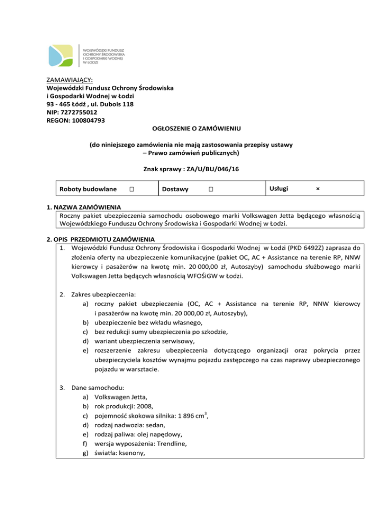 ZAMAWIAJĄCY: Wojewódzki Fundusz Ochrony Środowiska i Gospodarki Wodnej w Łodzi 93 - 465 Łódź , ul. Dubois 118 NIP: 7272755012 REGON: 100804793 OGŁOSZENIE O ZAMÓWIENIU (do niniejszego zamówienia nie mają zastosowania przepisy ustawy – Prawo zamówień publicznych) Znak sprawy : ZA/U/BU/046/16 Roboty budowlane Dostawy Usługi × 1. NAZWA ZAMÓWIENIA Roczny pakiet ubezpieczenia samochodu osobowego marki Volkswagen Jetta będącego własnością Wojewódzkiego Funduszu Ochrony Środowiska i Gospodarki Wodnej w Łodzi. 2. OPIS PRZEDMIOTU ZAMÓWIENIA 1. Wojewódzki Fundusz Ochrony Środowiska i Gospodarki Wodnej w Łodzi (PKD 6492Z) zaprasza do złożenia oferty na ubezpieczenie komunikacyjne (pakiet OC, AC + Assistance na terenie RP, NNW kierowcy i pasażerów na kwotę min. 20 000,00 zł, Autoszyby) samochodu służbowego marki Volkswagen Jetta będących własnością WFOŚiGW w Łodzi. 2. Zakres ubezpieczenia: a) roczny pakiet ubezpieczenia (OC, AC + Assistance na terenie RP, NNW kierowcy i pasażerów na kwotę min. 20 000,00 zł, Autoszyby), b) ubezpieczenie bez wkładu własnego, c) bez redukcji sumy ubezpieczenia po szkodzie, d) wariant ubezpieczenia serwisowy, e) rozszerzenie zakresu ubezpieczenia dotyczącego organizacji oraz pokrycia przez ubezpieczyciela kosztów wynajmu pojazdu zastępczego na czas naprawy ubezpieczonego pojazdu w warsztacie. 3. Dane samochodu: a) Volkswagen Jetta, b) rok produkcji: 2008, c) pojemność skokowa silnika: 1 896 cm3, d) rodzaj nadwozia: sedan, e) rodzaj paliwa: olej napędowy, f) wersja wyposażenia: Trendline, g) światła: ksenony, h) i) j) k) l) moc: 77,00 kW, numer rejestracyjny: EL 911FR, ilość drzwi: 4, przebieg samochodu na dzień 18.11.2016 r: 283 660 km, aktualne ubezpieczenie: od 09.12.2015 r do 08.12.2016 r. 4. Wojewódzki Fundusz Ochrony Środowiska i Gospodarki Wodnej w Łodzi jest właścicielem pięciu samochodów osobowych. 5. Każdy Wykonawca (agent ubezpieczeniowy) może złożyć tylko jedną ofertę. Złożenie większej liczby ofert skutkowało będzie odrzuceniem wszystkich ofert złożonych przez Wykonawcę (agenta ubezpieczeniowego). 3. INFORMACJA DOTYCZĄCA WSPÓŁFINANSOWANIA ZE ŚRODKÓW PROGRAMU OPERACYJNEGO INFRASTRUKTURA I ŚRODOWISKO zamówienie jest współfinansowane ze środków POIiŚ X zamówienie nie jest współfinansowane ze środków POIiŚ 4. OSOBA/OSOBY UPOWAŻNIONE DO KONTAKTÓW W sprawach: a. formalno – prawnych Łukasz Olesiński, tel. 42 207 14 82, e – mail: [email protected] b. merytorycznych Pan Piotr Kroc, tel. 42 207 14 87, e – mail: [email protected] 5. CZAS TRWANIA ZAMÓWIENIA lub TERMIN WYKONANIA ZAMÓWIENIA: Okres ubezpieczenia: od 09.12.2016 roku do 08.12.2017 roku 6. WARUNKI UDZIAŁU W POSTĘPOWANIU ORAZ OPIS SPOSOBU DOKONYWANIA OCENY SPEŁNIANIA TYCH WARUNKÓW (jeżeli dotyczy): NIE DOTYCZY 7.INFORMACJE O OŚWIADCZENIACH I/LUB DOKUMENTACH JAKIE MAJĄ DOSTARCZYĆ WYKONAWCY (jeżeli dotyczy) : 1. Złożona oferta musi zawierać cenę za ubezpieczenie samochodu, sumę ubezpieczenia samochodu brutto, ogólne warunki ubezpieczenia oraz wszelkie inne dokumenty związane z ubezpieczeniem. 2. Na żądanie Zamawiającego Wykonawca winien przesłać także inne informacje w zakresie złożonej oferty. 8. MIEJSCE I TERMIN SKŁADANIA OFERT: Oferty należy składać w formie elektronicznej (skan podpisanej oferty) na adres (e-mai): [email protected] w terminie do 24.11.2016 r. do godz. 15:00. 9. WYBÓR OFERTY : Zawiadomienie o wyborze oferty najkorzystniejszej zostanie przesłane w formie elektronicznej (e-mail) do Wykonawców biorących udział w postępowaniu o udzielenie zamówienia. 10.INFORMACJE DODATKOWE Cenę oferty stanowi kwota wynikająca z wyliczeń kwoty ubezpieczenia wraz z ew. rabatami/opustami i obejmować musi cały zakres ubezpieczenia wskazanego w ogłoszeniu o zamówieniu. 11. ZAMAWIAJĄCY ZASTRZEGA SOBIE PRAWO DO UNIEWAŻNIENIA NINIJSZEGO ZAMÓWIENIA BEZ PODAWANIA PRZYCZYN W CAŁOŚCI LU CZĘŚCI. ZAŁĄCZNIKI: 1) skan dowodu rejestracyjnego samochodu marki Volkswagen Jetta, 2) wykaz wyposażenia dodatkowego samochodu marki Volkswagen Jetta.
