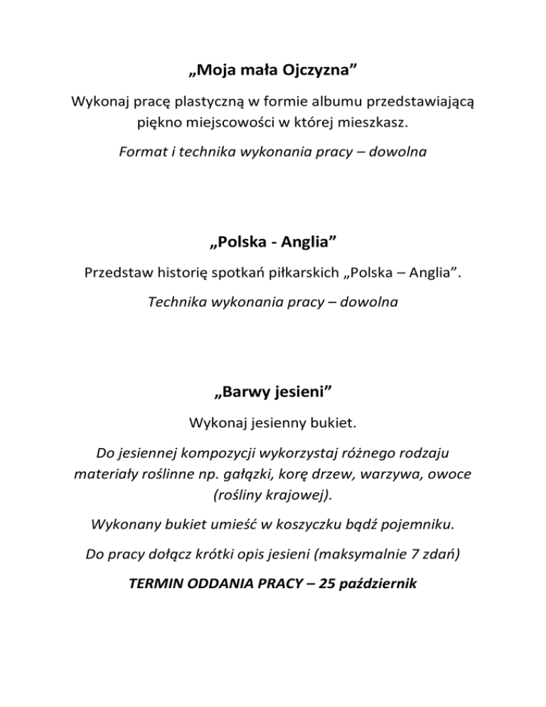 „Moja mała Ojczyzna” Wykonaj pracę plastyczną w formie albumu przedstawiającą piękno miejscowości w której mieszkasz. Format i technika wykonania pracy – dowolna „Polska - Anglia” Przedstaw historię spotkań piłkarskich „Polska – Anglia”. Technika wykonania pracy – dowolna „Barwy jesieni” Wykonaj jesienny bukiet. Do jesiennej kompozycji wykorzystaj różnego rodzaju materiały roślinne np. gałązki, korę drzew, warzywa, owoce (rośliny krajowej). Wykonany bukiet umieść w koszyczku bądź pojemniku. Do pracy dołącz krótki opis jesieni (maksymalnie 7 zdań) TERMIN ODDANIA PRACY – 25 październik „Polska - Anglia” Przedstaw historię spotkań piłkarskich „Polska – Anglia”. Technika wykonania pracy – dowolna „Wybitni matematycy starożytności” Wykonaj album, gazetkę lub prezentację multimedialną. „Wiara mnie uskrzydla” Wykonaj pracę plastyczną na powyższy temat. Praca może być wykonana w formie rysunku (węglem, kredką itp.) lub obrazu (akwarelą, farbą olejną itp.) Format pracy nie może przekraczać wielkości formatu A3. „My free time” - wypracowanie Wykonaj pracę pisemną na jednej stronie kartki A4. Praca powinna: zawierać zdjęcie bądź rysunek być napisana samodzielnie (własnymi słowami) Niedozwolone jest przepisywanie pracy z Internetu lub innych źródeł. We wstępie pracy powinny się znaleźć następujące informacje: imię autora, wiek i miejsce zamieszkania. W dalszej części powinien znaleźć się opis sposobów spędzania wolnego czasu z uwzględnieniem konkretnych dni, pór dnia i godzin. Od strony gramatycznej praca powinna być pisana w czasie Present Simple (z wyjątkiem, kiedy opisujemy zdjęcie lub rysunek – wtedy używamy czasu Present Continuous). Ocenie będzie podlegała ogólna estetyka pracy oraz poprawność językowa „Animowany gif” Przygotuj animowanego gifa (plik graficzny w formacie gif), w którym w postaci dowolnej animacji przedstawisz swoje nazwisko i imię. W tym celu wyszukaj w sieci Internet odpowiednie informacje (jak tworzyć animowane gify), pobierz darmowe oprogramowanie. Przygotowany plik prześlij jako załącznik na adres: [email protected]. Ocenie podlegać będą poprawność, płynność oraz atrakcyjność animacji. „Miejsca Pamięci Narodowej w naszej gminie” Forma pracy dowolna – plakat, album, prezentacja multimedialna