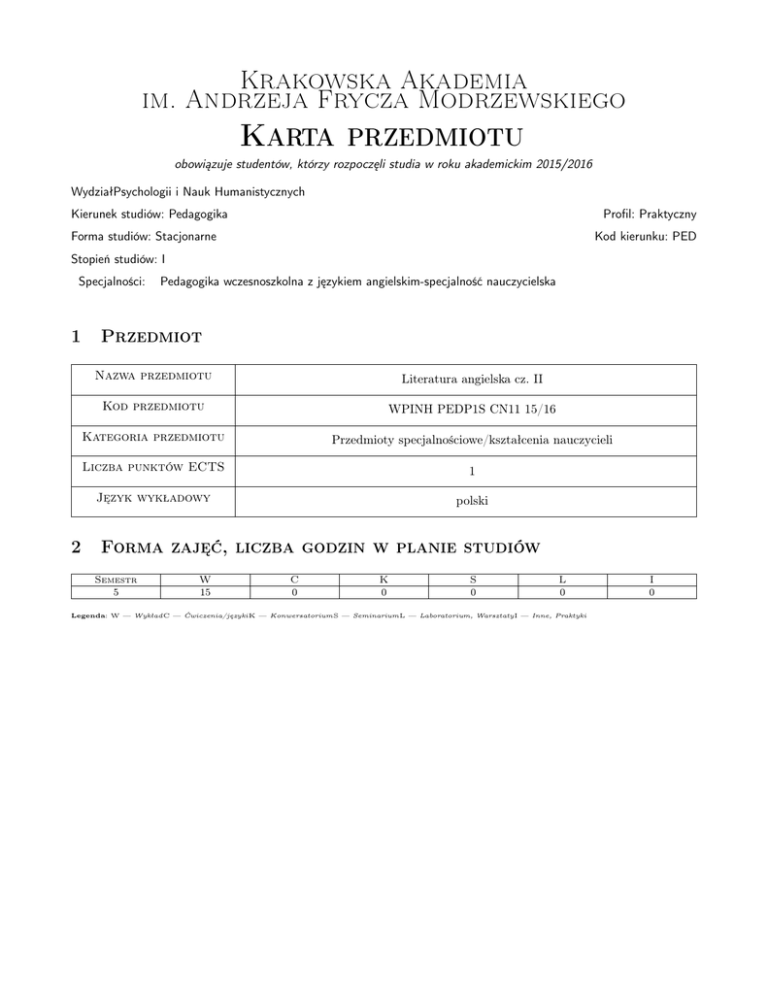 Krakowska Akademia im. Andrzeja Frycza Modrzewskiego Karta przedmiotu obowiązuje studentów, którzy rozpoczęli studia w roku akademickim 2015/2016 WydziałPsychologii i Nauk Humanistycznych Kierunek studiów: Pedagogika Profil: Praktyczny Forma studiów: Stacjonarne Kod kierunku: PED Stopień studiów: I Specjalności: 1 2 Pedagogika wczesnoszkolna z językiem angielskim-specjalność nauczycielska Przedmiot Nazwa przedmiotu Literatura angielska cz. II Kod przedmiotu WPINH PEDP1S CN11 15/16 Kategoria przedmiotu Przedmioty specjalnościowe/kształcenia nauczycieli Liczba punktów ECTS 1 Język wykładowy polski Forma zajęć, liczba godzin w planie studiów Semestr 5 W 15 C 0 K 0 S 0 L 0 Legenda: W — WykładC — Ćwiczenia/językiK — KonwersatoriumS — SeminariumL — Laboratorium, WarsztatyI — Inne, Praktyki I 0 Krakowska Akademia im. Andrzeja Frycza Modrzewskiego 3 Cele przedmiotu Cel 1 Zapoznanie studentów z literaturą angielską XVIII-XIX wieku na tle szerokiego kontekstu historyczno, historii idei i przemian społeczno-cywilizacyjnego. Cel 2 Przekazanie studentom podstawowej wiedzy faktograficznej o literaturze angielskiej XVIII-XIX wieku; wyrobienie umiejętności interpretacji wybranych tekstów literackich z uwzględnieniem tła historyczno-kulturowego. 4 Wymagania wstępne 1 Pożądana znajomość języka angielskiego na poziomie B. 5 Modułowe efekty kształcenia MW1 Student ma podstawowa wiedze z zakresu literatury angielskiej XVIII-XIX wieku oraz potrafi rozpoznać i sklasyfikować najważniejsze formy wypowiedzi literackich. MU2 Student potrafi odczytać ze zrozumieniem i przeanalizować konkretny tekst, a zwłaszcza wyodrębnić i objaśnić te elementy treści, stylu, języka, które wskazują na jego miejsce w historii literatury. MK3 Student rozumie że przy pogłębianiu znajomości języka i kultury angielskiej nieodzowna jest pewne oczytanie i orientacja również w zakresie literatury dawniejszej. 6 Treści programowe Strona 2/5 Krakowska Akademia im. Andrzeja Frycza Modrzewskiego Lp W1 7 Wykład Tematyka zajęć Opis szczegółowy bloków tematycznych 1/ Społeczeństwo, polityka, gospodarka. Charakterystyka nowego ustroju (monarchia konstytucyjna, system parlamentarno-gabinetowy, partie polityczne; prasa i opinia publiczna; angielski model ekspansji kolonialnej (Imperium Brytyjskie); handel i giełda; Londyn globalną metropolią. 2/ Światopogląd angielskiego Oświecenia: Newton, Locke, Mandeville, Hume, Bogactwo narodów Adama Smitha. Tożsamość brytyjska XVIII wieku. 3/ Neoklasycyzm angielski. Poezja i dramat: John Dryden i comedy of manners. Literatura wysoka a rynek (Grub Street). 4/ Optymiści i pesymiści. Etos zaradnego przedsiębiorcy (Daniel Defoe, Robinson Crusoe) i krytyka nowego ustroju (Jonathan Swift, A Modest Proposal i Gulliver’s Travels). Alexander Pope. 5/ Powieść angielska realistyczno-krytyczny portret współczesnego społeczeństwa: Samuel Richardson, Henry Fielding, Tobias Smollett, Laurence Sterne. 6/ Nowe prądy i wyzwania drugiej połowy XVIII wieku: a/ sentymentalizm i poetyka wzniosłości (sublime) (Edmund Burke; John Gray, Elegy Written in a Country Churchyard); b/ powieść gotycka (Mary Shelley, Frankenstein). 7/ Rewolucja Francuska; krytyka cywilizacji (Jean Jacques Rousseau); oświeceniowe i romantyczne rozumienie przyrody/natury (nature). 8/ Reakcje angielskie: a / William Blake buntownik i wizjoner, Songs of Innocence and Experience. Motyw dzieciństwa. b/ Pierwsze pokolenie romantyków (the Lake Poets): William Wordsworth i Samuel T. Coleridge. Poetyka romantyczna: spontaniczność, powroty, introspekcja, pamięć, wyobraźnia. c/ Redefinicja tożsamości brytyjskiej pod wpływem konfliktu z rewolucyjną Francją. d/ Powieści Jane Austen i Waltera Scotta. d/ Drugie pokolenie romantyków (Lord Byron, John Keats, P.B. Shelley). e/ Poezja wiktoriańska wpisująca się w poetykę romantyzmu (Alfred Tennyson) 9/ Wiek XIX epoka rewolucji przemysłowej, żelaza, maszyny parowej i telegrafu; optymizmu ufundowanego na nauce i szybkim postępie cywilizacyjnym. Urbanizacja i przemiany społeczne (klasa robotnicza, średnia). Przemysłowa Północ (Manchester) i rolnicze Południe; reformy polityczne i społeczne; wczesnokapitalistyczny leseferyzm / utylitaryzm stopniowo wtłaczany w karby regulacji i norm (od czasu pracy po sport). Wiktorianizm etos obowiązku, powagi, wierności normom moralnym i konwencjom; sfera domowego ogniska (home) oddzielona od dżungli świata zewnętrznego, rola kobiety oddzielona od roli mężczyzny; wzorzec osobowy gentlemana; dobro i prawda przedmiotem publicznej debaty; w dyskusji obowiązuje gra fair, wynik zależy od argumentacji, a kompromis nie hańbi. 10/ Realistyczna powieść wiktoriańska opisując różne elementy tego XIX-wiecznego świata, poddaje je próbie, krytykuje, stawia pytania; przemawia do czytelnika na różne sposoby, a szczególnie poprzez udramatyzowaną narrację i spersonalizowanego narratora, wchodzącego w dialog z czytelnikiem. Charles Dickens, William Thackeray, Emily i Charlotte Bronte, George Eliot. Razem Metody dydaktyczne MI1. Analiza tekstu (close reading) Strona 3/5 Liczba godzin 15 15 Krakowska Akademia im. Andrzeja Frycza Modrzewskiego 8 Obciążenie pracą studenta Średnia liczba godzin na zrealizowanie aktywności Forma aktywności Godziny kontaktowe z nauczycielem akademickim, w tym: Godziny wynikające z planu studiów 15 Konsultacje przedmiotowe 0 Egzaminy i zaliczenia w sesji 0 Godziny bez udziału nauczyciela akademickiego wynikające z nakładu pracy studenta, w tym: Przygotowanie się do zajęć, w tym studiowanie zalecanej literatury 10 Opracowanie wyników 0 Przygotowanie raportu, projektu, prezentacji, dyskusji 0 Sumaryczna liczba godzin dla przedmiotu wynikająca z 25 całego nakładu pracy studenta 1 Sumaryczna liczba punktów ECTS dla przedmiotu 9 Metody oceny Egzamin (test zaliczeniowy), składający się z 1/ pytań; 2/ krótkiego es