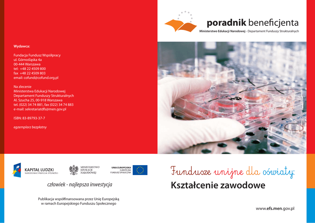 poradnik beneficjenta Ministerstwo Edukacji Narodowej - Departament Funduszy Strukturalnych Wydawca: Fundacja Fundusz Współpracy ul. Górnośląska 4a 00-444 Warszawa tel: +48 22 4509 800 fax +48 22 4509 803 email: [email protected] Na zlecenie Ministerstwa Edukacji Narodowej Departament Funduszy Strukturalnych Al. Szucha 25, 00-918 Warszawa tel. (022) 34 74 881, fax (022) 34 74 883 e-mail: [email protected] ISBN: 83-89793-37-7 egzemplarz bezpłatny Fundusze unijne dla oświaty: P Kształcenie zawodowe Publikacja współfinansowana przez Unię Europejską w ramach Europejskiego Funduszu Społecznego www.efs.men.gov.pl Stowarzyszenie na rzecz Rozwoju Rynku Pracy „S-TO-S” Autor: Piotr Stronkowski Współpraca: Adriana Niedoszewska Elżbieta Pilch Irena Wolińska Publikacja współfinansowana przez Unię Europejską w ramach Europejskiego Funduszu Społecznego poradnik beneficjenta Fundusze unijne dla oświaty: Kształcenie zawodowe Warszawa, maj 2009 Wydawca: Fundacja Fundusz Współpracy ul. Górnośląska 4a 00-444 Warszawa tel: +48 22 4509 800 fax +48 22 4509 803 email: [email protected] Na zlecenie Ministerstwa Edukacji Narodowej Departament Funduszy Strukturalnych Al. Szucha 25, 00-918 Warszawa tel. (022) 34 74 881, fax (022) 34 74 883 e-mail: [email protected] ISBN: 83-89793-37-7 egzemplarz bezpłatny Redakcja, skład i korekta: CMC Group sp. z o.o. www.cmc-group.pl Druk: Drukarnia Narodowa S.A. Nakład: 5000 egz. Spis treści 1 2 3 4 5 Wstęp strona 5 Sytuacja w obszarze kształcenia zawodowego – najważniejsze wyzwania strona 6 Możliwości rozwiązywania problemów poprzez realizację projektów strona 13 Projekty jako sposób rozwiązywania problemów strona 32 Specyficzne wymagania i możliwości związane z poszczególnymi źródłami finansowania strona 41 6 Ciekawe praktyki strona 53 7 Przydatne adresy strona 58 Fundusze unijne dla oświaty – kształcenie zawodowe 1. Wstęp Niniejszy poradnik ma na celu przedstawienie podstawowych informacji o możliwościach finansowania przedsięwzięć dotyczących kształcenia zawodowego młodzieży. Skierowany jest do wszystkich osób pracujących w sektorze kształcenia zawodowego i poszukujących możliwości sfinansowania swoich pomysłów. Ponieważ poradnik adresowany jest do osób, które zajmują się lub chcą się zająć pozyskiwaniem funduszy na oświatę, zaproponowano układ odpowiadający logice pracy nad projektem – niezależnie od obszaru, w ramach którego może zostać realizowany. Poradnik prowadzi Czytelnika przez wszystkie etapy procesu przygotowania projektu. Na początku zamieszczono podstawowe informacje o kształceniu zawodowym, wskazując najważniejsze problemy i wyzwania, a tym samym pokazując, w jaki sposób można podejść do określenia problemu, którego rozwiązaniu będzie służył projekt. Następnie omówione zostały cele poszczególnych programów, w ramach których przewidziano wspieranie kształcenia zawodowego lub szerzej – systemu edukacji. Jeżeli program obejmuje nasz problem, wówczas możemy starać się o pozyskanie środków na konkretny projekt. Jak się do tego zabrać wyjaśniamy w kolejnym rozdziale, w którym omówione zostały zasady przygotowania projektu ze wskazaniem najważniejszych, kluczowych elementów. Zwrócenie uwagi na każde z zagadnień poruszanych w tym rozdziale zdecydowanie zwiększa szanse powodzenia naszego przedsięwzięcia. Przygotowując projekt, należy zwrócić baczną uwagę na szczegółowe wymagania dotyczące realizacji projektu w ramach każdego z programów, a w szczególności: zasady składania wniosków, rozliczania wydatków, finansowania projektów itd. Zbagatelizowanie tych zagadnień może utrudnić lub wręcz uniemożliwić realizację projektu. Najważniejsze wymagania w ramach poszczególnych programów zostały zawarte w rozdziale czwartym. W ostatniej części poradnika zaprezentowano przykłady realizowanych projektów. Zakładamy, że przyjęta formuła poradnika/przewodnika najlepiej zobrazuje główne elementy procesu przygotowywania i wdrażania projektów, łatwo ją również uzupełnić, odwołując się do dokumentów, w których poszczególne zagadnienia opisano w sposób szczegółowy. Fundusze unijne dla oświaty – kształcenie zawodowe 5 Fundusze unijne dla oświaty – kształcenie zawodowe 2. Sytuacja w obszarze kształcenia zawodowego – najważniejsze wyzwania System kształcenia zawodowego zyskuje coraz większą rangę w dyskusji o sposobach zwiększania konkurencyjności zarówno polskiej, jak i europejskiej gospodarki. W wielu dokumentach podkreśla się, że konkurencyjna pozycja całej Unii Europejskiej powinna być budowana w oparciu o wysokiej jakości kapitał ludzki. Aby to osiągnąć, konieczne jest intensywne inwestowanie w kompetencje pracowników, szczególnie ich kompetencje zawodowe. Cechą charakterystyczną kształcenia zawodowego jest możliwość uzyskania dyplomu potwierdzającego kwalifikacje zawodowe po zdaniu egzaminu zawodowego. Nauczanie odbywa się zgodnie z podstawą programową, określającą profile kształcenia ogólnozawodowego lub kształcenia w zawodzie, w której określone są cele kształcenia oraz standardy wymagań, będące podstawą egzaminów. W Polsce istnieją następujące typy szkół zawodowych: • dwuletnie i trzyletnie zasadnicze szkoły zawodowe, • trzyletnie licea profilowane kształcące w profilach kształcenia ogólnozawodowego, • czteroletnie technika, • trzyletnie technika uzupełniające dla absolwentów zasadniczych szkół zawodowych, • szkoły policealne o okresie nauczania nie dłuższym niż 2,5 roku. Ponadto działają Centra Kształcenia Praktycznego, w których realizowana jest praktyczna nauka zawodu. W systemie kształcenia zawodowego wyodrębnić można również szkoły dla dorosłych, charakteryzujące się odrębną organizacją kształcenia, do których przyjmowane są osoby w wieku co najmniej 18 lat. Jednak w tym poradniku 