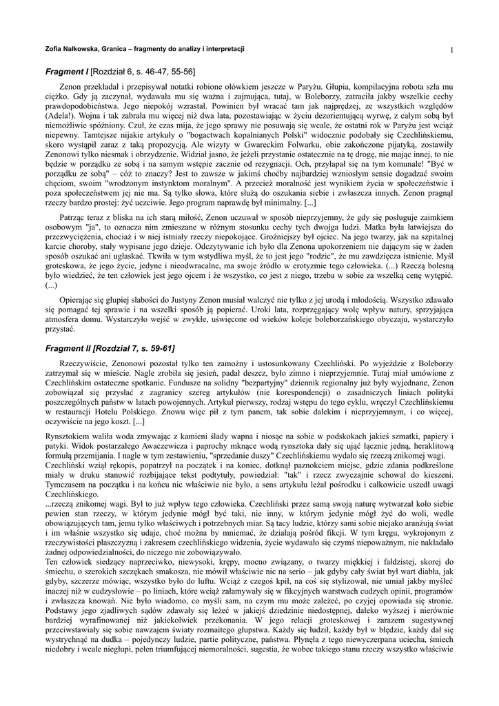 Zofia Nałkowska, Granica – fragmenty do analizy i interpretacji 1 Fragment I [Rozdział 6, s. 46-47, 55-56] Zenon przekładał i przepisywał notatki robione ołówkiem jeszcze w Paryżu. Głupia, kompilacyjna robota szła mu ciężko. Gdy ją zaczynał, wydawała mu się ważna i zajmująca, tutaj, w Boleborzy, zatraciła jakby wszelkie cechy prawdopodobieństwa. Jego niepokój wzrastał. Powinien był wracać tam jak najprędzej, ze wszystkich względów (Adela!). Wojna i tak zabrała mu więcej niż dwa lata, pozostawiając w życiu dezorientującą wyrwę, z całym sobą był niemożliwie spóźniony. Czuł, że czas mija, że jego sprawy nie posuwają się wcale, że ostatni rok w Paryżu jest wciąż niepewny. Tamtejsze nijakie artykuły o "bogactwach kopalnianych Polski" widocznie podobały się Czechlińskiemu, skoro wystąpił zaraz z taką propozycją. Ale wizyty w Gwareckim Folwarku, obie zakończone pijatyką, zostawiły Zenonowi tylko niesmak i obrzydzenie. Widział jasno, że jeżeli przystanie ostatecznie na tę drogę, nie mając innej, to nie będzie w porządku ze sobą i na samym wstępie zacznie od rezygnacji. Och, przyłapał się na tym komunale! "Być w porządku ze sobą" – cóż to znaczy? Jest to zawsze w jakimś choćby najbardziej wzniosłym sensie dogadzać swoim chęciom, swoim "wrodzonym instynktom moralnym". A przecież moralność jest wynikiem życia w społeczeństwie i poza społeczeństwem jej nie ma. Są tylko słowa, które służą do oszukania siebie i zwłaszcza innych. Zenon pragnął rzeczy bardzo prostej: żyć uczciwie. Jego program naprawdę był minimalny. [...] Patrząc teraz z bliska na ich starą miłość, Zenon uczuwał w sposób nieprzyjemny, że gdy się posługuje zaimkiem osobowym "ja", to oznacza nim zmieszane w różnym stosunku cechy tych dwojga ludzi. Matka była łatwiejsza do przezwyciężenia, chociaż i w niej istniały rzeczy niepokojące. Groźniejszy był ojciec. Na jego twarzy, jak na szpitalnej karcie choroby, stały wypisane jego dzieje. Odczytywanie ich było dla Zenona upokorzeniem nie dającym się w żaden sposób oszukać ani ugłaskać. Tkwiła w tym wstydliwa myśl, że to jest jego "rodzic", że mu zawdzięcza istnienie. Myśl groteskowa, że jego życie, jedyne i nieodwracalne, ma swoje źródło w erotyzmie tego człowieka. (...) Rzeczą bolesną było wiedzieć, że ten człowiek jest jego ojcem i że wszystko, co jest z niego, trzeba w sobie za wszelką cenę wytępić. (...) Opierając się głupiej słabości do Justyny Zenon musiał walczyć nie tylko z jej urodą i młodością. Wszystko zdawało się pomagać tej sprawie i na wszelki sposób ją popierać. Uroki lata, rozprzęgający wolę wpływ natury, sprzyjająca atmosfera domu. Wystarczyło wejść w zwykłe, uświęcone od wieków koleje boleborzańskiego obyczaju, wystarczyło przystać. Fragment II [Rozdział 7, s. 59-61] Rzeczywiście, Zenonowi pozostał tylko ten zamożny i ustosunkowany Czechliński. Po wyjeździe z Boleborzy zatrzymał się w mieście. Nagle zrobiła się jesień, padał deszcz, było zimno i nieprzyjemnie. Tutaj miał umówione z Czechlińskim ostateczne spotkanie. Fundusze na solidny "bezpartyjny" dziennik regionalny już były wyjednane, Zenon zobowiązał się przysłać z zagranicy szereg artykułów (nie korespondencji) o zasadniczych liniach polityki poszczególnych państw w latach powojennych. Artykuł pierwszy, rodzaj wstępu do tego cyklu, wręczył Czechlińskiemu w restauracji Hotelu Polskiego. Znowu więc pił z tym panem, tak sobie dalekim i nieprzyjemnym, i co więcej, oczywiście na jego koszt. [...] Rynsztokiem waliła woda zmywając z kamieni ślady wapna i niosąc na sobie w podskokach jakieś szmatki, papiery i patyki. Widok postarzałego Awaczewicza i paprochy mknące wodą rynsztoka dały się ująć łącznie jedną, heraklitową formułą przemijania. I nagle w tym zestawieniu, "sprzedanie duszy" Czechlińskiemu wydało się rzeczą znikomej wagi. Czechliński wziął rękopis, popatrzył na początek i na koniec, dotknął paznokciem miejsc, gdzie zdania podkreślone miały w druku stanowić rozbijające tekst podtytuły, powiedział: "tak" i rzecz zwyczajnie schował do kieszeni. Tymczasem na początku i na końcu nic właściwie nie było, a sens artykułu leżał pośrodku i całkowicie uszedł uwagi Czechlińskiego. ...rzeczą znikomej wagi. Był to już wpływ tego człowieka. Czechliński przez samą swoją naturę wytwarzał koło siebie pewien stan rzeczy, w którym jedynie mógł być taki, nie inny, w którym jedynie mógł żyć do woli, wedle obowiązujących tam, jemu tylko właściwych i potrzebnych miar. Są tacy ludzie, którzy sami sobie niejako aranżują świat i im właśnie wszystko się udaje, choć można by mniemać, że działają pośród fikcji. W tym kręgu, wykrojonym z rzeczywistości płaszczyzną i zakresem czechlińskiego widzenia, życie wydawało się czymś niepoważnym, nie nakładało żadnej odpowiedzialności, do niczego nie zobowiązywało. Ten człowiek siedzący naprzeciwko, niewysoki, krępy, mocno związany, o twarzy miękkiej i fałdzistej, skorej do śmiechu, o szerokich szczękach smakosza, nie mówił właściwie nic na serio – jak gdyby cały świat był wart diabła, jak gdyby, szczerze mówiąc, wszystko było do luftu. Wciąż z czegoś kpił, na coś się stylizował, nie umiał jakby myśleć inaczej niż w cudzysłowie – po liniach, które wciąż załamywały się w fikcyjnych warstwach cudzych opinii, programów i zwłaszcza knowań. Nie było wiadomo, co myśli sam, na czym mu może zależeć, po czyjej opowiada się stronie. Podstawy jego zjadliwych sądów zdawały się leżeć w jakiejś dziedzinie niedostępnej, daleko wyższej i nierównie bardziej wyrafinowanej niż jakiekolwiek przekonania. W jego relacji groteskowej i zarazem sugestywnej przeciwstawiały się sobie nawzajem światy rozmaitego głupstwa. Każdy się łudzi