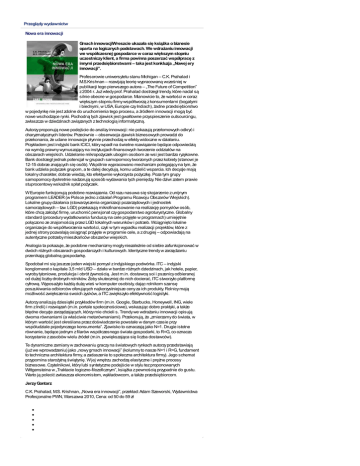 Przeglądy wydawnictw Nowa era innowacji Gmach innowacjiWreszcie ukazała się książka o biznesie oparta na logicznych podstawach. We wdrażaniu innowacji we współczesnej gospodarce w coraz większym stopniu uczestniczy klient, a firma powinna poszerzać współpracę z innymi przedsiębiorstwami – taka jest konkluzja „Nowej ery innowacji”. Profesorowie uniwersytetu stanu Michigan – C.K. Prahalad i M.S.Krishnan – rozwijają teorię wypracowaną wcześniej w publikacji tego pierwszego autora – „The Future of Competition” z 2004 r. Już wtedy prof. Prahalad dostrzegł trendy, które nadal są silnie obecne w gospodarce. Mianowicie to, że wartości w coraz większym stopniu firmy współtworzą z konsumentami (bogatymi i biednymi, w USA, Europie czy Indiach), żadne przedsiębiorstwo w pojedynkę nie jest zdolne do uruchomienia tego procesu, a źródłem innowacji mogą być nowe wschodzące rynki. Pochodną tych zjawisk jest gwałtowne przyspieszenie outsourcingu, zwłaszcza w dziedzinach związanych z technologią informatyczną. Autorzy proponują nowe podejście do analizy innowacji: nie pokazują przełomowych odkryć i charyzmatycznych liderów. Przeciwnie – obserwacja zjawisk biznesowych prowadzi do przekonania, że udane innowacje płynnie przechodzą w efekty widoczne w działaniu. Przykładem jest indyjski bank ICICI, który wpadł na świetne rozwiązanie będące odpowiedzią na wymóg prawny wymuszający na instytucjach finansowych tworzenie oddziałów na obszarach wiejskich. Udzielanie mikropożyczek ubogim osobom ze wsi jest bardzo ryzykowne. Bank dostrzegł jednak potencjał w grupach samopomocy tworzonych przez kobiety (stanowi je 12-15 dobrze znających się osób). Wspólnie wypracowano mechanizm polegający na tym, że bank udziela pożyczek grupom, a te dalej decydują, komu udzielić wsparcia. Ich decyzje mają lokalny charakter, dobrze wiedzą, kto efektywnie wykorzysta pożyczkę. Poza tym grupy samopomocy dyskretnie nadzorują sposób wydawania tych pieniędzy. Nie dziwi zatem prawie stuprocentowy wskaźnik spłat pożyczek. W Europie funkcjonują podobne rozwiązania. Od razu nasuwa się skojarzenie z unijnym programem LEADER (w Polsce jedno z działań Programu Rozwoju Obszarów Wiejskich). Lokalne grupy działania (stowarzyszenia organizacji pozarządowych i jednostek samorządowych – tzw. LGD) przekazują mikrofinansowanie na realizację pomysłów osób, które chcą założyć firmę, uruchomić pensjonat czy gospodarstwo agroturystyczne. Globalny standard (procedury wydatkowania funduszy na cele przyjęte w programach) umiejętnie połączono ze znajomością przez LGD lokalnych warunków i potrzeb. Wciągnięto lokalne organizacje do współtworzenia wartości, czyli w tym wypadku realizacji projektów, które z jednej strony pozwalają osiągnąć przyjęte w programie cele, a z drugiej – odpowiadają na autentyczne potrzeby mieszkańców obszarów wiejskich. Analogia ta pokazuje, że podobne mechanizmy mogły niezależnie od siebie zafunkcjonować w dwóch różnych obszarach gospodarczych i kulturowych. Identyczne trendy w zarządzaniu przenikają globalną gospodarkę. Spodobał mi się jeszcze jeden wiejski pomysł z indyjskiego podwórka. ITC – indyjski konglomerat o kapitale 3,5 mld USD – działa w bardzo różnych dziedzinach, jak hotele, papier, wyroby tytoniowe, produkcja i obrót żywnością. Jest m.in. dostawcą soi i pszenicy odbieranej od dużej liczby drobnych rolników. Żeby skuteczniej do nich docierać, ITC stworzyło platformę cyfrową. Wyposażyło każdą dużą wieś w komputer osobisty, dając rolnikom szansę poszukiwania odbiorców oferujących najkorzystniejsze ceny za ich produkty. Rolnicy mają możliwość zwiększenia swoich zysków, a ITC zwiększyło efektywność logistyki. Autorzy analizują dziesiątki przykładów firm (m.in. Google, Starbucks, Honeywell, ING, wiele firm z Indii) i rozwiązań (m.in. portale społecznościowe), wskazując dobre praktyki, a także błędne decyzje zarządzających, którzy mie chcieli s. Trendy we wdrażaniu innowacji opisują dwoma równaniami (a właściwie metarównaniami). Przekonują, że „zmierzamy do świata, w którym wartość jest określana przez doświadczenie powstałe w danym czasie przy współudziale pojedynczego konsumenta”. Zjawisko to oznaczają jako N=1. Drugie istotne równanie, będące jednym z filarów współczesnego świata gospodarki, to R=G, co oznacza korzystanie z zasobów wielu źródeł (m.in. powiększająca się liczba dostawców). Te dynamiczne zamiany w zachowaniu graczy na światowych rynkach autorzy przedstawiają (już we wprowadzeniu) jako „nowy gmach innowacji” (kolumny to nasze N=1 i R=G, fundament to techniczna architektura firmy, a zadaszenie to społeczna architektura firmy). Jego schemat przypomina starożytną świątynię. W jej wnętrzu zachodzą elastyczne i prężne procesy biznesowe. Czytelnikowi, który lubi syntetyczne podejście w stylu tez proponowanych Wittgensteina w „Traktacie logiczno-filozoficznym”, książka z pewnością przypadnie do gustu. Warto ją polecić zwłaszcza ekonomistom, wykładowcom, a także przedsiębiorcom. Jerzy Gontarz C.K. Prahalad, M.S. Krishnan, „Nowa era innowacji”, przekład: Adam Szeworski, Wydawnictwa Profesjonalne PWN, Warszawa 2010, Cena: od 50 do 59 zł