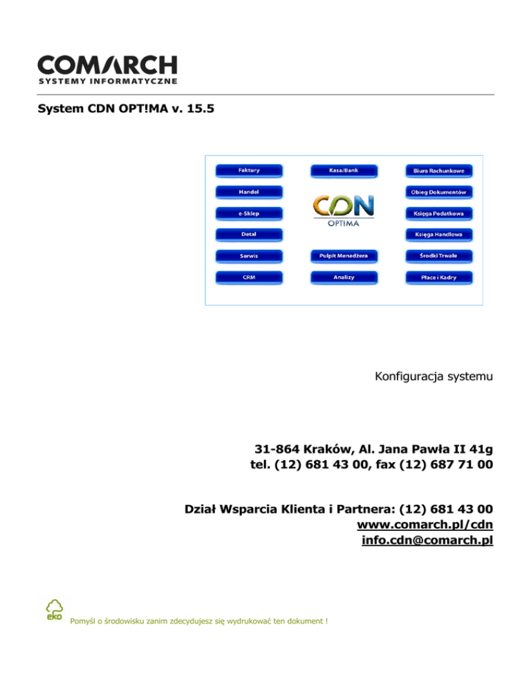 System CDN OPT!MA v. 15.5 Konfiguracja systemu 31-864 Kraków, Al. Jana Pawła II 41g tel. (12) 681 43 00, fax (12) 687 71 00 Dział Wsparcia Klienta i Partnera: (12) 681 43 00 www.comarch.pl/cdn [email protected] Pomyśl o środowisku zanim zdecydujesz się wydrukować ten dokument ! UWAGA Prawa wynikające z Warunków Gwarancji Użytkownik nabywa po rejestracji programu u Producenta. Dokumentem potwierdzającym rejestrację jest Certyfikat Rejestracji Oprogramowania, który Użytkownik otrzymuje od razu wraz z Oprogramowaniem lub po odesłaniu wypełnionej karty rejestracyjnej. Każdorazowo, przy nabyciu nowego programu lub odtworzeniu gwarancji w Certyfikacie Rejestracji Oprogramowania, określone są daty obowiązywania gwarancji na poszczególne programy. W przypadku wątpliwości dotyczącej zarejestrowania Oprogramowania lub w przypadku nieotrzymania Certyfikatu Rejestracji Oprogramowania prosimy o kontakt z Producentem (12) 681 43 00. UWAGA! Użytkowanie nielegalnej kopii naraża Użytkownika programu na postępowanie karne zgodnie z ustawą o prawie autorskim z dnia 04.02.1994 r. Użytkowanie legalnie nabytej kopii oprogramowania w wersji otrzymanej w trakcie obowiązywania gwarancji jest możliwe bez żadnych ograniczeń czasowych. Gwarancja na oprogramowanie umożliwia: uzyskanie kolejnych wersji programów na warunkach preferencyjnych (bezpłatne nowe wersje oprogramowania w okresie gwarancyjnym - nie dotyczy kosztów dostarczenia, nośnika instalacji oraz szkolenia) zakup kolejnych stanowisk lub innych programów do kompletu korzystanie z konsultacji autorskich u Producenta lub pomocy serwisu technicznego* W trosce o sprawną obsługę gwarancyjną prosimy o staranne przechowywanie Certyfikatu Rejestracji Oprogramowania oraz podawanie numeru ewidencyjnego w trakcie kontaktów z Producentem. *Nie dotyczy pakietu CDN OPT!MA Start Mikrofirma. Podręcznik Użytkownika systemu CDN OPT!MA Str. 3 1 Spis treści 1 SPIS TREŚCI...............................................................................................................................................3 2 WIADOMOŚCI OGÓLNE ..............................................................................................................................6 2.1 2.2 2.3 3 INSTALACJA PROGRAMU ........................................................................................................................ 10 3.1 3.2 3.3 3.4 4 PROCES INSTALACJI .............................................................................................................................10 REINSTALACJA Z POPRZEDNIEJ WERSJI ................................................................................................13 INSTALACJA MODUŁÓW DODATKOWYCH...............................................................................................13 DODATKI..............................................................................................................................................13 PODSTAWOWE ELEMENTY PROGRAMU .................................................................................................. 15 4.1 4.2 4.3 4.4 4.5 4.6 4.7 4.8 4.9 4.10 4.11 4.12 4.13 4.14 5 OPIS OGÓLNY SYSTEMU CDN OPT!MA .................................................................................................... 6 WYMAGANIA SPRZĘTOWE I PROGRAMOWE ............................................................................................ 7 INNE INFORMACJE................................................................................................................................. 8 WSTĘP .................................................................................................................................................15 URUCHAMIANIE PROGRAMU..................................................................................................................15 OKNO GŁÓWNE PROGRAMU ..................................................................................................................18 DWA TYPY INTERFEJSU W SYSTEMIE CDN OPT!MA ................................................................................18 PRACA W TRYBIE JEDNEGO OKNA .........................................................................................................19 PASEK SKRÓTÓW CDN OPT!MA .............................................................................................................19 OGÓLNE UWAGI NA TEMAT PRACY Z PROGRAMEM ................................................................................22 OKNA TYPU LISTA.................................................................................................................................25 OKNA TYPU FORMULARZ.......................................................................................................................30 PASEK ZADAŃ .......................................................................................................................................32 FILTRY .................................................................................................................................................32 DRUKOWANIE W PROGRAMIE ...............................................................................................................36 PODSUMOWANIE ..................................................................................................................................36 WYSTAWIANIE FAKTUR.........................................................................................................................37 INFORMACJE BIEŻĄCE ............................................................................................................................ 40 5.1 5.2 URUCHAMIANIE ....................................................................................................................................40 ZASADY OBSŁUGI .....................................................................................................