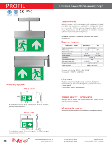 PROFIL Oprawa oœwietlenia awaryjnego IP40 1117/2011 1231/2012 Zastosowanie Zadaniem oprawy Profil jest oznaczanie dróg ewakuacyjnych i wyjœæ awaryjnych przy zastosowaniu odpowiednich piktogramów. Oprawy tej mo¿na u¿yæ w obiektach u¿ytecznoœci publicznej, jak i zak³adach pracy. Przystosowana jest do wspó³pracy z wszystkimi wersjami systemów oferowanymi przez firmê Hybryd. Dodatkowe informacje o oprawach oœwietlenia awaryjnego na stronie 26. Dane techniczne PARAMETR \ ród³o Napiêcie zasilania Pobór mocy Klasa ochronnoœci Stopieñ ochrony ród³o œwiat³a Typ baterii Czas ³adowania baterii Czas pracy awaryjnej Temperatura otoczenia Z³¹cze sieciowe Œwietlówka LED 230V 50-60Hz <12VA <4VA I IP 40 IP 20 TL8W-G5 LED bia³y Ni-MH HT 24h 1h, 2h, 3h 3h +10°C ÷ +40°C 3 x 0,5 ÷2,5 mm 2 Wersja ze œwietlówk¹ - CNBOP nr 1117/2011 Wersja z LED - CNBOP nr 1231/2012 Obudowa Obudowa wykonana z oksydowanego aluminium, dostêpna w kolorze srebrnym. Inne kolory dostêpne na specjalne zamówienie. – kolor: srebrny – klosz: p³aski, (pleksi z piktogramem) Wymiary oprawy PROFIL - œciana Wersje oprawy - zamawianie 283 315 H H standardowo wynosi 10 cm. Inne wymiary 10-25 cm dostêpne na specjalne zamówienie. Wszystkie wersje oprawy oraz sposób zamawiania podane s¹ na ostatnich stronach katalogu. Mocowania oprawy Wersje mocowania oprawy znajduj¹ siê na 3 stronie ok³adki katalogu. PROFIL - sufit H 315 42 H standardowo wynosi 40 cm. Inne wymiary 40-300 cm dostêpne na specjalne zamówienie. R email: [email protected] www: hybryd.com.pl 28 Sp. z o.o. tel: +48 (32) 233 98 83 fax: +48 (32) 233 98 84 Hybryd Sp. z o.o. Sikorskiego 28, 44-120 Pyskowice Oprawy oœwietlenia awaryjnego - dane do zamówienia Wersja ze œwietlówk¹ PRYMAT Oprawa Klosz PRYMAT DW1 Wykonanie Taw [h] Tryb pracy Piktogram ST AT CT CB CB-MA 1 2 3 C J N P01 … Zakres temperatur T P29 Przyk³ad tworzenia nazwy: PRYMAT CT 2J P08 Wersja z LED Oprawa Klosz PRYMAT 1 DW Wykonanie Tryb pracy ród³o œwiat³a Piktogram ST AT CT CB CB-MA BU-MA C J N LED P01 … Zakres temperatur T P29 Przyk³ad tworzenia nazwy: PRYMAT DW CT J LED P08 Wersja ze œwietlówk¹ PROFIL Oprawa Wykonanie Taw [h] Tryb pracy Mocowanie1 Piktogram PROFIL ST 1 C AT 2 J C12 … P01 … CT 3 C18 P29 CB W7 … CB-MA W12 Przyk³ad tworzenia nazwy: PROFIL CT 1C W11 P12 Wersja z LED Oprawa Wykonanie Tryb pracy ród³o œwiat³a Mocowanie1 Piktogram PROFIL ST C LED AT J C12 … P01 … CT C18 P29 CB CB-MA W7 … BU-MA W12 Przyk³ad tworzenia nazwy: PROFIL AT C LED W10 P07 Dla mocowañ C12 i C15 standardowa odleg³oœæ oprawy od sufitu 150mm, dla C13 i C14 - 300mm. Inne odleg³oœci dostêpne na specjalne zamówienie - wyd³u¿ony czas realizacji zamówienia. 1) Legenda - strona 63 R email: [email protected] www: hybryd.com.pl 58 Sp. z o.o. tel: +48 (32) 233 98 83 fax: +48 (32) 233 98 84 Hybryd Sp. z o.o. Sikorskiego 28, 44-120 Pyskowice Oprawy oœwietlenia awaryjnego - dane do zamówienia Oprawa Typ obudowy Wykonanie Moc Taw [h] Tryb pracy SFERA N ST 1x18W 2 J P AT 2x18W CT 1x26W CB 2x26W SFERA 1x32W Przyk³ad tworzenia nazwy: SFERA N CT 2x18W 2J Oprawa Typ obudowy Wykonanie Moc Taw [h] Tryb pracy SQUARE N ST 4x14W 2 J P AT 4x18W CT 2x36W SQUARE CB Przyk³ad tworzenia nazwy: SQUARE P AT 4x18W 2J Legenda: Typ bry³y fotometrycznej: patrz indywidualne karty produktów. Wielkoœæ oprawy: Puste pole – ma³a D – du¿a. Typ oprawy lub klosz: N – natynkowa P – podtynkowa DW – oprawa dwustronna b¹dŸ klosz dwustronny. Wykonanie: ST – standard AT – autotest CT – centraltest CB – centralna bateria, CB-MA – centralna bateria z wbudowanym modu³em adresowym, CB-MP – centralna bateria z wbudowanym modu³em prze³¹czaj¹cym, CB-MAP – centralna bateria z wbudowanym modu³em adresowo-prze³¹czaj¹cym, BU-MA – zasilanie buforowe. Taw [h] - czas pracy awaryjnej: nie definiuje siê dla wszystkich wykonañ CB. Tryb pracy: C – ciemny J – jasny N – nocny (tylko dla wykonania CT). Zdefiniowany dla wykonañ ST, AT, CT, CB-MA (oprawy LED) i CB-MAP (oprawy œwietlówkowe). Zakres temperatur: Puste pole - standardowy zakres temperatur T – oprawa o rozszerzonym zakresie temperatur (patrz dane techniczne) z wbudowanym termostatem H-323 (bateri¹ termostatyzowan¹). Kolor obudowy: pola oznaczone * dostêpne na specjalne zamówienie – wyd³u¿ony czas dostawy. R Hybryd Sp. z o.o. Sikorskiego 28, 44-120 Pyskowice tel: +48 (32) 233 98 83 fax: +48 (32) 233 98 84 email: [email protected] www: hybryd.com.pl 63 Sp. z o.o. Akcesoria do opraw oœwietlenia awaryjnego Zestaw mocowania C101 Zestaw mocowania przeznaczony do zwieszania opraw PRYMAT, PRIMOS i HERKULES-P. UWAGA! Linki b¹dŸ ³añcuszki nale¿y zamawiaæ osobno. Zestaw mocowania C102 Zestaw mocowania przeznaczony do zwieszania oprawy KWADRA N. UWAGA! Linki b¹dŸ ³añcuszki nale¿y zamawiaæ osobno. Zestaw mocowania C103 Zestaw mocowania przeznaczony do zwieszania oprawy PROFILIGHT C32. UWAGA! Linki b¹dŸ ³añcuszki nale¿y zamawiaæ osobno. Zestaw mocowania C105 Zestaw mocowania przeznaczony do monta¿u opraw PRIMOS, PRYMAT i HERKULES-P w sufitach podwieszanych. Zestaw mocowania C106 Zestaw mocowania przeznaczony do monta¿u opraw PRIMOS, PRYMAT i HERKULES-P do koryt kablowych. Zestaw mocowania W121 Zestaw mocowania naœciennego przeznaczony dla opraw PRIMOS, PRYMAT i HERKULES-P. Pozwala na zamontowanie oprawy na œcianie prostopadle do niej b¹dŸ odchylaj¹c oprawê od poziomu o 15, 30, 45, 60, 75 lub 90°. Przy zastosowaniu mocowania W121 oprawa jest skierowana do œciany krótszym bokiem. Zestaw mocowania W122 Zestaw mocowania naœciennego przeznaczony dla opraw PRIMOS, PRYMAT i HERKULES-P. Zestaw pozwala na zamontowanie oprawy na œcianie prostopadle do niej b¹dŸ odchylaj¹c oprawê od poziomu o 15, 30, 45, 60 lub 75°. Przy zastosowaniu mocowania W122 oprawa jest skierowana do œciany d³u¿szym bokiem. Zestaw mocowania W131 Zestaw mocowania przeznaczony do monta¿u natynkowe
