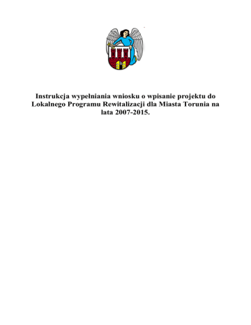 Instrukcja wypełniania wniosku o wpisanie projektu do Lokalnego Programu Rewitalizacji dla Miasta Torunia na lata 2007-2015. Ilekroć w niniejszej instrukcji jest mowa o: 1. RPO – należy przez to rozumieć Regionalny Program Operacyjny Województwa Kujawsko-Pomorskiego na lata 2007-2013. 2. Uszczegółowieniu RPO - należy przez to rozumieć Szczegółowy opis osi priorytetowych Regionalnego Programu Operacyjnego Województwa KujawskoPomorskiego na lata 2007-2013. 3. EFRR – należy przez to rozumieć Europejski Fundusz Rozwoju Regionalnego. 4. LPR-T – należy przez to rozumieć Lokalny Program Rewitalizacji dla Miasta Torunia na lata 2007-2015. 5. KOP – należy przez to rozmieć Komisję Oceny Projektów, której członkowie są powoływani Zarządzeniem Prezydenta Miasta Torunia, spośród specjalistów zatrudnionych w Urzędzie Miasta Torunia oraz w jednostkach organizacyjnych Miasta. 6. Wniosku – wniosek o wpisanie projektu do Lokalnego Programu Rewitalizacji dla Miasta Torunia na lata 2007-2015. 7. MSP - należy przez to rozumieć podmioty należące do sektora małych i średnich przedsiębiorstw. 8. IZ – należy rozumieć Instytucję Zarządzającą (Zarząd Województwa KujawskoPomorskiego). 9. Wydatkach kwalifikowalnych – należy przez to rozumieć wydatek spełniający warunki umożliwiające jego całkowite lub częściowe pokrycie środkami przeznaczonymi na realizację programu operacyjnego, pochodzącymi z budżetu Unii Europejskiej lub z publicznych źródeł krajowych. Są to wydatki spełniające kryteria, zgodnie z rozporządzeniem Rady nr 1083/2006, rozporządzeniem Komisji nr 1828/2006, rozporządzeniem Parlamentu Europejskiego i Rady nr 1080/2006, jak również w rozumieniu ustawy z dnia 6 grudnia 2006 r. o zasadach prowadzenia polityki rozwoju (Dz. U. Nr 227, poz. 1658 z późn. zm.) i przepisów rozporządzeń wydanych do niniejszej ustawy, oraz zgodnie z krajowymi zasadami kwalifikowalności wydatków w okresie programowania 2007 – 2013 i z Uszczegółowieniem Programu, jak również z zasadami określonymi w Wytycznych IZ w zakresie kwalifikowalności kosztów w ramach RPO WK-P 2007-2013; Przykłady kosztów kwalifikowalnych dla działania 7.1. RPO zawiera Załącznik VI Uszczegółowienia RPO „Lista wydatków kwalifikowanych w poszczególnych działaniach Regionalnego Programu Operacyjnego Województwa KujawskoPomorskiego na lata 2007-2013”. 10. Wydatkach niekwalifikowalnych – należy przez to rozumieć wydatek nie spełniający warunków umożliwiających jego całkowite lub częściowe pokrycie środkami przeznaczonymi na realizację programu operacyjnego, pochodzącymi z budżetu Unii Europejskiej lub z publicznych źródeł krajowych i w związku z tym nie kwalifikujący się do współfinansowania. Przykłady kosztów niekwalifikowalnych dla działania 7.1. RPO zawiera Załącznik VI Uszczegółowienia RPO „Lista wydatków kwalifikowanych w poszczególnych działaniach Regionalnego Programu Operacyjnego Województwa Kujawsko-Pomorskiego na lata 2007-2013”. SEKCJA I: DATA SPORZĄDZENIA OPISU PROJEKTU W rubryce należy wpisać dzień, miesiąc i rok, w którym dokonano opisu projektu. SEKCJA II i III: WNIOSKODAWCA Niniejsza rubryka służy identyfikacji wnioskodawcy/beneficjenta projektu. Beneficjent to podmiot, który będzie stroną umowy o dofinansowanie projektu z EFRR, jeżeli jego wniosek o wpisanie do LPR-T zostanie przyjęty, a następnie wniosek o dofinansowanie realizacji projektu zostanie zarekomendowany do realizacji przez Zarząd Województwa KujawskoPomorskiego. Nazwa własna i dane adresowe wpisane we wniosku w ramach omawianego punktu muszą być zgodne ze stanem faktycznym i z danymi aktualnego dokumentu rejestrowego (jeżeli takowy jest wymagany). Do kategorii beneficjentów zalicza się tylko grupę podmiotów, która wyszczególniona została dla Działania 7.1. („Typy beneficjentów”) w Uszczegółowieniu RPO i Wytycznych Ministra Rozwoju Regionalnego w zakresie programowania działań dotyczących mieszkalnictwa. W polu „Forma prawna” należy wpisać formę prawną właściwą dla beneficjenta, zgodnie z dokumentami statutowymi/rejestrowymi. W polu „Nazwa dokumentu rejestrowego i numer” należy wpisać stosowną nazwę dokumentu oraz podać jego numer. SEKCJA IV: DANE OSOBY UPOWAŻNIONEJ DO KONTAKTU W RAMACH PROJEKTU W tym punkcie należy wpisać dane osoby wyznaczonej (w instytucji beneficjenta lub podmiocie reprezentującym beneficjenta) do kontaktów roboczych w sprawach projektu. W w/w punkcie należy wpisać dane tej osoby. Powinna to być osoba dysponująca pełną wiedzą na temat planowanej inwestycji. SEKCJA V: NAZWA PROJEKTU Tytuł projektu powinien stanowić krótką, jednoznaczną nazwę, tak aby w sposób jasny identyfikował projekt, a jednocześnie nie powielał tytułu innych projektów realizowanych przez beneficjenta lub przez inne podmioty. Nazwa projektu powinna zawierać przedmiot, lokalizację i etap/fazę zadania (jeżeli realizowany projekt jest częścią większej inwestycji). SEKCJA VI: MIEJSCE REALIZACJI PROJEKTU – REJON / ULICA Na potrzeby udzielenia dofinansowania w ramach Osi Priorytetowej 7, Działanie 7.1 dla projektów z terenu Torunia, w LPR-T wyznaczono obszary wsparcia. W niniejszym punkcie należy opisać miejsce realizacji projektu i wskazać jego zgodność z wyznaczonymi w LPR-T obszarami wsparcia. SEKCJA VII: KOSZT CAŁKOWITY PROJEKTU W PLN Należy podać sumę kosztów kwalifikowanych i niekwalifikowanych projektu. SEKCJA VIII: ŹRÓDŁA FINANSOWANIA PROJEKTU W % i w PLN Należy uzupełnić tabelę dotyczącą źródeł finansowania projektu, z których pokryte zostaną wydatki kwalifikowalne. W celu określenia źródeł finansowania konieczne jest określenie wysokości wkładu własnego Wnioskodawcy i wysokości dotacji z funduszy strukturalnych UE. Maksymalny poziom dofinansowania wynosi 65%. SEKACJA IX: ZWIĘZŁY OPIS PROJEKTU Należy opisać stan is
