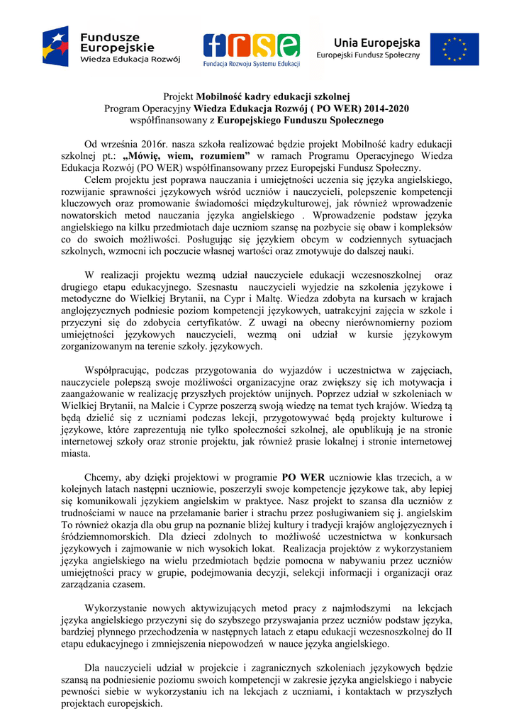 Projekt Mobilność kadry edukacji szkolnej Program Operacyjny Wiedza Edukacja Rozwój ( PO WER) 2014-2020 współfinansowany z Europejskiego Funduszu Społecznego Od września 2016r. nasza szkoła realizować będzie projekt Mobilność kadry edukacji szkolnej pt.: „Mówię, wiem, rozumiem” w ramach Programu Operacyjnego Wiedza Edukacja Rozwój (PO WER) współfinansowany przez Europejski Fundusz Społeczny. Celem projektu jest poprawa nauczania i umiejętności uczenia się języka angielskiego, rozwijanie sprawności językowych wśród uczniów i nauczycieli, polepszenie kompetencji kluczowych oraz promowanie świadomości międzykulturowej, jak również wprowadzenie nowatorskich metod nauczania języka angielskiego . Wprowadzenie podstaw języka angielskiego na kilku przedmiotach daje uczniom szansę na pozbycie się obaw i kompleksów co do swoich możliwości. Posługując się językiem obcym w codziennych sytuacjach szkolnych, wzmocni ich poczucie własnej wartości oraz zmotywuje do dalszej nauki. W realizacji projektu wezmą udział nauczyciele edukacji wczesnoszkolnej oraz drugiego etapu edukacyjnego. Szesnastu nauczycieli wyjedzie na szkolenia językowe i metodyczne do Wielkiej Brytanii, na Cypr i Maltę. Wiedza zdobyta na kursach w krajach anglojęzycznych podniesie poziom kompetencji językowych, uatrakcyjni zajęcia w szkole i przyczyni się do zdobycia certyfikatów. Z uwagi na obecny nierównomierny poziom umiejętności językowych nauczycieli, wezmą oni udział w kursie językowym zorganizowanym na terenie szkoły. językowych. Współpracując, podczas przygotowania do wyjazdów i uczestnictwa w zajęciach, nauczyciele polepszą swoje możliwości organizacyjne oraz zwiększy się ich motywacja i zaangażowanie w realizację przyszłych projektów unijnych. Poprzez udział w szkoleniach w Wielkiej Brytanii, na Malcie i Cyprze poszerzą swoją wiedzę na temat tych krajów. Wiedzą tą będą dzielić się z uczniami podczas lekcji, przygotowywać będą projekty kulturowe i językowe, które zaprezentują nie tylko społeczności szkolnej, ale opublikują je na stronie internetowej szkoły oraz stronie projektu, jak również prasie lokalnej i stronie internetowej miasta. Chcemy, aby dzięki projektowi w programie PO WER uczniowie klas trzecich, a w kolejnych latach następni uczniowie, poszerzyli swoje kompetencje językowe tak, aby lepiej się komunikowali językiem angielskim w praktyce. Nasz projekt to szansa dla uczniów z trudnościami w nauce na przełamanie barier i strachu przez posługiwaniem się j. angielskim To również okazja dla obu grup na poznanie bliżej kultury i tradycji krajów anglojęzycznych i śródziemnomorskich. Dla dzieci zdolnych to możliwość uczestnictwa w konkursach językowych i zajmowanie w nich wysokich lokat. Realizacja projektów z wykorzystaniem języka angielskiego na wielu przedmiotach będzie pomocna w nabywaniu przez uczniów umiejętności pracy w grupie, podejmowania decyzji, selekcji informacji i organizacji oraz zarządzania czasem. Wykorzystanie nowych aktywizujących metod pracy z najmłodszymi na lekcjach języka angielskiego przyczyni się do szybszego przyswajania przez uczniów podstaw języka, bardziej płynnego przechodzenia w następnych latach z etapu edukacji wczesnoszkolnej do II etapu edukacyjnego i zmniejszenia niepowodzeń w nauce języka angielskiego. Dla nauczycieli udział w projekcie i zagranicznych szkoleniach językowych będzie szansą na podniesienie poziomu swoich kompetencji w zakresie języka angielskiego i nabycie pewności siebie w wykorzystaniu ich na lekcjach z uczniami, i kontaktach w przyszłych projektach europejskich.