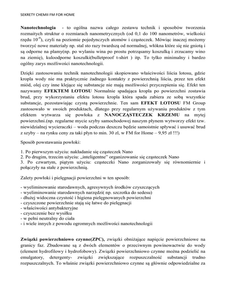 SEKRETY CHEMII FM FOR HOME Nanotechnologia - to ogólna nazwa całego zestawu technik i sposobów tworzenia rozmaitych struktur o rozmiarach nanometrycznych (od 0,1 do 100 nanometrów, wielkości rzędu 10-9), czyli na poziomie pojedynczych atomów i cząsteczek. Mówiąc inaczej możemy tworzyć nowe materiały np. stal sto razy twardszą od normalnej, włókna które się nie gniotą i są odporne na plamy(np. po wylaniu wina po prostu potrząsamy koszulką i zrzucamy wino na ziemię), kuloodporne koszulki(bulletproof t-shirt ) itp. To tylko minimalny i bardzo ogólny zarys możliwości nanotechnologii. Dzięki zastosowaniu technik nanotechnologii skopiowano właściwości liścia lotosu, gdzie kropla wody nie ma praktycznie żadnego kontakty z powierzchnią liścia, przez ten efekt miód, olej czy inne klejące się substancje nie mają możliwości przyczepienia się. Efekt ten nazywamy EFEKTEM LOTOSU Normalnie spadająca kropla po powierzchni zostawia brud, przy wykorzystaniu efektu lotosu kropla która spada zabiera ze sobą wszystkie substancje, pozostawiając czystą powierzchnie. Ten sam EFEKT LOTOSU FM Group zastosowało w swoich produktach, dlatego przy regularnym używaniu produktów z tym efektem wytwarza się powłoka z NANOCZĄSTECZEK KRZEMU na mytej powierzchni.(np. regularne mycie szyby samochodowej naszym płynem wytworzy efekt tzw. niewidzialnej wycieraczki – woda podczas deszczu będzie samoistnie spływać i usuwać brud z szyby – na rynku ceny za taki płyn to min. 30 zl, w FM for Home – 9,95 zł !!!) Sposób powstawania powłoki: 1. Po pierwszym użyciu: nakładanie się cząsteczek Nano 2. Po drugim, trzecim użyciu: „inteligentne” organizowanie się cząsteczek Nano 3. Po czwartym, piątym użyciu: cząsteczki Nano zorganizowały się równomiernie i połączyły na stałe z powierzchnią. Zalety powłoki i pielęgnacji powierzchni w ten sposób: - wyeliminowanie starodawnych, agresywnych środków czyszczących - wyeliminowanie starodawnych narzędzi( np. szczotka do sedesu) - dłużej widoczna czystość i higiena pielęgnowanych powierzchni - czyszczone powierzchnie stają się łatwe do pielęgnacji - właściwości antybakteryjne - czyszczenie bez wysiłku - w pełni neutralny do ciała - i wiele innych z powodu ogromnych możliwości nanotechnologii Związki powierzchniowo czynne(ZPC), związki obniżające napięcie powierzchniowe na granicy faz. Zbudowane są z dwóch elementów o przeciwnym powinowactwie do wody (element hydrofilowy i hydrofobowy). Związki powierzchniowo czynne można podzielić na emulgatory, detergenty- związki zwiększające rozpuszczalność substancji trudno rozpuszczalnych. To właśnie związki powierzchniowo czynne są głównie odpowiedzialne za SEKRETY CHEMII FM FOR HOME usuwanie brudu, trudno rozpuszczalnych plam, zacieków, itd. jonowe(anionowe, kationowe i amfoteryczne) i niejonowe. ZPC dzielimy na Chemia For Home charakteryzuje się dużą zawartością związków powierzchniowo czynnych (związków myjących) oraz zawiera w sobie ich specjalne kombinacje, które powodują, że czyszczone powierzchnie zachowują czystość i połysk przez dłużysz okres czasu. Dodatkowo preparaty z nanocząsteczkami krzemu dodatkowo pielęgnują i chronią czyszczone powierzchnie zapewniając im właściwości antybakteryjne i przeciwgrzybiczne. Dodatkowo produkty For Home charakteryzują się wysoką jakością kompozycji zapachowych, dlatego jak wyczyścimy łazienkę naszą chemią to unosi się tam przyjemny zapach (np. wiśniowy, cytrynowy) Czytając etykiety produktów warto zwrócić uwagę na fakt, że produkty FM for Home mają często parokrotnie większą zawartość związków myjących. Np. płyn do zmywania w markecie za 3 zł ma około 4% związków myjących, trochę chlorku sodu do zagęszczenia i kompozycji zapachowych, reszta to woda. Warto zatem się zastanowić czy lepiej zapłacić około 9 zł za produkt dobrej jakości czy zapłacić 3 zł za zwykłą wodę. Dodatkowo w naszej chemii związki myjące bardzo dobrze się wypłukują. Twierdzi się, że taki typowy płyn do mycia naczyń należy około 20 razy przepłukać w celu usunięcia wszystkich środków myjących. Podobnie w przypadku płynów do płukania to, że płyn do płukania za 4 zł bardzo intensywnie pachnie to nie świadczy o jego jakości. Producent bardzo często chce odwrócić w ten sposób naszą uwagę od jego słabych cech. Nasza rola polega na tym aby budować świadomość u naszych współpracowników i klientów. Pamiętajmy o tym żeby samemu używać produktów For Home i je poznawać. Jest to najprostszy sposób pokazania naszych produktów naszym znajomym. Warto mieć po dwa produkty w domu danego produktu. Wtedy jak nasz znajomy przyjdzie do domu i spodoba mu się np. preparat do kominków i piekarników i wyrazi chęć jego zakupienia. Zawsze możemy powiedzieć: „to się dobrze składa akurat mam jeden na zapasie”. My zarabiamy, a znajomy jest zadowolony bo od razu ma produkt. Przy okazji uzupełniamy zapas. Ta metoda ma dodatkowo jeszcze jedną zaletę, gdy nam się kończy dany produkt, nie idziemy do sklepu czy supermarketu, tylko korzystamy z naszego zapasowego produktu. W ten sposób zawsze zyskujemy. Pamiętaj, kupując w zwykłym sklepie nigdy nie zarabiasz. Używając produktów FM For Home należy pamiętać o tym, że bardzo często są to koncentraty lub produkty bardzo wydajne. Dlatego należy je zawsze stosować dokładnie wg zaleceń. Ponieważ jak np. wlejemy więcej płynu do powierzchni laminowanych do wody niż jest wskazane na etykiecie, to czyszczona podłoga może się kleić później. SEKRETY CHEMII FM FOR HOME Opakowania firmy FM for Home - opakowania FM for Home zostały wyróżnione w konkursie prestiżowego czasopisma Packaging, gdzie były jedynymi finalistami wśród środków chemii gospodarczej. Wyróżnione za funkcjonalność(łatwo się pakuje, chowa do szafy), prostotę i łatwość