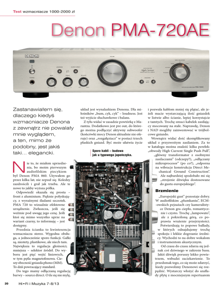Test Denon PMA-720AE układ jest wynalazkiem Denona. Dla miłośników „bum, cyk, cyk” – loudness. Jest też wyjście słuchawkowe i balans. Z tyłu widać w zasadzie powtórkę z Marantza. Dodatkowo jest pre out, do którego można podłączyć aktywny subwoofer (końcówki mocy Denon aktualnie nie oferuje) oraz „rozgałęziacz” w postaci trzech płaskich gniazd. Być może ułatwia życie Sporo kabli – budowa ie to, że miałem uprzedzenia, bo moim pierwszym audiofilskim piecykiem był Denon PMA 860. Używałem go przez kilka lat; nie zepsuł się. Koledzy zazdrościli i grał jak trzeba. Ale te nowe to jakby wyższa półka. Odpowiedź okazała się prosta – front z aluminium. Pięknie połyskujący, z wyraźnymi śladami szczotek. PMA 720 to wizualnie efektowne urządzenie. Zwłaszcza, jeśli się weźmie pod uwagę jego cenę. Jeśli ktoś się mimo wszystko uprze na wariant czarny, to informuję – jest dostępny. Przednia ścianka to kwintesencja wzmacniacza stereo. Wygodna obsługa, a jednocześnie sporo funkcji. Gałki są, niestety, plastikowe, ale niech tam. Największa to regulacja głośności; mniejsza – selektor źródeł. Do wyboru jest pięć wejść liniowych, w tym pętla magnetofonowa. Cieszy obecność gniazda phono (MM). To dziś powracający standard. Do tego mamy odłączaną regulację barwy – source direct. O ile się nie mylę, 20 i pozwala kablom mniej się plątać, ale jeżeli macie wystarczającą ilość gniazdek w listwie albo ścianie, lepiej korzystajcie z tamtych. Trochę smuci kabelek zasilający mocowany na stałe. Naprawdę, Denon i NAD mogliby zainwestować w trójbolcowe gniazdo. Wewnątrz widać dość skomplikowany układ z przyzwoitym zasilaniem. Za to w katalogu można znaleźć kilka perełek: „obwody High Current Single Push Pull”, „główny transformator z osobnymi zasilaczami” (odczepy?), „odłączany mikroprocesor” (po co?), „odporna na wibracje konstrukcja Direct Mechanical Ground Construction”. Ale najbardziej spodobało mi się „strojenie dźwięku dostosowane do gustu europejskiego”. Brzmienie „Europejski gust” pozostaje dobry. W audiofilskim „plumkaniu”, ECM-owskich pejzażach czy kameralistyce Denon gra ciepło, romantycznie i czysto. Trochę „lampowato”, ale z pokreśloną górą, co poprawia wrażenie przejrzystości. Potwierdzają to popowe ballady, w których odnajdujemy trochę spokoju i lekkie dogrzanie średnicy. Wychodzi to na dobre wokalom i instrumentom akustycznym. Od czasu do czasu zdarza się jednak coś dziwnego w zakresie basu. Jakiś dźwięk poruszy lekko powietrzem, wzbudzi zaciekawienie. To przedsmak tego, co się może zdarzyć, kiedy pozwolimy Denonowi się rozpędzić. Wystarczy włożyć do szuflady płytę z mocniejszym repertuarem Test i zdecydowanym ruchem przekręcić gałkę w prawo. Efekt przypomina mocniejsze naciśnięcie pedału gazu w sportowym wozie. Doktor Jekyll przeistacza się w Mr Hyde’a, a kolumny dostają mocnego kopa w cewki. Pojawia się ściana dźwięku; ciężka jak czołg, ale też w swej masywności niepozbawiona wdzięku. Przejrzystość pozostaje co najmniej dobra, a przestrzeń nie ulega spłaszczeniu. Denon zachowuje się, jakby miał na pokładzie uczciwe 100 watów. Ta potęga i energia są wręcz stworzone do koncertów rockowych. Nie byłoby to możliwe bez odpowiedniej podbudowy basowej. W tym względzie Denon też się nie pieści. Pompuje decybele niczym tłok, schodzi nisko i nie traci kontroli. Oczywiście, można lepiej ucinać wybrzmienia i atakować szybciej, ale wiele osób wybierze potęgę, bo tego się po prostu dobrze słucha. Konkluzja Denon to drapieżny i silny jak niedźwiedź wzmacniacz rockowy. Być może jego pasmo przenoszenia nie jest płaską linią, a niektórzy znajdą w dźwięku nawet lekkie skonturowanie. Ale co z tego, skoro łączy się to z radością grania? Na Denonie można słuchać kameralistyki wokalnej, ale w moim odczuciu to marnowanie jego potencjału. W każdej sekundzie ten wzmacniacz prosi: daj czadu! Denon PMA-720AE Dane techniczne: 50 W/8 20 Hz – 50 kHz 0,05 % (20 Hz – 20 kHz) 90dB 5 MM Pre out (Denon nie oferuje tak + loudness + 12/43,3/31 cm 7,1 kg Ocena: §§§§¨ §§§§§ §§§§§ §§§§§ §§§§¨ §§§§§ §§§§§ §§§§§ No – just at one with his SpiritOne Wyłączny dystrybutor w Polsce: 02-922 Warszawa, ul. Nałęczowska 31, tel. (22) 642 46 29, tel./fax (22) 842 80 10 mail: [email protected] www.trimex.pl 21