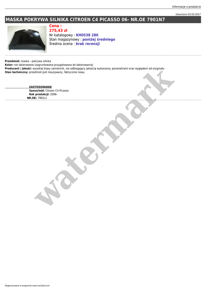 Informacje o produkcie Utworzono 02-03-2017 MASKA POKRYWA SILNIKA CITROEN C4 PICASSO 06- NR.OE 7901N7 Cena : 275,43 zł Nr katalogowy : KH0538 280 Stan magazynowy : poniżej średniego Średnia ocena : brak recenzji er m ar k Przedmiot: maska - pokrywa silnika Kolor: nie lakierowane (zagruntowana przygotowana do lakierowania) Producent / jakość: wysokiej klasy zamiennik, nie odbiegający jakością wykonania, parametrami oraz wyglądem od oryginału Stan techniczny: przedmiot jest nieużywany, fabrycznie nowy. w at ZASTOSOWANIE Samochód: Citroen C4 Picasso Rok produkcji: 2006NR.OE: 7901L1 Wygenerowano w programie www.oscGold.com