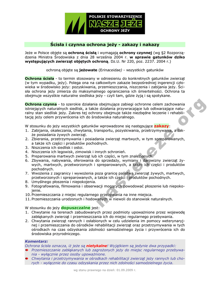 Ścisła i czynna ochrona jeży - zakazy i nakazy Jeże w Polsce objęte są ochroną ścisłą i wymagają ochrony czynnej (wg §2 Rozporządzenia Ministra Środowiska z dnia 28 września 2004 r. w sprawie gatunków dziko występujących zwierząt objętych ochroną. Dz.U. Nr 220, poz. 2237. 2004 r.) ochroną objęte są jeżowate (Erinaceidae) - wszystkich gatunków Ochrona ścisła - to termin stosowany w odniesieniu do konkretnych gatunków zwierząt (w tym wypadku, jeży). Polega ona na całkowitym zakazie bezpośredniej ingerencji człowieka w środowisko jeży: pozyskiwania, przemieszczania, niszczenia i zabijania jeży. Ścisła ochrona jeży zmierza do maksymalnego ograniczenia ich śmiertelności. Ochrona ta obejmuje wszystkie naturalne siedliska jeży - czyli tam, gdzie żyją i są spotykane. .o rg Ochrona czynna - to szerokie działania obejmujące zabiegi ochronne celem zachowania istniejących naturalnych siedlisk, a także działania przywracające lub odtwarzające naturalny stan siedlisk jeży. Zakres tej ochrony obejmuje także niezbędne leczenie i rehabilitację jeży celem przywrócenia ich do środowiska naturalnego. n a s ze je ze W stosunku do jeży wszystkich gatunków wprowadzone się następujące zakazy: 1. Zabijania, okaleczania, chwytania, transportu, pozyskiwania, przetrzymywania, a także posiadania żywych zwierząt. 2. Zbierania, przetrzymywania i posiadania zwierząt martwych, w tym spreparowanych, a także ich części i produktów pochodnych. 3. Niszczenia ich siedlisk i ostoi. 4. Niszczenia ich legowisk, zimowisk i innych schronień. 5. Preparowania martwych zwierząt lub ich części, w tym znalezionych. 6. Zbywania, nabywania, oferowania do sprzedaży, wymiany i darowizny zwierząt żywych, martwych, przetworzonych i spreparowanych, a także ich części i produktów pochodnych. 7. Wwożenia z zagranicy i wywożenia poza granicę państwa zwierząt żywych, martwych, przetworzonych i spreparowanych, a także ich części i produktów pochodnych. 8. Umyślnego płoszenia i niepokojenia. 9. Fotografowania, filmowania i obserwacji mogących powodować płoszenie lub niepokojenie. 10. Przemieszczania z miejsc regularnego przebywania na inne miejsca. 11. Przemieszczania urodzonych i hodowanych w niewoli do stanowisk naturalnych. W stosunku do jeży dopuszczalne jest: 1. Chwytanie na terenach zabudowanych przez podmioty upoważnione przez wojewodę zabłąkanych zwierząt i przemieszczania ich do miejsc regularnego przebywania. 2. Chwytania zwierząt rannych i osłabionych w celu udzielenia im pomocy weterynaryjnej i przemieszczania do ośrodków rehabilitacji zwierząt oraz przetrzymywania w tych ośrodkach na czas odzyskania zdolności samodzielnego życia i przywrócenia ich do środowiska przyrodniczego. Komentarz: Ochrona ścisła oznacza, iż jeże są nietykalne! Wyjątkiem są jedynie dwa przypadki: Przemieszczanie zabłąkanych lub zagrożonych jeży do miejsc regularnego przebywania - wyłącznie przez osoby upoważnione. Chwytania i przetrzymywania w ośrodkach rehabilitacji zwierząt jeży rannych lub chorych - wyłącznie do czasu odzyskania przez nich zdolności samodzielnego życia. wg stanu prawnego na dzień: 01.09.2009 r.