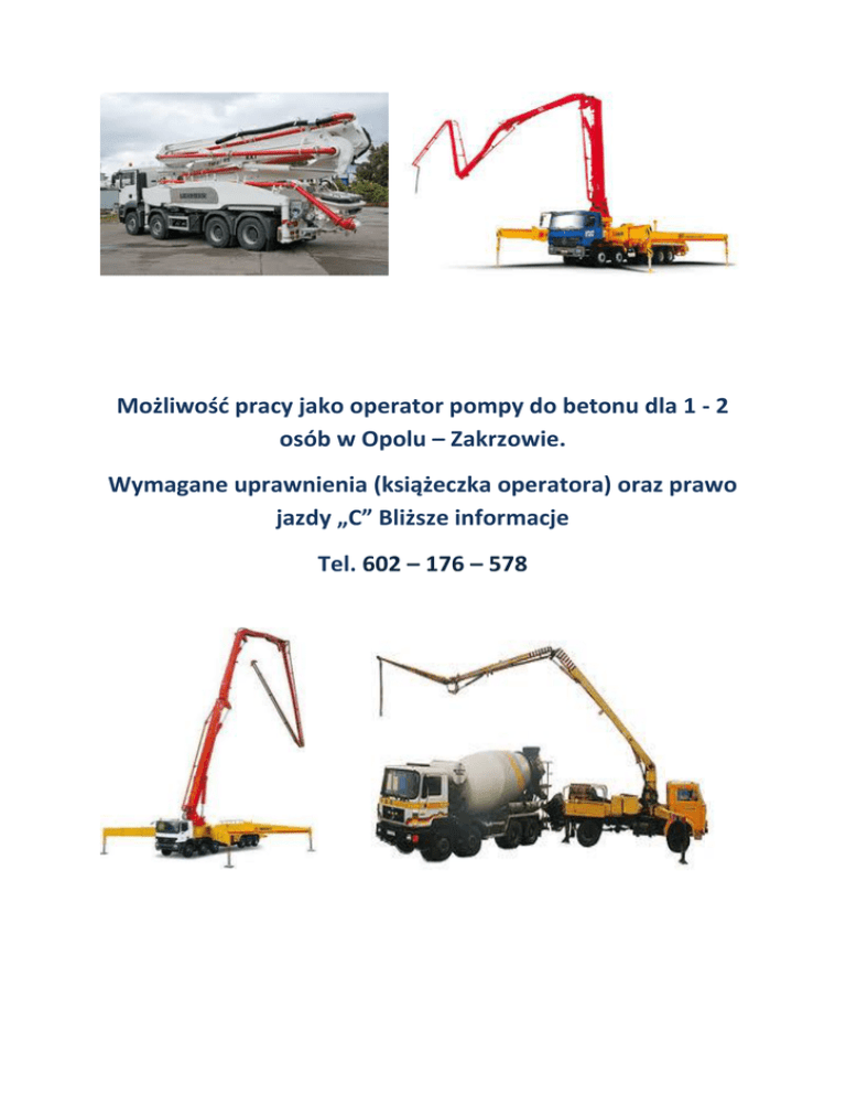 Możliwość pracy jako operator pompy do betonu dla 1 - 2 osób w Opolu – Zakrzowie. Wymagane uprawnienia (książeczka operatora) oraz prawo jazdy „C” Bliższe informacje Tel. 602 – 176 – 578