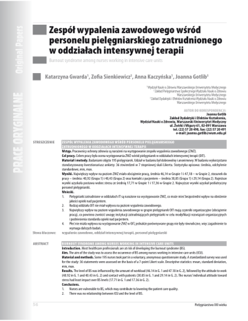 Zespół wypalenia zawodowego wśród personelu pielęgniarskiego zatrudnionego w oddziałach intensywnej terapii Burnout syndrome among nurses working in intensive care units Katarzyna Gwarda1, Zofia Sienkiewicz2, Anna Kaczyńska1, Joanna Gotlib3 1 Wydział Nauki o Zdrowiu Warszawskiego Uniwersytetu Medycznego 2 Zakład Pielęgniarstwa Społecznego Wydziału Nauki o Zdrowiu Warszawskiego Uniwersytetu Medycznego 3 Zakład Dydaktyki i Efektów Kształcenia Wydziału Nauki o Zdrowiu Warszawskiego Uniwersytetu Medycznego AUTOR DO KORESPONDENCJI: Joanna Gotlib Zakład Dydaktyki i Efektów Kształcenia, Wydział Nauki o Zdrowiu, Warszawski Uniwersytet Medyczny ul. Żwirki i Wigury 61, 02-091 Warszawa tel. (22) 57 20 490, fax: (22) 57 20 491 e-mail: [email protected] STRESZCZENIE Słowa kluczowe: ABSTRACT 56 ZESPÓŁ WYPALENIA ZAWODOWEGO WŚRÓD PERSONELU PIELĘGNIARSKIEGO ZATRUDNIONEGO W ODDZIAŁACH INTENSYWNEJ TERAPII Wstęp. Pracownicy ochrony zdrowia są narażeni na występowanie zespołu wypalenia zawodowego (ZWZ). Cel pracy. Celem pracy była ocena występowania ZWZ wśród pielęgniarek w oddziałach intensywnej terapii (OIT). Materiał i metody. Badaniami objęto 195 pielęgniarek. Udział w badaniu był dobrowolny i anonimowy. W badaniu wykorzystano standaryzowany kwestionariusz ankiety: 36 stwierdzeń w 7 stopniowej skali Likerta. Statystyka opisowa: średnia, odchylenie standardowe, min, max. Wyniki. Największy wpływ na poziom ZWZ miało obciążenie pracą, średnia 46,14 w Grupie 1 i 47,18 – w Grupie 2, stosunek do pracy – średnia: 40,92 (Grupa 1) i 40,43 (Grupa 2) oraz kontakt z pacjentem – średnia 30,85 (Grupa 1) i 29,14 (Grupa 2). Najniższe wyniki uzyskała postawa wobec stresu ze średnią 17,71 w Grupie 1 i 17,36 w Grupie 2. Najwyższe wyniki uzyskał pediatryczny personel pielęgniarski. Wnioski. 1. Pielęgniarki zatrudnione w oddziałach IT są narażone na występowanie ZWZ, co może mieć bezpośredni wpływ na obniżenie jakości opieki nad pacjentem. 2. Rodzaj oddziału OIT nie miał wpływu na poziom wypalenia zawodowego. 3. Największy wpływ na poziom wypalenia zawodowego w grupie pielęgniarek OIT mają czynniki organizacyjne (obciążenie pracą), co powinno zwrócić uwagę instytucji zatrudniających pielęgniarki w celu modyfikacji rozwiązań organizacyjnych i podniesienia standardu opieki nad pacjentem. 4. Płeć nie miała wpływu na występowanie ZWZ w OIT, jednakże porównywane grupy nie były równoliczne, więc zagadnienie to wymaga dalszych badań. wypalenie zawodowe, oddział intensywnej terapii, personel pielęgniarski BURNOUT SYNDROME AMONG NURSES WORKING IN INTENSIVE CARE UNITS Introduction. Most healthcare professionals are at risk of developing the burnout syndrome (BS). Aim. The aim of the study was to assess the occurrence of BS among nurses working in intensive care units (ICU). Material and methods. Some 195 nurses took part in a voluntary, anonymous questionnaire study. A standardized survey was used for the study: 36 statements were assessed on the basis of a 7-point Likert scale. Descriptive statistics: mean, standard deviation, min, max. Results. The level of BS was influenced by the amount of workload (46.14 in G. 1 and 47.18 in G. 2), followed by the attitude to work (40.92 in G. 1 and 40.43 in G. 2) and contact with patients (30.85 in G. 1 and 29.14 in G. 2). The nurses’ individual attitude toward stress had least impact over BS levels (17.71 in G. 1 and 17.36 in G. 2). Conclusions. 1. Nurses are vulnerable to BS, which may contribute to lowering the patient care quality. 2. There was no relationship between ICU and the level of BS. Pielęgniarstwo XXI wieku Katarzyna Gwarda, Zofia Sienkiewicz, Anna Kaczyńska, Joanna Gotlib Organizational factors (like workload) had the greatest influence on the level of BS among ICU nurses and institutions that employ nurses should pay attention to this issue in order to modify organizational arrangements and improve patient care standards. 4. There was no correlation between the nurses’ sex and the occurrence of BS. The two groups were not equal in size which means that some further studies are needed. burnout syndrome, intensive care unit, nurses 3. Key words: WSTĘP Wypalenie zawodowe to odpowiedź organizmu na przewlekłe stresory emocjonalne i interpersonalne, występujące w pracy, prowadzące do zniechęcenia i rezygnacji z realizowania prawidłowych działań [1-5]. Dotychczasowe, publikowane w światowej i polskiej literaturze naukowej liczne doniesienia wskazują, że pracownicy ochrony zdrowia są szczególnie narażeni na występowanie w grupach zawodowych lekarzy, pielęgniarek czy położnych zespołu wypalenia zawodowego [2,3,6]. Mimo to, w polskim piśmiennictwie wciąż niewiele jest doniesień naukowych, dotyczących występowania zespołu wypalenia zawodowego w oddziałach intensywnej terapii [4]. CEL PRACY Celem pracy była próba oceny występowania zespołu wypalenia zawodowego wśród personelu pielęgniarskiego zatrudnionego w oddziałach intensywnej terapii oraz porównanie poziomu wypalenia zawodowego w dwóch grupach pielęgniarek i pielęgniarzy w zależności od zatrudnienia: w grupie personelu pielęgniarskiego zatrudnionego w oddziałach OIT dla dzieci (Grupa 1) oraz w oddziałach OIT dla dorosłych (Grupa 2). MATERIAŁ Badania zostały przeprowadzone w grupie 195 pielęgniarek i pielęgniarzy zatrudnionych w oddziałach intensywnej terapii. Zdecydowaną większość stanowiły kobiety ze stażem pracy pomiędzy 1-10 lat. Wśród badanych znalazło się 99 pielęgniarek/pielęgniarzy, którzy wypełnili Tab. 1. Charakterystyka grupy badanej Odsetek Liczba Charakterystyka badanej odpowiedzi badanych Cecha badana cechy ankietowych (n) (%) Kobieta 90 171 Płeć Mężczyzna 10 20 OIT pediatryczne 20 39 Rodzaj oddziału OIT dorosłych 80 152 Kobieta 95 37 OIT pediatryczne z podziałem wg płci Mężczyzna 5 2 88 134 OIT dorosłych z podziałem Kobieta wg płci