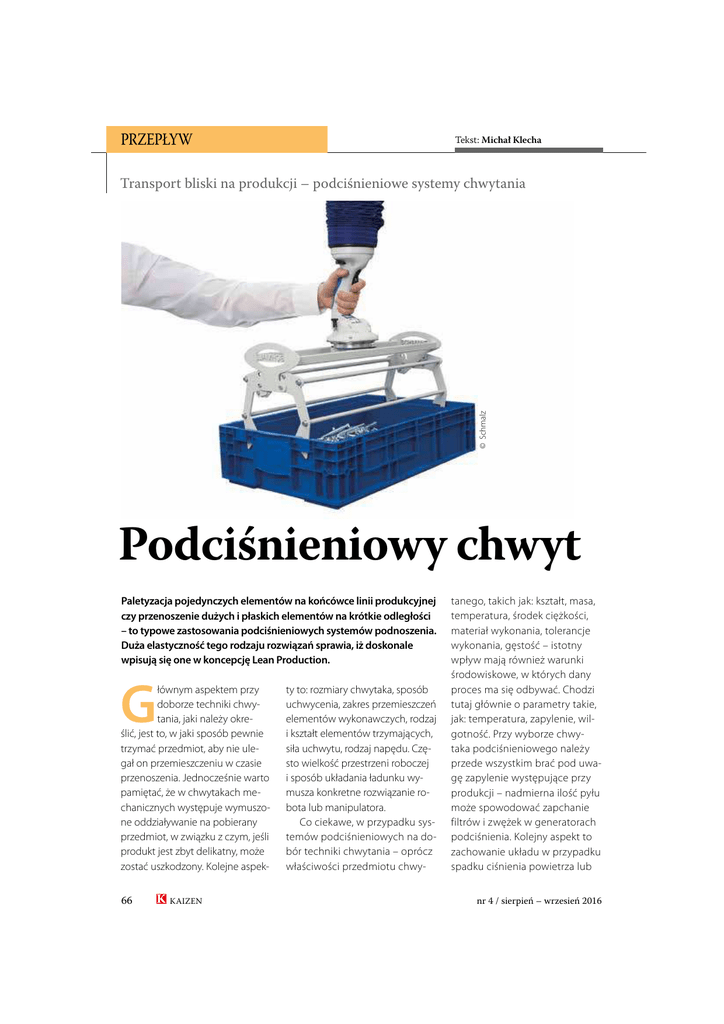 PRZEPŁYW Tekst: Michał Klecha © Schmalz Transport bliski na produkcji – podciśnieniowe systemy chwytania Podciśnieniowy chwyt Paletyzacja pojedynczych elementów na końcówce linii produkcyjnej czy przenoszenie dużych i płaskich elementów na krótkie odległości – to typowe zastosowania podciśnieniowych systemów podnoszenia. Duża elastyczność tego rodzaju rozwiązań sprawia, iż doskonale wpisują się one w koncepcję Lean Production. G łównym aspektem przy doborze techniki chwytania, jaki należy określić, jest to, w jaki sposób pewnie trzymać przedmiot, aby nie ulegał on przemieszczeniu w czasie przenoszenia. Jednocześnie warto pamiętać, że w chwytakach mechanicznych występuje wymuszone oddziaływanie na pobierany przedmiot, w związku z czym, jeśli produkt jest zbyt delikatny, może zostać uszkodzony. Kolejne aspek66 KAIZEN ty to: rozmiary chwytaka, sposób uchwycenia, zakres przemieszczeń elementów wykonawczych, rodzaj i kształt elementów trzymających, siła uchwytu, rodzaj napędu. Często wielkość przestrzeni roboczej i sposób układania ładunku wymusza konkretne rozwiązanie robota lub manipulatora. Co ciekawe, w przypadku systemów podciśnieniowych na dobór techniki chwytania – oprócz właściwości przedmiotu chwy- tanego, takich jak: kształt, masa, temperatura, środek ciężkości, materiał wykonania, tolerancje wykonania, gęstość – istotny wpływ mają również warunki środowiskowe, w których dany proces ma się odbywać. Chodzi tutaj głównie o parametry takie, jak: temperatura, zapylenie, wilgotność. Przy wyborze chwytaka podciśnieniowego należy przede wszystkim brać pod uwagę zapylenie występujące przy produkcji – nadmierna ilość pyłu może spowodować zapchanie filtrów i zwężek w generatorach podciśnienia. Kolejny aspekt to zachowanie układu w przypadku spadku ciśnienia powietrza lub nr 4 / sierpień – wrzesień 2016 zaniku zasilania elektrycznego generatorów podciśnienia – w takiej sytuacji chwytak podciśnieniowy upuści przenoszony ładunek, co może spowodować jego zniszczenie lub zagrożenie dla ludzi. Biorąc pod uwagę powyższe czynniki, technikę podciśnieniową najczęściej stosuje się do produktów szczelnie zapakowanych w opakowania, np. woreczki foliowe, kartony zaklejone taśmą klejącą lub klejem, metalowe puszki, wiaderka aluminiowe lub plastikowe itp. Ta technika dotyczy wszystkich produktów, których powierzchnia styku z chwytakiem jest płaska, nieporowata i umożliwia uszczelnienie się chwytaka podciśnieniowego. – Systemy podciśnieniowe umożliwiają transport praktycznie każdego spójnego elementu. Oferowane aktualnie rozwiązania można dopasować niemal do każdego kształtu oraz powierzchni przedmiotu, co przekłada się na uniwersalność ich zastosowań przy zapewnieniu odpowiedniej trwałości elementów wykonawczych – przekonuje Konrad Binienda, Konstruktor- mechanik w firmie WIKPOL. Na końcówkach linii roboty przemysłowe i manipulatory przeważnie wykorzystywane są do układania towaru na paletach lub gotowych, pojedynczo zapakowanych produktów w opakowania zbiorcze. Stąd kluczową determinantą zastosowania właściwej techniki chwytania jest opakowanie i materiał, z jakiego jest ono wykonane. W większości aplikacji pick&place, służących do pakowania opakowań jednostkowych w opakowania zbiorcze, stosuje się technikę podciśnieniową, ponieważ manipulowane produkty zapakowane są w szczelne opakowania foliowe Elastyczne rozwiązanie Podciśnieniowe systemy chwytania cechuje duża elastyczność w sytuacjach modyfikacji zachodzących na liniach produkcyjnych, dotyczących np. gabarytów czy Podciśnieniowe systemy chwytania cechuje duża elastyczność w sytuacjach modyfikacji zachodzących na liniach produkcyjnych, dotyczących np. gabarytów czy rodzaju asortymentu, który należy przemieścić. Stąd też wpisują się one bardzo dobrze w koncepcję szczupłego zarządzania procesami przemysłowymi. rodzaju asortymentu, który należy przemieścić. Stąd też wpisują się one bardzo dobrze w koncepcję szczupłego zarządzania procesami przemysłowymi. Jak przekonuje Konrad Binienda z firmy WIKPOL, dobrze skonfigurowany system potrafi pobierać palety, przekładki kartonowe i kartony zbiorcze bez konieczności dokonywania modyfikacji elementu chwytającego. Pozwala to na znaczną redukcję ilości elementów wykonawczych, wpływając w efekcie na obniżenie ceny instalacji. – Należy również podkreślić dużą elastyczność tych systemów w odniesieniu do zmian, np. wielkości opakowań. Zarówno w przypadku manipulatorów, jak i zrobotyzowanych aplikacji wystarczy tylko zmienić parametry punktów pobrania i odłożenia w celu dostosowania układu do nowych wymiarów. Z tego też powodu systemy podciśnieniowe są z powodzeniem stosowane w nowoczesnych liniach pakowania i paletyzacji – mówi Konrad Binienda. Elastyczne rozwiązania z zakresu podciśnieniowych systemów podnoszenia można znaleźć również w ofercie firmy Schmalz. Dzięki JumboFlex 50 można ergonomicznie podnosić i przenosić nawet małe pudełka o wadze do 50 kg. Ponadto ładunki mogą być chwytane w pionie, a następnie automatycznie przechylane o 90° do pozycji poziomej. – Dodatkowo dla przedsiębiorstw z przemysłu spożywczego proponujemy tubę w specjalnej wersji A2 spełniającej wymogi standardu kwasoodpornego. W codziennym użyciu gwarantujemy wysoką i optymalną funkcjonalność operacji podnosząco-przenoszących, dzięki temu, że tuba podnosząca JumboFlex może być obracana dookoła swojej osi bez żadnych ograniczeń i ponadto może być stosowana w połączeniu z lekkim żurawiem aluminiowym – mówi Agnieszka Wnuk, Marketing and Administration Manager w firmie Schmalz. Podnośniki JumboFlex są wykorzystywane we wszystkich branżach przemysłowych. To ergonomiczne urządzenie i proste w obsłudze zarówno dla prawoi leworę
