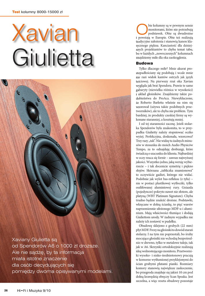 Test kolumny 8000-15000 zł Xavian Giulietta Xaviany Giulietta są od Spendorów A6 o 1000 zł droższe. Ale nie sądzę, by ta informacja miała istotne znaczenie dla osób decydujących się pomiędzy dwoma opisywanymi modelami. 26 Hi•Fi i Muzyka 9/10 O bie kolumny są w pewnym sensie monitorami, które nie potrzebują podstawek. Obie są dwudrożne i powstają w Europie. Obie też realizują tradycyjne założenia i stanowią kanon klasycznego piękna. Kanciastość dla dzisiejszych projektantów to chyba temat tabu, bo w każdych „nowoczesnych” kolumnach znajdziemy miłe dla oka zaokrąglenia. Budowa Tylko dlaczego miłe? Mnie akurat prostopadłościany się podobają i wcale mnie nie razi widok kantów ostrych jak język teściowej. Na pierwszy rzut oka Xavian wygląda jak brat Spendora. Prawie te same gabaryty (niewielka różnica w wysokości) i układ głośników. Znajdziemy także podobieństwa do ProAca. Niewykluczone, że Roberto Barletta właśnie na nim się wzorował (używa także podobnych przetworników), ale to chyba nie problem. Tym bardziej, że produkty czeskiej firmy są wykonane staranniej, a kosztują mniej. I od tej staranności zacznę. Jeżeli stolarka Spendorów była znakomita, to w przypadku Giulietty należy stopniować oczko wyżej. Perfekcyjna, doskonała, wzorcowa? Trzy razy „tak”. Nie widzę tu żadnych minusów w stosunku do moich Audio Physiców Tempo, za to odnajduję drobiazgi, które świadczą o szacunku do klienta. Najbardziej w oczy rzuca się fornir – zawsze najwyższej jakości. Wszystko jedno, jaką wersję wybierzecie – i tak docenicie symetrię i piękno słojów. Skórzana „tabliczka znamionowa” to oczywiście gadżet, którego nie widać. Podobnie jak wylot bas-refleksu (z tyłu) – nie w postaci plastikowej wytłoczki, tylko oszlifowanej aluminiowej rury. Gniazda (pojedyncze) pokryto nawet nie złotem, ale platyną (WBT Platinum Signature). Chyba trudno będzie znaleźć droższe. Podstawki, wkręcane w dolną ściankę, to pięć warstw naprzemiennie ułożonego MDF-u i aluminium. Mają właściwości tłumiące i dodają Giuliettom urody. W żadnym wypadku nie należy ich zostawić w pudełku. Obudowę sklejono z grubych (22 mm) płyt MDF. Frezy na głośniki to dowód starań stolarzy. I na tym nie poprzestali, bo śruby mocujące głośniki nie wchodzą bezpośrednio w drewno, tylko w metalowe tuleje, tak jak w A6. Skrzynki ortodoksyjnie realizują ideę wolnostojącego monitora. Przetworniki wysoko- i nisko-średniotonowy pracują w komorze wytłumionej przyklejonymi do ścian grubymi płatami pianki. Rozmiary komory stanowią największe zaskoczenie, bo przegroda znajduje się jakieś 10 cm pod dolną krawędzią obręczy Scan Speaka. Jest szczelna, a więc reszta obudowy pozostaje Test kolumny 8000-15000 zł „nieczynna”. Pod nią znalazła się pusta komora, druga przegroda i trzecia komora. To dosyć oryginalne podejście do pracy głośnika nisko-średniotonowego, bo raczej wszyscy starają się dać mu dużą obudowę, zamiast odcinać od drogocennych centymetrów sześciennych. Zanim przykręciłem podstawki, w dnie znalazłem otwór. Początkowo się przestraszyłem, bo nie lubię bas-refleksów dmuchających w podłogę, ale wczytując się w materiały producenta, znalazłem informację, że jest to tak zwana „dziura technologiczna”. Czyli rozwiązanie dzisiaj raczej zapomniane, ale pamiętam, że kiedyś stosowano je nagminnie. Otwór służy nie do wietrzenia i dmuchania, ale do wypełnienia komory wyprażonym piaskiem albo, jeszcze lepiej, śrutem ołowianym (można nawet kupić specjalny, „audiofilski”, różniący się od „zwykłego” wyłącznie ceną. Ten pierwszy ma jednak tę zaletę, że jest dostępny). W ten sposób małe kolumny podłogowe mogą „przytyć” o dodatkowe 30 kg i zyskują stabilność, prawie jak wańka-wstańka. Zwrotnica dzieli pasmo przy 2,2 kHz. Jest filtrem 1. rzędu i zawiera wyselekcjonowane komponenty z wysokiej półki. Wysyła sygnał do głośników nie byle drucikami, ale przewodami Supry. Głośniki stanowią top wśród sprzedawanych na wolnym rynku komponentów. Xavian nie wykonuje ich samodzielnie, ale zaopatruje się u Scan Speaka. Kopułka to Revelator D2905/970000 z tekstylną membraną i ekranowanym magnesem. Ma odlewany kołnierz i charakteryzuje się bardzo niską wartością rezonansu mechanicznego. Co ciekawe, jej cewka nie jest chłodzona ferrofluidem. Głośnik nisko-średniotonowy (Scan Speak 15W/8531K00) ma charakterystyczną, ponacinaną papierową membranę, dodatkowo nasączoną tłumiącym lepiszczem. Lekki odlewany kosz dźwiga potężny i ciężki jak diabli magnes, większy od samej membrany. Parametry są jeszcze mniej przyjazne wzmacniaczom niż u Spendora. Nominalna impedancja jest wprawdzie taka sama, ale skuteczność to tylko 85 dB. Górną granicę mocy producent określa na 150 W, ale to bzdura. Wszystkie Xaviany są bardzo wymagające wobec wzmacniaczy i potrzebują prądu, jak płuca powietrza. Nawet najtańsze monitory Barletty nie tolerują NAD-ów, Marantzów i Roteli za mniej niż 2000 zł/szt. Jeżeli chcecie dokupić do Giulietty elektronikę po 5000 zł/klocek, to kiepski pomysł. Te kolumny potrzebują rzetelnego napędu Xaviany to tak naprawdę monitory w podłogowej obudowie. i najlepiej się sprawdzą jako najtańsze ogniwo w systemie. Mają potencjał, którego grzech nie wykorzystać. Weźcie to sobie do serca i nie weryfikujcie testu na podstawie odsłuchu z piecykiem ze średniej półki. Julka odwdzięczy się dopiero wtedy, gdy zafundujecie jej Romea ze szlachetnego rodu. Musi też mieć muskuły ze stali. Podsumowanie „śrubkologii” zamknę jednym słowem, które Roberto zapewne zna: bravissimo! Osobom, które zechcą kompletować system, zaczynając od kolumn, powiem: BMW, czyli: będziecie mieć wydatki. W pełni usprawiedliwione, ale o tym dalej. Szerokie metalowe podstawki stabilizują kolu