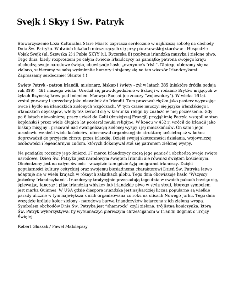Svejk i Skyy i Św. Patryk Stowarzyszenie Loża Kulturalna Stare Miasto zaprasza serdecznie w najbliższą sobotę na obchody Dnia Św. Patryka. W dwóch lokalach mieszczących się przy piotrkowskiej starówce - Hospodzie Vojak Svejk (ul. Szewska 2) i Pubie SKYY (ul. Rycerska 8) popłynie irlandzka muzyka i zielone piwo. Tego dnia, kiedy rozproszeni po całym świecie Irlandczycy na pamiątkę patrona swojego kraju obchodzą swoje narodowe święto, obowiązuje hasło „everyone's Irish”. Dlatego ubieramy się na zielono, zabieramy ze sobą wyśmienite humory i stajemy się na ten wieczór Irlandczykami. Zapraszamy serdecznie! Slainte !!! Święty Patryk - patron Irlandii, misjonarz, biskup i święty - żył w latach 385 (niektóre źródła podają rok 389) - 461 naszego wieku. Urodził się prawdopodobnie w Szkocji w rodzinie Brytów mających w żyłach Rzymską krew pod imieniem Maewyn Succat (co znaczy “wojowniczy”). W wieku 16 lat został porwany i sprzedany jako niewolnik do Irlandii. Tam pracował ciężko jako pasterz wypasając owce i bydło na irlandzkich zielonych wzgórzach. W tym czasie nauczył się języka irlandzkiego i irlandzkich obyczajów, wtedy też zwrócił się w kierunku religii by znaleźć w niej pocieszenie. Gdy po 6 latach niewolniczej pracy uciekł do Galii (dzisiejszej Francji) przyjął imię Patryk, wstąpił w stan kapłański i przez wiele długich lat pobierał nauki religijne. W końcu w 432 r. wrócił do Irlandii jako biskup misyjny i pracował nad ewangelizacją zielonej wyspy i jej mieszkańców. On sam i jego uczniowie wznieśli wiele kościołów, uformował organizacyjnie strukturę kościelną aż w końcu doprowadził do przyjęcia chrztu przez Irlandię. Dzięki swojej skuteczności działania, wojowniczej osobowości i legendarnym cudom, których dokonywał stał się patronem zielonej wyspy. Na pamiątkę rocznicy jego śmierci 17 marca Irlandczycy czczą jego pamięć i obchodzą swoje święto narodowe. Dzień Św. Patryka jest narodowym świętem Irlandii ale również świętem kościelnym. Obchodzony jest na całym świecie - wszędzie tam gdzie żyją emigranci irlandzcy. Dzięki popularności kultury celtyckiej oraz swojemu biesiadnemu charakterowi Dzień Św. Patryka łatwo adaptuje się w wielu krajach w różnych zakątkach globu. Tego dnia obowiązuje hasło “Wszyscy jesteśmy Irlandczykami”. Irlandczycy tradycyjnie przesiadują tego dnia w swoich pubach bawiąc się, śpiewając, tańcząc i pijąc irlandzką whiskey lub irlandzkie piwo w stylu stout, którego symbolem jest marka Guinnes. W USA gdzie diaspora irlandzka jest najbardziej liczna popularne są wielkie parady uliczne w tym największa z nich organizowana co roku na ulicach Nowego Jorku. Tego dnia wszędzie króluje kolor zielony - narodowa barwa Irlandczyków kojarzona z ich zieloną wyspą. Symbolem obchodów Dnia Św. Patryka jest “shamrock” czyli zielona, trójlistna koniczynka, którą Św. Patryk wykorzystywał by wytłumaczyć pierwszym chrześcijanom w Irlandii dogmat o Trójcy Świętej. Robert Głuszak / Paweł Małolepszy