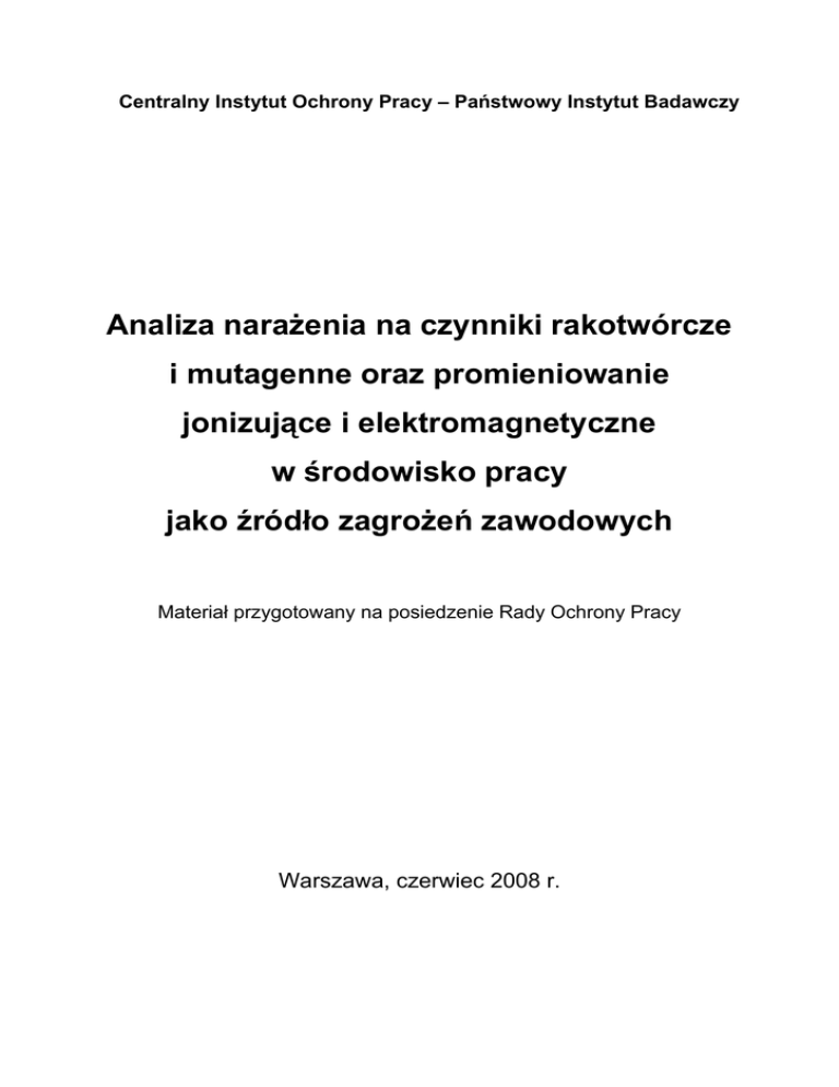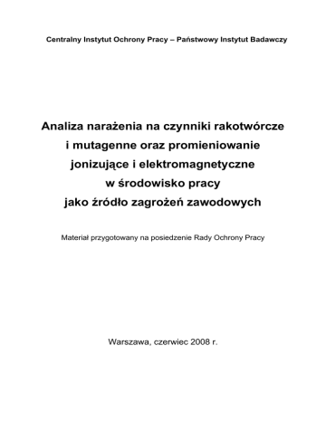 Centralny Instytut Ochrony Pracy – Państwowy Instytut Badawczy Analiza narażenia na czynniki rakotwórcze i mutagenne oraz promieniowanie jonizujące i elektromagnetyczne w środowisko pracy jako źródło zagrożeń zawodowych Materiał przygotowany na posiedzenie Rady Ochrony Pracy Warszawa, czerwiec 2008 r. Materiał przygotowany na posiedzenie Rady Ochrony Pracy Zagrożenia elektromagnetyczne w środowisku pracy dr inż. Jolanta Karpowicz, dr inż. Krzysztof Gryz Pracownia Zagrożeń Elektromagnetycznych Centralny Instytut Ochrony Pracy - Państwowy Instytut Badawczy, Warszawa Wprowadzenie Pole elektromagnetyczne, w niektórych przypadkach nazywane również promieniowaniem elektromagnetycznym, jest jednym z fizycznych czynników środowiska. Każde urządzenie elektryczne jest źródłem pola elektromagnetycznego, które może być wytwarzane w sposób zamierzony lub jako efekt uboczny działania tego urządzenia. Powszechne występowanie pól elektromagnetycznych w środowisku pracy obliguje pracodawców, służby kontrolne i pracowników do podejmowania kompleksowych działań zmierzających do identyfikacji źródeł i charakterystyki wytwarzanych przez nie pól, oceny ich istotności dla bezpieczeństwa i higieny pracy oraz ograniczenia zagrożenia wszędzie, gdzie to jest konieczne. Szacunkowe dane wskazują, że w Polsce co najmniej kilkadziesiąt tysięcy pracowników podlega ekspozycji zawodowej na pola elektromagnetyczne. Pole elektromagnetyczne może wpływać na ludzi oddziałując bezpośrednio na organizm eksponowanego człowieka lub pośrednio, na skutek oddziaływania na organizm energii pól zaabsorbowanej przez eksponowane obiekty [11, 23]. Oddziałując bezpośrednio na organizm eksponowanego człowieka [9, 21, 26-28], w czasie ekspozycji (zależnie od jej charakterystyki) pole może wywołać: - indukowane w ciele prądy elektryczne, które mogą spowodować stymulację tkanki nerwowej i mięśniowej - lub ogrzewanie tkanek przez pochłoniętą w nich energię pól, która może spowodować wzrost temperatury - tzw. efekt termiczny. Badania naukowe dotyczące ryzyka pogorszenia stanu zdrowia w wyniku wieloletniej, chronicznej ekspozycji na pola elektromagnetyczne dotyczą m.in. zwiększenia zagrożenia wystąpienia takich negatywnych skutków zdrowotnych, jak: zaburzenia funkcjonowania układu nerwowego, krwionośnego, odpornościowego lub zwiększonej częstotliwości występowania chorób nowotworowych (np. sklasyfikowanie pól magnetycznych małych częstotliwości jako czynnika prawdopodobnie rakotwórczego [20], prawdopodobne skutki neurodegeneracyjne ekspozycji chronicznej [12, 13], prawdopodobne zaburzenia funkcjonowania układu krążenia wskutek ekspozycji chronicznej [2]). Najsłabiej zostały zbadane skutki zdrowotne ekspozycji na pole magnetostatyczne i elektromagnetyczne średnich częstotliwości. Z tego powodu, w monografii Światowej Organizacji Zdrowia [29, 31] podano, że brak jest obecnie dostatecznych podstaw naukowych do określenia ryzyka zdrowotnego takiej ekspozycji. Kontynuacja badań naukowych celem ustalenia skali zagrożenia zdrowia od takich pól jest wśród priorytetów badań międzynarodowych. W przypadku ekspozycji o wysokim poziomie, pole elektromagnetyczne powoduje również reakcje organizmu, które mogą znacznie utrudniać wykonywanie precyzyjnej pracy zawodowej, takie jak: efekty słuchowe, tzw. efekt Freya [28], wrażenia wzrokowe, magneto i 1 elektrofosfeny [23], zawroty głowy, nudności, zaburzenia koordynacji wzrokowo-ruchowej [29, 31]. Zagrożenie dla pracowników może wynikać również z nieprzewidzianych reakcji na przepływ prądów indukowanych lub kontaktowych. Może to być istotne zagrożenie np. w czasie pracy na wysokości, w otoczeniu nadajników radiowych. Pole elektromagnetyczne może stwarzać zagrożenie dla ludzi także na skutek oddziaływania na infrastrukturę techniczną, ponieważ prądy indukowane przez pola elektromagnetyczne w urządzeniach mogą być przyczyną m.in. zakłóceń pracy automatycznych urządzeń sterujących, detonacji urządzeń elektrowybuchowych oraz przyczyną pożarów i eksplozji spowodowanych zapaleniem się materiałów łatwo palnych lub wybuchowych od iskier wywoływanych przepływem prądu indukowanego lub wyładowaniem ładunku elektrostatycznego. Prądy indukowane lub kontaktowe przepływające w organizmie mogą również zakłócać pracę aktywnych implantów medycznych, takich jak stymulatory serca, bądź oddziaływać na funkcjonowanie w organizmie implantów mechanicznych. Czynnikiem związanym z polami elektromagnetycznymi, jest również elektryczność statyczna. Wyładowania elektrostatyczne mogą powodować rażenie pracownika, zakłócenia w działaniu urządzeń elektrycznych i elektronicznych, a również groźnych eksplozji materiałów. Biorąc pod uwagę wymagania dyrektywy ramowej 89/391/EWG oraz dostępne, bogate dane naukowe, nie ulega wątpliwości, że dla właściwej ochrony przed negatywnym bezpośrednim i pośrednim oddziaływaniem pól elektromagnetycznych na zdrowie pracowników i ich zdolność do poprawnego wykonywania czynności zawodowych, konieczne jest objęcie tego czynnika środowiskowego działaniami wynikającymi z systemu bezpieczeństwa i higieny pracy. Ekspozycja na pola elektromagnetyczne powinna być w związku z przytoczonymi konsekwencjami dla zdrowia i bezpieczeństwa pracowników ograniczana i nadzorowana. Związane z tym zasady postępowania regulują postanowienia przepisów bezpieczeństwa i higieny pracy (BHP), zarówno krajowe rozporządzenia m.in. ministra właściwego ds. pracy (np. rozporządzenie w sprawie NDS i NDN) [24] oraz dyrektywy europejskie (m.in. 89/391/EWG, 2004/40/WE) [3, 4]. Źródła pól elektromagnetycznych Najbardziej rozpowszechnione źródła pól elektromagnetycznych spotykane w środowisku pracy to przesyłowo-rozdzielcze urządzenia energetyczne i instalacje zasilające, telekomunikacja
