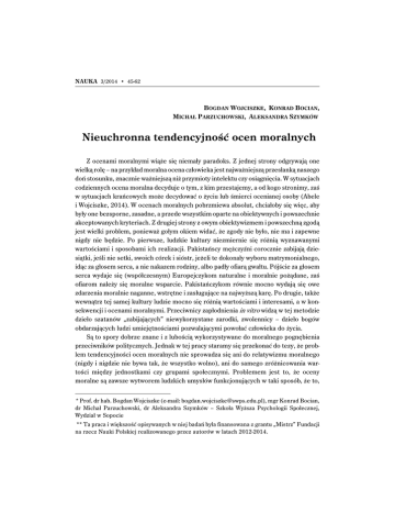 NAUKA 3/2014 • 45-62 BOGDAN WOJCISZKE, KONRAD BOCIAN, MICHAŁ PARZUCHOWSKI, ALEKSANDRA SZYMKÓW Nieuchronna tendencyjność ocen moralnych Z ocenami moralnymi wiąże się niemały paradoks. Z jednej strony odgrywają one wielką rolę – na przykład moralna ocena człowieka jest najważniejszą przesłanką naszego doń stosunku, znacznie ważniejszą niż przymioty intelektu czy osiągnięcia. W sytuacjach codziennych ocena moralna decyduje o tym, z kim przestajemy, a od kogo stronimy, zaś w sytuacjach krańcowych może decydować o życiu lub śmierci ocenianej osoby (Abele i Wojciszke, 2014). W ocenach moralnych pobrzmiewa absolut, chciałoby się więc, aby były one bezsporne, zasadne, a przede wszystkim oparte na obiektywnych i powszechnie akceptowanych kryteriach. Z drugiej strony z owym obiektywizmem i powszechną zgodą jest wielki problem, ponieważ gołym okiem widać, że zgody nie było, nie ma i zapewne nigdy nie będzie. Po pierwsze, ludzkie kultury niezmiernie się różnią wyznawanymi wartościami i sposobami ich realizacji. Pakistańscy mężczyźni corocznie zabijają dziesiątki, jeśli nie setki, swoich córek i sióstr, jeżeli te dokonały wyboru matrymonialnego, idąc za głosem serca, a nie nakazem rodziny, albo padły ofiarą gwałtu. Pójście za głosem serca wydaje się (współczesnym) Europejczykom naturalne i moralnie pożądane, zaś ofiarom należy się moralne wsparcie. Pakistańczykom równie mocno wydają się owe zdarzenia moralnie naganne, wstrętne i zasługujące na najwyższą karę. Po drugie, także wewnątrz tej samej kultury ludzie mocno się różnią wartościami i interesami, a w konsekwencji i ocenami moralnymi. Przeciwnicy zapłodnienia in vitro widzą w tej metodzie dzieło szatanów „zabijających” niewykorzystane zarodki, zwolennicy – dzieło bogów obdarzających ludzi umiejętnościami pozwalającymi powołać człowieka do życia. Są to spory dobrze znane i z lubością wykorzystywane do moralnego pognębienia przeciwników politycznych. Jednak w tej pracy staramy się przekonać do tezy, że problem tendencyjności ocen moralnych nie sprowadza się ani do relatywizmu moralnego (nigdy i nigdzie nie bywa tak, że wszystko wolno), ani do samego zróżnicowania wartości między jednostkami czy grupami społecznymi. Problemem jest to, że oceny moralne są zawsze wytworem ludzkich umysłów funkcjonujących w taki sposób, że to, * Prof. dr hab. Bogdan Wojciszke (e-mail: [email protected]), mgr Konrad Bocian, dr Michał Parzuchowski, dr Aleksandra Szymków – Szkoła Wyższa Psychologii Społecznej, Wydział w Sopocie ** Ta praca i większość opisywanych w niej badań była finansowana z grantu „Mistrz” Fundacji na rzecz Nauki Polskiej realizowanego przez autorów w latach 2012-2014. 46 B. Wojciszke, K. Bocian, M. Parzuchowski, A. Szymków co dla jednego człowieka jest moralne, dla innego może być obojętne lub niemoralne. Najpierw przedstawimy kluczowe zróżnicowanie procesów umysłowych na automatyczne i kontrolowane, potem zarysujemy wyniki sporu między intuicjonizmem i racjonalizmem w ocenach moralnych, wreszcie opiszemy pokrótce dwie linie naszych własnych badań sugerujących, że tendencyjność ocen moralnych jest w zasadzie nieuchronna, bowiem wynika z naturalnej dwoistości ludzkich procesów myślenia. Dwa rodzaje procesów psychicznych W psychologii ostatniego ćwierćwiecza wielką popularnością cieszy się podział procesów psychicznych na automatyczne i kontrolowane. Automatyczny lub kontrolowany przebieg mogą mieć prawie wszystkie operacje psychiczne, jak spostrzeganie, doświadczanie emocji, formułowanie ocen i decyzji, a nawet uczenie się, pamięć i myślenie (Strack i Deutsch, 2004). W postaci idealnej proces automatyczny ma cztery własności odróżniające go od kontrolowanego: (1) pojawia się bez intencji człowieka; (2) pojawia się w odpowiedzi na pewne bodźce mimo lub wbrew woli człowieka, (3) jest bezwysiłkowy, szybki i nie pochłania operacyjnych zasobów umysłu (uwagi i pamięci roboczej) oraz (4) pojawia się i przebiega poza świadomością człowieka, który nie tylko nie sprawdza jego przebiegu, ale nawet nie zdaje sobie sprawy z jego występowania. Natomiast proces kontrolowany ma w postaci idealnej charakter intencjonalny, dowolny, wysiłkowy i powolny oraz jest uświadamiany przez człowieka. Dobrym przykładem procesu kontrolowanego jest kierowanie samochodem, kiedy dopiero uczymy się jeździć – ruszenie ze skrzyżowania to ciąg żmudnych i boleśnie świadomych decyzji (wcisnąć sprzęgło, wrzucić jedynkę, dodać gazu itd.), które są powolne i pochłaniają całą naszą uwagę. Natomiast kierowanie samochodem, kiedy już umiemy jeździć, jest przykładem procesu zautomatyzowanego – ruszenie ze skrzyżowania zajmuje sekundę i nie wymaga żadnych decyzji, tak więc nasza uwaga może być skierowana na co innego, na przykład prowadzenie rozmowy z pasażerem i słuchanie muzyki. Wiele procesów automatycznych, to procesy niegdyś kontrolowane, które uległy automatyzacji wskutek ich wielokrotnego powtarzania z dobrym skutkiem. Liczne badania empiryczne pokazały, że wymienione właściwości automatyzmów wcale nie zawsze ze sobą współwystępują, co skłoniło psychologów do wniosku, że mamy tu do czynienia nie z dwoma rozłącznymi typami procesów, lecz raczej z pewnym wymiarem, na którym można ułożyć procesy psychiczne. Na jednym krańcu tego wymiaru znajdują się procesy spełniające wszystkie kryteria automatyzmu, na przykład formułowanie ocen spostrzeganego człowieka pod wpływem podprogowej (superkrótkiej) ekspozycji słowa „wrogość” – wydający oceny człowiek nie zdaje sobie sprawy z aktywizacji tej kategorii ani z tego, że wpływa ona na jego oceny. Inne procesy spełniają tylko niektóre kryteria automatyczności – jak wpływ nastroju na oceny, kiedy to Nieuchronna tendencyjność ocen moralnych 47 cz