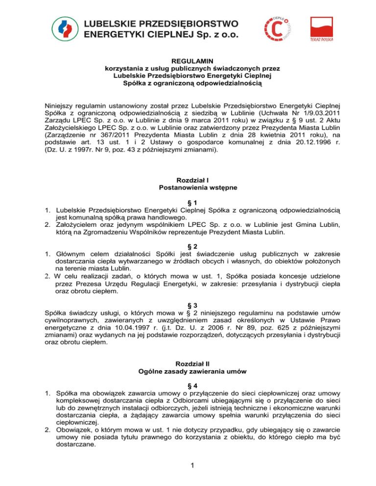 REGULAMIN korzystania z usług publicznych świadczonych przez Lubelskie Przedsiębiorstwo Energetyki Cieplnej Spółka z ograniczoną odpowiedzialnością Niniejszy regulamin ustanowiony został przez Lubelskie Przedsiębiorstwo Energetyki Cieplnej Spółka z ograniczoną odpowiedzialnością z siedzibą w Lublinie (Uchwała Nr 1/9.03.2011 Zarządu LPEC Sp. z o.o. w Lublinie z dnia 9 marca 2011 roku) w związku z § 9 ust. 2 Aktu ZałoŜycielskiego LPEC Sp. z o.o. w Lublinie oraz zatwierdzony przez Prezydenta Miasta Lublin (Zarządzenie nr 367/2011 Prezydenta Miasta Lublin z dnia 28 kwietnia 2011 roku), na podstawie art. 13 ust. 1 i 2 Ustawy o gospodarce komunalnej z dnia 20.12.1996 r. (Dz. U. z 1997r. Nr 9, poz. 43 z późniejszymi zmianami). Rozdział I Postanowienia wstępne §1 1. Lubelskie Przedsiębiorstwo Energetyki Cieplnej Spółka z ograniczoną odpowiedzialnością jest komunalną spółką prawa handlowego. 2. ZałoŜycielem oraz jedynym wspólnikiem LPEC Sp. z o.o. w Lublinie jest Gmina Lublin, którą na Zgromadzeniu Wspólników reprezentuje Prezydent Miasta Lublin. §2 1. Głównym celem działalności Spółki jest świadczenie usług publicznych w zakresie dostarczania ciepła wytwarzanego w źródłach obcych i własnych, do obiektów połoŜonych na terenie miasta Lublin. 2. W celu realizacji zadań, o których mowa w ust. 1, Spółka posiada koncesje udzielone przez Prezesa Urzędu Regulacji Energetyki, w zakresie: przesyłania i dystrybucji ciepła oraz obrotu ciepłem. §3 Spółka świadczy usługi, o których mowa w § 2 niniejszego regulaminu na podstawie umów cywilnoprawnych, zawieranych z uwzględnieniem zasad określonych w Ustawie Prawo energetyczne z dnia 10.04.1997 r. (j.t. Dz. U. z 2006 r. Nr 89, poz. 625 z późniejszymi zmianami) oraz wydanych na jej podstawie rozporządzeń, dotyczących przesyłania i dystrybucji oraz obrotu ciepłem. Rozdział II Ogólne zasady zawierania umów §4 1. Spółka ma obowiązek zawarcia umowy o przyłączenie do sieci ciepłowniczej oraz umowy kompleksowej dostarczania ciepła z Odbiorcami ubiegającymi się o przyłączenie do sieci lub do zewnętrznych instalacji odbiorczych, jeŜeli istnieją techniczne i ekonomiczne warunki dostarczania ciepła, a Ŝądający zawarcia umowy spełnia warunki przyłączenia do sieci ciepłowniczej. 2. Obowiązek, o którym mowa w ust. 1 nie dotyczy przypadku, gdy ubiegający się o zawarcie umowy nie posiada tytułu prawnego do korzystania z obiektu, do którego ciepło ma być dostarczane. 1 Rozdział III Zasady korzystania z ciepła dostarczanego miejską siecią ciepłowniczą 1. 2. 3. 4. §5 SprzedaŜ ciepła odbywa się na podstawie umowy kompleksowej dostarczania ciepła, łączącej elementy umowy sprzedaŜy ciepła i umowy o świadczenie usług przesyłowych. Umowa, o której mowa w ust. 1, stanowi wzorzec umowny w rozumieniu przepisów prawa cywilnego i jej zawarcie następuje poprzez podpisanie przez Odbiorcę, stosowanego w Spółce wzorca umownego. Wzorzec umowny dostępny jest w lokalu Spółki (Dział Obsługi Klienta) oraz na stronie internetowej Spółki (www.lpec. pl). W uzasadnionych przypadkach istnieje moŜliwość negocjowania przez Odbiorcę warunków umowy, o której mowa w ust. 3. §6 1. Umowa kompleksowa dostarczania ciepła zawierana jest na wniosek Odbiorcy i moŜe być zawarta po: a) spełnieniu przez Odbiorcę wszystkich wymogów technicznych i prawnych, b) złoŜeniu przez Odbiorcę zlecenia na dostarczanie ciepła stanowiącego integralną część umowy. Wzór zlecenia określa Spółka. §7 Umowę kompleksową dostarczania ciepła strony zawierają na czas nieokreślony z moŜliwością jej wypowiedzenia przez kaŜdą ze stron z zachowaniem 3 miesięcznego okresu wypowiedzenia, który liczy się od pierwszego dnia miesiąca następującego po miesiącu, w którym nastąpiło złoŜenie wypowiedzenia. Na wniosek Odbiorcy umowa moŜe być zawarta na czas określony. Rozdział IV Zasady przyłączania podmiotów do sieci ciepłowniczej 1. 2. 3. 4. 5. 6. §8 Przyłączenie podmiotów do sieci ciepłowniczej następuje po spełnieniu technicznych warunków, określonych przez Spółkę w „warunkach przyłączenia”, na podstawie zawartej przez strony umowy przyłączeniowej. Z wnioskiem o wydanie warunków przyłączenia moŜe wystąpić kaŜdy, kto posiada tytuł prawny do korzystania z obiektu, w którym będą uŜytkowane urządzenia i instalacje podlegające przyłączeniu. Spółka określa warunki przyłączenia w terminie nie dłuŜszym niŜ 30 dni od daty złoŜenia kompletnych dokumentów i przekazuje wnioskodawcy wraz z projektem umowy o przyłączenie. Warunki przyłączenia obowiązują dwa lata od dnia ich wydania, Wzory wniosku , o którym mowa w ust. 2 określa Spółka. Do wniosku o wydanie warunków przyłączenia naleŜy załączyć: a) dokument potwierdzający tytuł prawny wnioskodawcy do korzystania z obiektu, do którego dostarczane będzie ciepło, b) plan zabudowy lub szkic sytuacyjny, określający usytuowanie obiektu, w którym znajdują się przyłączane urządzenia, instalacje odbiorcze, w stosunku do istniejącej sieci cieplnej, zewnętrznej instalacji odbiorczej za węzłem grupowym oraz innych obiektów i urządzeń uzbrojenia terenu, c) jeśli wnioskodawca posiada osobowość prawną lub jest osobą fizyczną prowadzącą działalność gospodarczą naleŜy dołączyć dane rejestrowe: kopia KRS, NIP, REGON. 2 1. 2. 3. 4. 5. 1. 2. §9 Po zaakceptowaniu przez Odbiorcę warunków przyłączenia, o których mowa w § 8 niniejszego regulaminu, Spółka moŜe zawrzeć z Odbiorcą umowę o przyłączenie do sieci ciepłowniczej. Postanowienia umowy o przyłączenie do sieci ciepłowniczej, ustalane są przez strony umowy w drodze negocjacji, z uwzględnieniem zasad określonych w przepisach Rozporządzenia Ministra Gospodarki z dnia 15.01.2007 r. „w sprawie szczegółowych warunków funkcjonowania systemów ciepłowniczych (