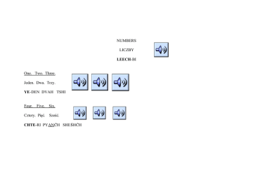 NUMBERS LICZBY LEECH-BI One. Two. Three. Jeden. Dwa. Trzy. YE-DEN DVAH TSHI Four. Five. Cztery. Piue. Six. Sze³e. CHTE-RI PYANdH SHE²HdH