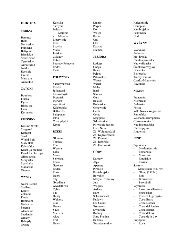 EUROPA MORZA Barentsa Białe Norweskie Północne Bałtyckie Irlandzkie Śródziemne Tyrreńskie Adriatyckie Jońskie Egejskie Czarne Marmara Azowskie ZATOKI Botnicka Fińska Ryska Biskajska Lwia Koryncka CIEŚNINY Karskie Wrota Skagerrak Kattegat Sund Wielki Bełt Mały Bełt Kaletańska Kanał La Manche Kanał Św. Jerzego Gibraltarska Mesyńska Sycylijska Maltańska Otranto WYSPY Nowa Ziemia Svalbard Lofoty Zelandia Fionia Bornholm Gotlandia Sarema Alandzkie Szetlandy Orkady Hebrydy Owcze Korsyka Sardynia Baleary - Majorka - Minorka Liparyjskie Elba Sycylia Malta Jońskie Cyklady Eubea Sporady Północne Rodos Kreta PÓŁWYSPY Skandynawski Kolski Jutlandzki Kornwalijski Bretoński Iberyjski Apeniński Kalabryjski Bałkański Peloponez Istria Chalcydycki Krym RZEKI Glomma Tamiza Ren Wezera Łaba Moza Sekwana Loara Garonna Rodan Ebro Duero Tag Gwadiana Gwadalkiwir Tyber Pad Dunaj Wełtawa Cisa Drawa Sawa Marusza Aluta Prut Dniestr Dniepr Prypeć Don Wołga Kama Ural Oka Dźwina Niemen JEZIORA Ładoga Onega Ilmen Pejpus Pskowskie Wetter Wener Melar Inari Saimaa Oulu Balaton Bodeńskie Genewskie Garda Como Maggiore Szkoderskie Plitwickie Jeziora Loch Ness Zb. Wołgogradzki Zb. Kujbyszewski Zb. Kamski Zb. Rybiński Zb. Kachowski GÓRY Karpaty Alpy Apeniny Pireneje Kantabryjskie Betyckie Masyw Centralny Jura Wogezy Ardeny Harz Schwarzwald Rudawy Las Czeski Szumawa Dynarskie Rodopy Stara Płanina Bałkany Skandynawskie Kaledońskie Grampian Kambryjskie Pennińskie Ural WYŻYNY Wołyńska Podolska Mołdawska Naddnieprzańska Nadwołżańska Środkoworosyjska Doniecka Białoruska Transylwańska Czesko-Morawska Bawarska NIZINY Francuska Niemiecka Padańska Polska Wlk. Nizina Węgierska Rumuńska Wschodnioeuropejska Czarnomorska Naddnieprzańska Nadkaspijska Angielska INNE Pojezierza: - Meklemburskie - Pomorskie - Mazurskie - Żmudzkie - Fińskie Szczyty: - Mont Blanc (4807m) - Olimp (2917m) - Etna - Wezuwiusz - Stromboli Wybrzeża: - Lazurowe (Riwiera Francuska) - Riwiera Liguryjska - Costa Brava - Costa Dorada - Costa del Azahar - Costa Blanca - Costa del Sol - Costa de la Lux Przylądki: - Roca - Nordkapp (Półn.) Matapan MIASTA Kłajpeda Kowno Troki Druskienniki Grodno Lwów Kamieniec Podolski Stanisławów Odessa Jałta Królewiec Sankt Petersburg Katyń Brno Ołomuniec Karlowe Vary Mariańskie Łaźnie Franciszkowe Łaźnie Poprad Bardejów Eger Tokaj Debreczyn Konstanca Braszów Jassy Warna Złote Piaski Delfy Saloniki Korynt Postojna Prisztina Medjugorje Dubrownik Rijeka Split Genua Turyn Mediolan Werona Wenecja Triest Padwa Bolonia Florencja Piza Loretto Asyż Cassino Neapol Mesyna Palermo Toledo Barcelona Kordoba Grenada Sewilla Santiago de Compostela Fatima Le Mont-Saint-Michel Verdun Lyon Marsylia Lozanna Carcassone Nicea Cannes La Salette (k. Grenoble) Lourdes Strasburg Zurych Lucerna Lozanna Salzburg Innsbruck Graz Hamburg Monachium Dachau Akwizgran Ulm Drezno Lipsk Kolonia Rotterdam Antwerpia Arnhem Belfast Glasgow Birmingham Manchester Edynburg York Narwik PAŃSTWA STOLICE