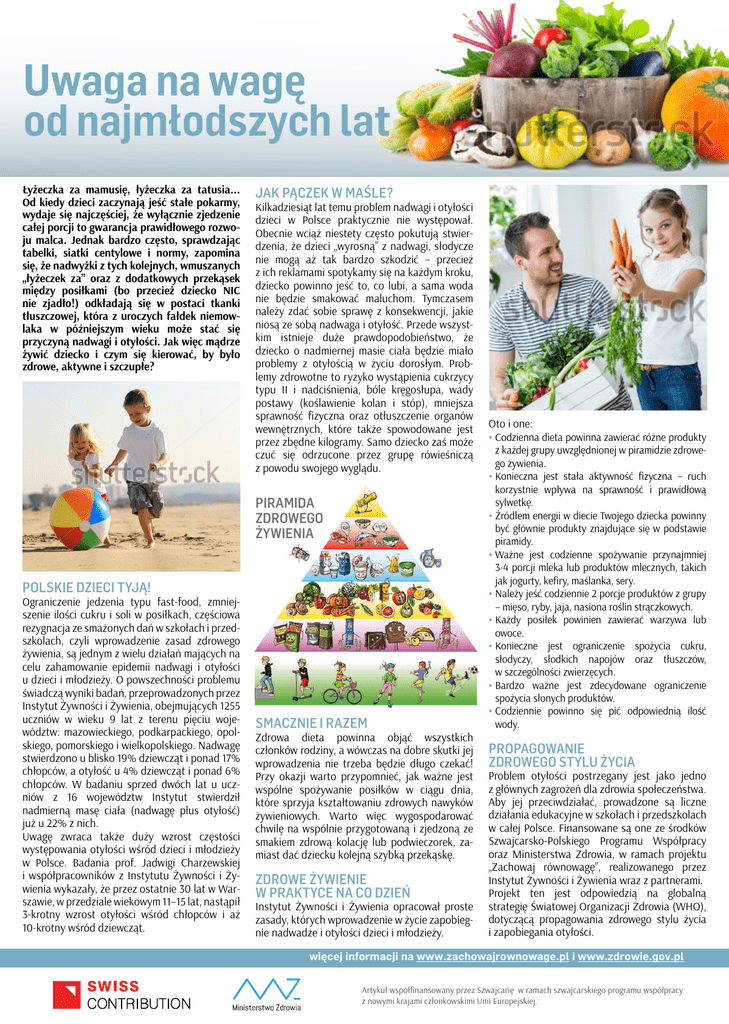 Uwaga na wagę od najmłodszych lat Łyżeczka za mamusię, łyżeczka za tatusia... Od kiedy dzieci zaczynają jeść stałe pokarmy, wydaje się najczęściej, że wyłącznie zjedzenie całej porcji to gwarancja prawidłowego rozwoju malca. Jednak bardzo często, sprawdzając tabelki, siatki centylowe i normy, zapomina się, że nadwyżki z tych kolejnych, wmuszanych „łyżeczek za” oraz z dodatkowych przekąsek między posiłkami (bo przecież dziecko NIC nie zjadło!) odkładają się w postaci tkanki tłuszczowej, która z uroczych fałdek niemowlaka w późniejszym wieku może stać się przyczyną nadwagi i otyłości. Jak więc mądrze żywić dziecko i czym się kierować, by było zdrowe, aktywne i szczupłe? Jak pączek w maśle? Kilkadziesiąt lat temu problem nadwagi i otyłości dzieci w Polsce praktycznie nie występował. Obecnie wciąż niestety często pokutują stwierdzenia, że dzieci „wyrosną” z nadwagi, słodycze nie mogą aż tak bardzo szkodzić – przecież z ich reklamami spotykamy się na każdym kroku, dziecko powinno jeść to, co lubi, a sama woda nie będzie smakować maluchom. Tymczasem należy zdać sobie sprawę z konsekwencji, jakie niosą ze sobą nadwaga i otyłość. Przede wszystkim istnieje duże prawdopodobieństwo, że dziecko o nadmiernej masie ciała będzie miało problemy z otyłością w życiu dorosłym. Problemy zdrowotne to ryzyko wystąpienia cukrzycy typu II i nadciśnienia, bóle kręgosłupa, wady postawy (koślawienie kolan i stóp), mniejsza sprawność fizyczna oraz otłuszczenie organów wewnętrznych, które także spowodowane jest przez zbędne kilogramy. Samo dziecko zaś może czuć się odrzucone przez grupę rówieśniczą z powodu swojego wyglądu. Piramida zdrowego żywienia Polskie dzieci tyją! Ograniczenie jedzenia typu fast-food, zmniejszenie ilości cukru i soli w posiłkach, częściowa rezygnacja ze smażonych dań w szkołach i przedszkolach, czyli wprowadzenie zasad zdrowego żywienia, są jednym z wielu działań mających na celu zahamowanie epidemii nadwagi i otyłości u dzieci i młodzieży. O powszechności problemu świadczą wyniki badań, przeprowadzonych przez Instytut Żywności i Żywienia, obejmujących 1255 uczniów w wieku 9 lat z terenu pięciu województw: mazowieckiego, podkarpackiego, opolskiego, pomorskiego i wielkopolskiego. Nadwagę stwierdzono u blisko 19% dziewcząt i ponad 17% chłopców, a otyłość u 4% dziewcząt i ponad 6% chłopców. W badaniu sprzed dwóch lat u uczniów z 16 województw Instytut stwierdził nadmierną masę ciała (nadwagę plus otyłość) już u 22% z nich. Uwagę zwraca także duży wzrost częstości występowania otyłości wśród dzieci i młodzieży w Polsce. Badania prof. Jadwigi Charzewskiej i współpracowników z Instytutu Żywności i Żywienia wykazały, że przez ostatnie 30 lat w Warszawie, w przedziale wiekowym 11–15 lat, nastąpił 3-krotny wzrost otyłości wśród chłopców i aż 10-krotny wśród dziewcząt. Smacznie i razem Zdrowa dieta powinna objąć wszystkich członków rodziny, a wówczas na dobre skutki jej wprowadzenia nie trzeba będzie długo czekać! Przy okazji warto przypomnieć, jak ważne jest wspólne spożywanie posiłków w ciągu dnia, które sprzyja kształtowaniu zdrowych nawyków żywieniowych. Warto więc wygospodarować chwilę na wspólnie przygotowaną i zjedzoną ze smakiem zdrową kolację lub podwieczorek, zamiast dać dziecku kolejną szybką przekąskę. Zdrowe żywienie w praktyce na co dzień Instytut Żywności i Żywienia opracował proste zasady, których wprowadzenie w życie zapobiegnie nadwadze i otyłości dzieci i młodzieży. Oto i one: • Codzienna dieta powinna zawierać różne produkty z każdej grupy uwzględnionej w piramidzie zdrowego żywienia. • Konieczna jest stała aktywność fizyczna – ruch korzystnie wpływa na sprawność i prawidłową sylwetkę. • Źródłem energii w diecie Twojego dziecka powinny być głównie produkty znajdujące się w podstawie piramidy. • Ważne jest codzienne spożywanie przynajmniej 3-4 porcji mleka lub produktów mlecznych, takich jak jogurty, kefiry, maślanka, sery. • Należy jeść codziennie 2 porcje produktów z grupy – mięso, ryby, jaja, nasiona roślin strączkowych. • Każdy posiłek powinien zawierać warzywa lub owoce. • Konieczne jest ograniczenie spożycia cukru, słodyczy, słodkich napojów oraz tłuszczów, w szczególności zwierzęcych. • Bardzo ważne jest zdecydowane ograniczenie spożycia słonych produktów. • Codziennie powinno się pić odpowiednią ilość wody. Propagowanie zdrowego stylu życia Problem otyłości postrzegany jest jako jedno z głównych zagrożeń dla zdrowia społeczeństwa. Aby jej przeciwdziałać, prowadzone są liczne działania edukacyjne w szkołach i przedszkolach w całej Polsce. Finansowane są one ze środków Szwajcarsko-Polskiego Programu Współpracy oraz Ministerstwa Zdrowia, w ramach projektu „Zachowaj równowagę”, realizowanego przez Instytut Żywności i Żywienia wraz z partnerami. Projekt ten jest odpowiedzią na globalną strategię Światowej Organizacji Zdrowia (WHO), dotyczącą propagowania zdrowego stylu życia i zapobiegania otyłości. więcej informacji na www.zachowajrownowage.pl i www.zdrowie.gov.pl Artykuł współfinansowany przez Szwajcarię w ramach szwajcarskiego programu współpracy z nowymi krajami członkowskimi Unii Europejskiej.