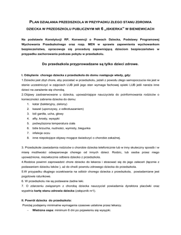 PLAN DZIAŁANIA PRZEDSZKOLA W PRZYPADKU ZŁEGO STANU ZDROWIA DZIECKA W PRZEDSZKOLU PUBLICZNYM NR 6 „ISKIERKA” W BIENIEWICACH Na podstawie Konstytucji RP, Konwencji o Prawach Dziecka, Podstawy Programowej Wychowania Przedszkolnego oraz rozp. MEN w sprawie zapewnienia wychowankom bezpieczeństwa, opracowuje się procedurę zapewniającą dzieciom bezpieczeństwo w przypadku zachorowania podczas pobytu w przedszkolu. Do przedszkola przyprowadzane są tylko dzieci zdrowe. I. Odsyłanie chorego dziecka z przedszkola do domu następuje wtedy, gdy: 1.Dziecko jest zbyt chore, aby pozostać w przedszkolu, jeżeli z powodu złego samopoczucia nie jest w stanie uczestniczyć w zajęciach LUB jeśli jego stan wymaga fachowej opieki LUB jeśli naraża inne dzieci na zarażenie się chorobą. 2.Objawy zaobserwowane u dziecka, upoważniające nauczyciela do poinformowania rodziców o konieczności zabrania dziecka do domu: 1. katar (bakteryjny, zielony) 2. kaszel (uporczywy, z odkrztuszaniem) 3. ból gardła, ucha, głowy 4. afty, krosty, wysypki 5. podwyższona temperatura ciała 6. bóle brzucha, nudności, wymioty, biegunka 7. infekcje oczu 8. inne niepokojące objawy mogące świadczyć o chorobie zakaźnej. 3. Przedszkole zawiadamia rodziców o chorobie dziecka telefonicznie lub w inny skuteczny sposób i w miarę możliwości odseparowuje chorego od innych dzieci. Rodzic, lub osoba przez niego upoważniona, niezwłocznie odbiera dziecko z przedszkola. 4.Rodzice powinni zaprowadzić chore dziecko do lekarza i stosować się do jego zaleceń (łącznie z podawaniem dziecku leków ), aż do chwili powrotu zdrowego dziecka do przedszkola. 5.W przypadku długiego oczekiwania na odbiór chorego dziecka z przedszkola, powiadamiane jest pogotowie ratunkowe. 6. W przedszkolu nie są podawane żadne leki. 7. O zdarzeniu związanym z chorobą dziecka nauczyciel powiadamia dyrektora placówki oraz wypełnia kartę stanu zdrowia dziecka (załącznik nr1). II. Powrót dziecka do przedszkola: Poniżej podajemy minimalne wymagania czasowe ustalone przez lekarzy. Wietrzna ospa: minimum 6 dni po pojawieniu się wysypki. Liszajec: po 24 godz. od rozpoczęcia leczenia (z koniecznością powiadomienia nauczyciela i dyrektora placówki). Wszy lub świerzb: następnego dnia po rozpoczęciu leczenia (z koniecznością powiadomienia nauczyciela i dyrektora placówki). Zapalenie spojówek: po 24 godz. od chwili rozpoczęcia leczenia. Świnka: 9 dni po zaobserwowaniu powiększonych gruczołów za uszami. Zapalenie gardła lub górnych dróg oddechowych: po 24 godz. leczenia oraz po 24 godz. od chwili ustąpienia wysokiej temperatury. Owrzodzenie jamy ustnej: w terminie ustalonym przez lekarza. Koklusz: po 5-dniowym okresie zażywania antybiotyków. Odra: 4 dni od chwili całkowitego zniknięcia wysypki. Inne poważne choroby zakaźne: w terminie ustalonym przez lekarza. W przypadku wątpliwości co do całkowitego wyzdrowienia dziecka nauczyciel może poprosić rodziców o zaświadczenie od lekarza o tym, że dziecko może już uczęszczać do przedszkola.