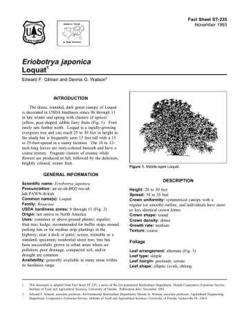 Fact Sheet ST-235 November 1993 Eriobotrya japonica Loquat1 Edward F. Gilman and Dennis G. Watson2 INTRODUCTION The dense, rounded, dark green canopy of Loquat is decorated in USDA hardiness zones 8b through 11 in late winter and spring with clusters of apricot yellow, pear-shaped, edible furry fruits (Fig. 1). Fruit rarely sets further north. Loquat is a rapidly-growing evergreen tree and can reach 25 to 30 feet in height in the shade but is frequently seen 15 feet tall with a 15 to 25-foot-spread in a sunny location. The 10 to 12inch-long leaves are rusty-colored beneath and have a coarse texture. Fragrant clusters of creamy white flowers are produced in fall, followed by the delicious, brightly colored, winter fruit. Figure 1. Middle-aged Loquat. GENERAL INFORMATION Scientific name: Eriobotrya japonica Pronunciation: air-ee-oh-BOT-ree-uh juh-PAWN-ih-kuh Common name(s): Loquat Family: Rosaceae USDA hardiness zones: 8 through 11 (Fig. 2) Origin: not native to North America Uses: container or above-ground planter; espalier; fruit tree; hedge; recommended for buffer strips around parking lots or for median strip plantings in the highway; near a deck or patio; screen; trainable as a standard; specimen; residential street tree; tree has been successfully grown in urban areas where air pollution, poor drainage, compacted soil, and/or drought are common Availability: generally available in many areas within its hardiness range DESCRIPTION Height: 20 to 30 feet Spread: 30 to 35 feet Crown uniformity: symmetrical canopy with a regular (or smooth) outline, and individuals have more or less identical crown forms Crown shape: round Crown density: dense Growth rate: medium Texture: coarse Foliage Leaf Leaf Leaf Leaf arrangement: alternate (Fig. 3) type: simple margin: pectinate; serrate shape: elliptic (oval); oblong 1. This document is adapted from Fact Sheet ST-235, a series of the Environmental Horticulture Department, Florida Cooperative Extension Service, Institute of Food and Agricultural Sciences, University of Florida. Publication date: November 1993. 2. Edward F. Gilman, associate professor, Environmental Horticulture Department; Dennis G. Watson, associate professor, Agricultural Engineering Department, Cooperative Extension Service, Institute of Food and Agricultural Sciences, University of Florida, Gainesville FL 32611. Eriobotrya japonica -- Loquat Page 2 Figure 2. Shaded area represents potential planting range. Leaf venation: pinnate Leaf type and persistence: broadleaf evergreen; Trunk and Branches evergreen fragrance; showy; winter flowering Trunk/bark/branches: bark is thin and easily damaged from mechanical impact; droop as the tree grows, and will require pruning for vehicular or pedestrian clearance beneath the canopy; not particularly showy; should be grown with a single leader; no thorns Pruning requirement: requires pruning to develop strong structure Breakage: resistant Current year twig color: gray Current year twig thickness: thick Fruit Culture Leaf blade length: 8 to 12 inches Leaf color: green Fall color: no fall color change Fall characteristic: not showy Flower Flower color: white Flower characteristics: fall flowering; pleasant Fruit Fruit Fruit Fruit Fruit shape: oval; round length: 1 to 3 inches covering: fleshy color: orange; yellow characteristics: attracts birds; attracts squirrels and other mammals; suited for human consumption; fruit, twigs, or foliage cause significant litter; showy Light requirement: tree grows in part shade/part sun; tree grows in full sun Soil tolerances: clay; loam; sand; acidic; alkaline; well-drained Drought tolerance: moderate Aerosol salt tolerance: moderate Soil salt tolerance: moderate Eriobotrya japonica -- Loquat Page 3 Providing best fruit and form when grown in full sun, Loquat can tolerate partial shade and a variety of well-drained soils. It grows well on soils with a high pH and maintains the characteristic dark green foliage. Clay soil is acceptable as long as there is sufficient slope to allow surface water to run away from the root system. It often looks best in the southern portion of its range when given some shade in the afternoon, especially if it is not irrigated. Loquat should be wellwatered until established, but can then survive periodic droughts. Do not overfertilize since this could increase sensitivity to fire blight disease. Loquat may live only 20 to 30-years so it should not be considered a permanent fixture in the landscape. It performs well along the coast with some protection from salty air. It is not for New Orleans area due to wet soils. Figure 3. Foliage of Loquat. Other Roots: surface roots are usually not a problem Winter interest: tree has winter interest due to unusual form, nice persistent fruits, showy winter trunk, or winter flowers Outstanding tree: not particularly outstanding Invasive potential: No entries found. Pest resistance: very sensitive to one or more pests or diseases which can affect tree health or aesthetics Although Loquat can easily be grown from seed, many cultivars are available for consistent fruit quality. ‘Champagne’ (March-May), best for USDA hardiness zone 9, has yellow-skinned, white-fleshed, juicy, tart fruit, one of the better fruits. ‘Gold Nugget’ (MayJune), best near coast, has larger, sweeter fruit with orange skin and flesh. ‘MacBeth’ (April-May) has exceptionally large fruit with yellow skin and creamy flesh. ‘Thales’ is a late yellow-fleshed variety. ‘Coppertone’, a hybrid, has dense growth with coppercolored new foliage and pale pink flowers. ‘Variegata’ has white variegated leaves. Propagation is by seed, cuttings, or grafting of cultivars. Pests USE AND MANAGEMENT Scales and caterpillars are occasional problems. Its neat habit and compact growth make Loquat an ideal specimen or patio shade tree, and it can be used as a residential street tree or median strip tree in areas where overhead space is limited. But an adequate clear trunk needs