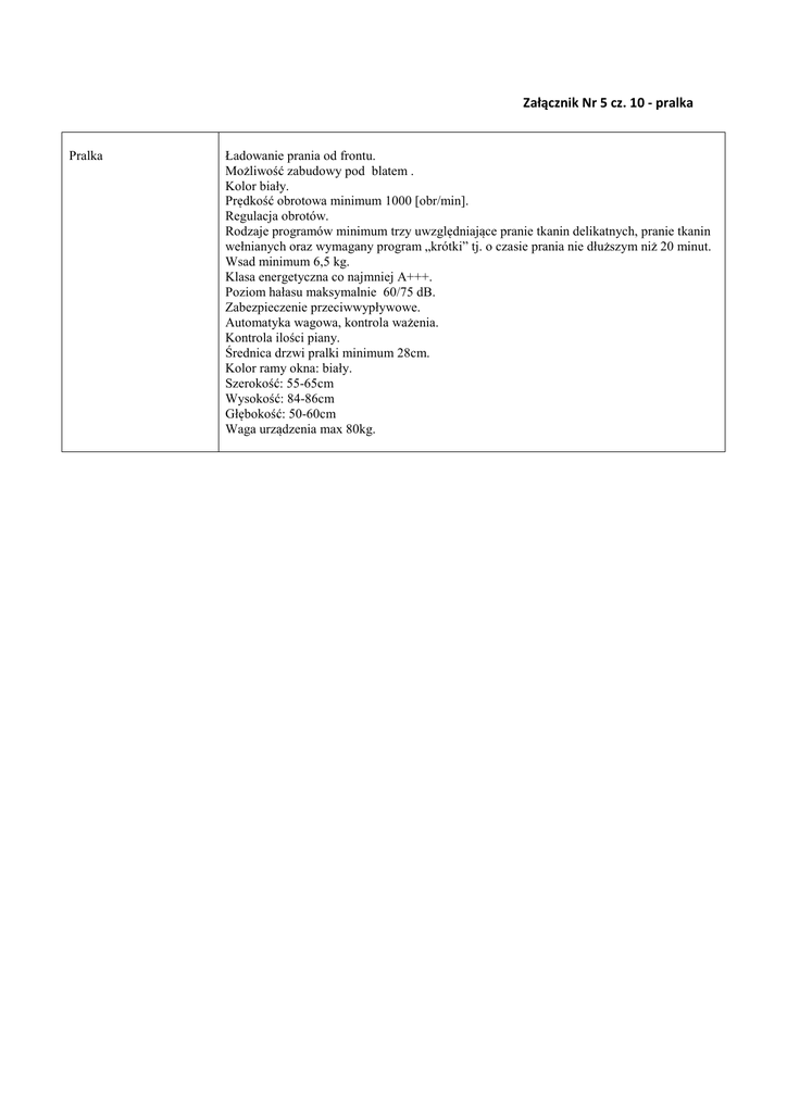 Załącznik Nr 5 cz. 10 - pralka Pralka Ładowanie prania od frontu. Możliwość zabudowy pod blatem . Kolor biały. Prędkość obrotowa minimum 1000 [obr/min]. Regulacja obrotów. Rodzaje programów minimum trzy uwzględniające pranie tkanin delikatnych, pranie tkanin wełnianych oraz wymagany program „krótki” tj. o czasie prania nie dłuższym niż 20 minut. Wsad minimum 6,5 kg. Klasa energetyczna co najmniej A+++. Poziom hałasu maksymalnie 60/75 dB. Zabezpieczenie przeciwwypływowe. Automatyka wagowa, kontrola ważenia. Kontrola ilości piany. Średnica drzwi pralki minimum 28cm. Kolor ramy okna: biały. Szerokość: 55-65cm Wysokość: 84-86cm Głębokość: 50-60cm Waga urządzenia max 80kg.