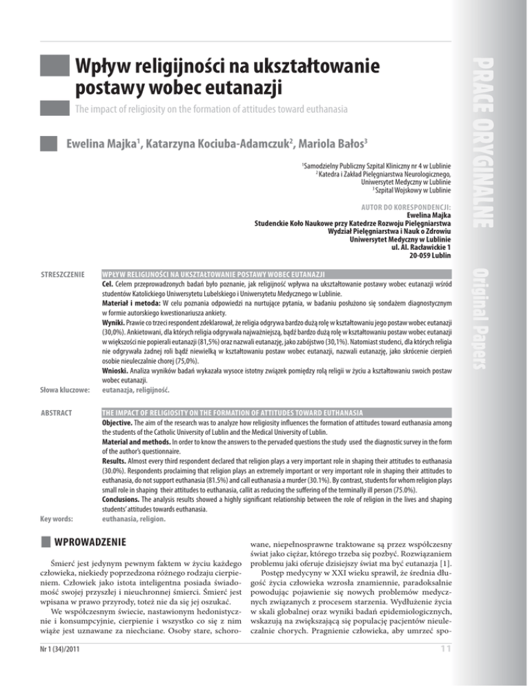 Ewelina Majka, Katarzyna Kociuba-Adamczuk, Mariola Bałos Wpływ religijności na ukształtowanie postawy wobec eutanazji The impact of religiosity on the formation of attitudes toward euthanasia Ewelina Majka1, Katarzyna Kociuba-Adamczuk2, Mariola Bałos3 1 Samodzielny Publiczny Szpital Kliniczny nr 4 w Lublinie 2 Katedra i Zakład Pielęgniarstwa Neurologicznego, Uniwersytet Medyczny w Lublinie 3 Szpital Wojskowy w Lublinie AUTOR DO KORESPONDENCJI: Ewelina Majka Studenckie Koło Naukowe przy Katedrze Rozwoju Pielęgniarstwa Wydział Pielęgniarstwa i Nauk o Zdrowiu Uniwersytet Medyczny w Lublinie ul. Al. Racławickie 1 20-059 Lublin STRESZCZENIE Słowa kluczowe: ABSTRACT Key words: WPŁYW RELIGIJNOŚCI NA UKSZTAŁTOWANIE POSTAWY WOBEC EUTANAZJI Cel. Celem przeprowadzonych badań było poznanie, jak religijność wpływa na ukształtowanie postawy wobec eutanazji wśród studentów Katolickiego Uniwersytetu Lubelskiego i Uniwersytetu Medycznego w Lublinie. Materiał i metoda: W celu poznania odpowiedzi na nurtujące pytania, w badaniu posłużono się sondażem diagnostycznym w formie autorskiego kwestionariusza ankiety. Wyniki. Prawie co trzeci respondent zdeklarował, że religia odgrywa bardzo dużą rolę w kształtowaniu jego postaw wobec eutanazji (30,0%). Ankietowani, dla których religia odgrywała najważniejszą, bądź bardzo dużą rolę w kształtowaniu postaw wobec eutanazji w większości nie popierali eutanazji (81,5%) oraz nazwali eutanazję, jako zabójstwo (30,1%). Natomiast studenci, dla których religia nie odgrywała żadnej roli bądź niewielką w kształtowaniu postaw wobec eutanazji, nazwali eutanazję, jako skrócenie cierpień osobie nieuleczalnie chorej (75,0%). Wnioski. Analiza wyników badań wykazała wysoce istotny związek pomiędzy rolą religii w życiu a kształtowaniu swoich postaw wobec eutanazji. eutanazja, religijność. THE IMPACT OF RELIGIOSITY ON THE FORMATION OF ATTITUDES TOWARD EUTHANASIA Objective. The aim of the research was to analyze how religiosity influences the formation of attitudes toward euthanasia among the students of the Catholic University of Lublin and the Medical University of Lublin. Material and methods. In order to know the answers to the pervaded questions the study used the diagnostic survey in the form of the author’s questionnaire. Results. Almost every third respondent declared that religion plays a very important role in shaping their attitudes to euthanasia (30.0%). Respondents proclaiming that religion plays an extremely important or very important role in shaping their attitudes to euthanasia, do not support euthanasia (81.5%) and call euthanasia a murder (30.1%). By contrast, students for whom religion plays small role in shaping their attitudes to euthanasia, callit as reducing the suffering of the terminally ill person (75.0%). Conclusions. The analysis results showed a highly significant relationship between the role of religion in the lives and shaping students’ attitudes towards euthanasia. euthanasia, religion. WPROWADZENIE Śmierć jest jedynym pewnym faktem w życiu każdego człowieka, niekiedy poprzedzona różnego rodzaju cierpieniem. Człowiek jako istota inteligentna posiada świadomość swojej przyszłej i nieuchronnej śmierci. Śmierć jest wpisana w prawo przyrody, toteż nie da się jej oszukać. We współczesnym świecie, nastawionym hedonistycznie i konsumpcyjnie, cierpienie i wszystko co się z nim wiąże jest uznawane za niechciane. Osoby stare, schoroNr 1 (34)/2011 wane, niepełnosprawne traktowane są przez współczesny świat jako ciężar, którego trzeba się pozbyć. Rozwiązaniem problemu jaki oferuje dzisiejszy świat ma być eutanazja [1]. Postęp medycyny w XXI wieku sprawił, że średnia długość życia człowieka wzrosła znamiennie, paradoksalnie powodując pojawienie się nowych problemów medycznych związanych z procesem starzenia. Wydłużenie życia w skali globalnej oraz wyniki badań epidemiologicznych, wskazują na zwiększającą się populację pacjentów nieuleczalnie chorych. Pragnienie człowieka, aby umrzeć spo- 11 Wpływ religijności na ukształtowanie postawy wobec eutanazji kojną, dobrą śmiercią zaczęło się z czasem rozbijać o zasady etyki lekarskiej, które w imię podstawowych standardów medycyny wymagają kontynuowania terapii w celu jak najdłuższego utrzymywania jego egzystencji [2, 3, 4]. Współcześnie bardziej od samej śmierci obawiamy się, że będziemy sztucznie podtrzymywani przy życiu, cierpiąc w wegetacji, pozbawieni świadomości i godności. Rozwiązania jakie przynosi współczesny świat należą do bardzo trudnych zagadnień bioetycznych. Eutanazja jest jednym z nich. Coraz częściej podważana jest świętość i godność życia ludzkiego. Prowadzi to do prób określenia poziomu cierpienia pacjentów, które upoważniłoby lekarza do zadania im śmierci [2, 3,4]. Te i inne zagadnienia związane z tematem eutanazji stanowią przedmiot wielu debat i dyskusji. Trwa swoista wojna na argumenty za i przeciw eutanazji. Jednocześnie można zauważyć, że proces promowania stylu życia sprzyjającego akceptacji eutanazji zatacza coraz większe kręgi. Coraz częściej w dzisiejszym społeczeństwie można spotkać się z prośbami o eutanazję, które nagłaśniane są w mediach [5, 6, 7]. CEL Celem przeprowadzonych badań było poznanie jak, religijność wpływa na ukształtowanie postawy wobec eutanazji wśród studentów Katolickiego Uniwersytetu Lubelskiego oraz Uniwersytetu Medycznego w Lublinie. MATERIAŁ I METODY Badania zostały przeprowadzone na Katolickim Uniwersytecie Lubelskim oraz Lubelskim Uniwersytecie Medycznym w okresie od listopada 2007 r. do lutego 2008 r. Badaniami objęto grupę 150 studentów. Uzyskane wyniki badań poddano analizie statystycznej. Wartości analizowanych parametrów scharakteryzowano przy pomocy liczności i odsetka. Dla zmiennych skokowych podano wartość mediany oraz wartość 