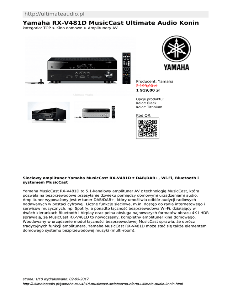 http://ultimateaudio.pl Yamaha RX-V481D MusicCast Ultimate Audio Konin kategoria: TOP > Kino domowe > Amplitunery AV Producent: Yamaha 2 199,00 zł 1 919,00 zł Opcje produktu: Kolor: Black Kolor: Titanium Kod QR: Sieciowy amplituner Yamaha MusicCast RX-V481D z DAB/DAB+, Wi-Fi, Bluetooth i systemem MusicCast Yamaha MusicCast RX-V481D to 5.1-kanałowy amplituner AV z technologią MusicCast, która pozwala na bezprzewodowe przesyłanie dźwięku pomiędzy domowymi urządzeniami audio. Amplituner wyposażony jest w tuner DAB/DAB+, który umożliwia odbiór audycji radiowych nadawanych w postaci cyfrowej. Liczne funkcje sieciowe, m.in. dostęp do radia internetowego i serwisów muzycznych, np. Spotify, a ponadto łączność bezprzewodowa Wi-Fi, działający w dwóch kierunkach Bluetooth i Airplay oraz pełna obsługa najnowszych formatów obrazu 4K i HDR sprawiają, że MusicCast RX-V481D to nowoczesny, kompletny amplituner kina domowego. Wbudowany w urządzenie moduł łączności bezprzewodowej MusicCast sprawia, że oprócz tradycyjnych funkcji amplitunera, Yamaha MusicCast RX-V481D może stać się także elementem domowego systemu bezprzewodowej muzyki (multi-room). strona: 1/10 wydrukowano: 02-03-2017 http://ultimateaudio.pl/yamaha-rx-v481d-musiccast-swiateczna-oferta-ultimate-audio-konin.html 5-kanałowy dźwięk przestrzenny 115 W na kanał (6 Ω, 1 kHz, 0,9% THD, 1 kanał sterowany) MusicCast – dzięki autorskiej technologii MusicCast możesz bezprzewodowo przesyłać dźwięk z amplitunera (i podłączonych urządzeń np. telewizora lub odtwarzacza CD) do innych pomieszczeń w domu oraz odbierać muzykę z innych urządzeń MusicCast (multi-room) Tuner DAB/DAB+ zapewniający dostęp do wysokiej jakości cyfrowych audycji radiowych Wi-Fi, Wi-Fi Direct, Bluetooth, Airplay – odtwarzaj bezprzewodowo muzykę ze swojego smartfona lub tabletu Bluetooth Output – dzięki unikalnej funkcji Bluetooth Output możesz przesyłać dźwięk z MusicCast RX-V481D do dowolnych słuchawek/głośników Bluetooth, nawet innych producentów Funkcje sieciowe – Spotify Connect, radio internetowe Odtwarzanie plików DSD 2,8 MHz / 5,6 MHz, FLAC / WAV / AIFF 192 kHz / 24 bity, Apple Lossless 96 kHz / 24 bity Odtwarzanie bez pauz (gapless playback) eliminuje przerwy pomiędzy utworami w ciągłych nagraniach, np. koncertach HDMI® (4 wej. / 1 wyj.) z pełną obsługą 4K Ultra HD z 4K60p (4:4:4), HDCP2.2 (4 wej. / 1 wyj.), HDR Video i przepustowością BT.2020 Cyfrowy port USB na przednim panelu do podłączenia pamięci USB YPAO™ – optymalizacja dźwięku umożliwiająca automatyczne skonfigurowanie głośników Sterowanie za pomocą aplikacji AV Controller i MusicCast Controller 17 programów DSP z możliwością regulacji Total Purity Concept – najwyższa jakość dźwięku Funkcja Dialogue Lift sprawia, że dialogi docierają ze środka ekranu Regulacja Dialogue Level Adjustment dla zachowania właściwej równowagi dźwiękowej z strona: 2/10 wydrukowano: 02-03-2017 http://ultimateaudio.pl/yamaha-rx-v481d-musiccast-swiateczna-oferta-ultimate-audio-konin.html dialogami i wokalami Przypisywalne wzmacniacze do połączenia bi-amp i funkcji Głośniki strefa B SCENE i HDMI CEC dla łatwiejszej obsługi kilku urządzeń jednocześnie Wielojęzyczne kolorowe menu ekranowe OSD z możliwością wyświetlania okładek Tryb ECO obniżający zużycie energii o 20% Tuner DAB/DAB+ zapewniający dostęp do wysokiej jakości cyfrowych audycji radiowych DAB (Digital Audio Brodcasting) i DAB+ są formatami, które zapewniają dostęp do nadawanych cyfrowo audycji radiowych, przy zachowaniu wysokiej jakości dźwięku. Dalsze korzyści obejmują automatyczne strojenie stacji z dostępnej listy wyboru oraz wyświetlanie informacji takich jak nazwa rozgłośni. Urządzenie umożliwia zapamiętanie 40 stacji DAB/DAB+. Wi-Fi, Wi-Fi Direct, Bluetooth, Airplay – odtwarzaj bezprzewodowo muzykę ze swojego smartfona lub tabletu Wbudowane Wi-Fi umożliwia bezprzewodowe połączenie z domowym routerem, znacząco upraszczając konfigurację systemu i zapewniając dostęp do sieciowego audio oraz muzycznych serwisów strumieniujących. Jeżeli router Wi-Fi jest niedostępny, unikatowa funkcja Wireless Direct nie tylko pozwala bezpośrednio przesyłać muzykę ze smartfonu lub tabletu za pośrednictwem funkcji Music Play w aplikacji AV Controller oraz technologii AirPlay (iOS), lecz także sterować amplitunerem wykorzystując aplikację AV Controller. MusicCast RX-V481D wyposażony jest także w moduł Bluetooth, dzięki czemu może bezprzewodowo odtwarzać muzykę ze smartfonów i innych urządzeń Bluetooth. Pod kątem transmisji Bluetooth zoptymalizowano układ Yamaha Compressed Music Enhancer, co gwarantuje, że muzyka będzie charakteryzowała się żywą, naturalną jakością dźwięku nawet podczas bezprzewodowego odtwarzania. MusicCast RX-V481D obsługuje również AirPlay, co pozwala bezprzewodowo strumieniować muzykę z iPoda touch, iPhona oraz iPada, a także z komputerów Mac i PC z bibliotekami iTunes. strona: 3/10 wydrukowano: 02-03-2017 http://ultimateaudio.pl/yamaha-rx-v481d-musiccast-swiateczna-oferta-ultimate-audio-konin.html Bluetooth Output – przesyłanie dźwięku z MusicCast RX-V481 do słuchawek/głośników Bluetooth Funkcja Bluetooth Output to nowa funkcjonalność, która znacząco rozszerza możliwość słuchania muzyki. Dzięki niej amplituner MusicCast RX-V481 potrafi przesyłać dźwięk wprost do bezprzewodowych słuchawek lub głośnika Bluetooth dowolnego producenta. Funkcje sieciowe – Spotify Connect, radio internetowe strona: 4/10 wydrukowano: 02-03-2017 http://ultimateaudio.pl/yamaha-rx-v481d-musiccast-swiateczna-oferta-ultimate-audio-konin.html Prezentowany amplituner AV wyróżnia się różnorodnością funkcji sieciowych, które zapewniają dostęp do większej liczby źródeł, a także poszerzają zakres działania. MusicCast RX-V481D można podłączyć do domowej siec
