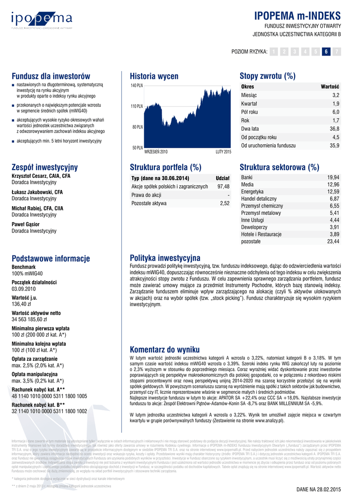 IPOPEMA m-INDEKS FUNDUSZ INWESTYCYJNY OTWARTY JEDNOSTKA UCZESTNICTWA KATEGORII B POZIOM RYZYKA: 1 Fundusz dla inwestorów ■■ nastawionych na długoterminową, systematyczną inwestycję na rynku akcyjnym w produkty oparte o indeksy rynku akcyjnego ■■ przekonanych o największym potencjale wzrostu w segmencie średnich spółek (mWIG40) 140 PLN 110 PLN 80 PLN Łukasz Jakubowski, CFA Doradca Inwestycyjny Michał Rabiej, CFA, CIIA Doradca Inwestycyjny WRZESIEŃ 2010 Benchmark 100% mWIG40 Początek działalności 03.09.2010 Wartość j.u. 136,40 zł LUTY 2015 Akcje spółek polskich i zagranicznych Prawa do akcji Pozostałe aktywa 7 Wartość 3,2 Kwartał 1,9 Pół roku 6,0 Rok 1,7 36,8 4,5 Od uruchomienia funduszu 35,9 Struktura sektorowa (%) Struktura portfela (%) Typ (dane na 30.06.2014) 6 Miesiąc Dwa lata Paweł Gąsior Doradca Inwestycyjny Podstawowe informacje 5 Od początku roku 50 PLN Krzysztof Cesarz, CAIA, CFA Doradca Inwestycyjny 4 Okres ■■ akceptujących min. 5 letni horyzont inwestycyjny Zespół inwestycyjny 3 Stopy zwrotu (%) Historia wycen ■■ akceptujących wysokie ryzyko okresowych wahań wartości jednostek uczestnictwa związanych z odwzorowywaniem zachowań indeksu akcyjnego 2 Udział 97,48 2,52 Banki Media Energetyka Handel detaliczny Przemysł chemiczny Przemysł metalowy Inne Usługi Deweloperzy Hotele i Restauracje pozostałe 19,94 12,96 12,59 6,87 6,55 5,41 4,44 3,91 3,89 23,44 Polityka inwestycyjna Fundusz prowadzi politykę inwestycyjną, tzw. funduszu indeksowego, dążąc do odzwierciedlenia wartości indeksu mWIG40, dopuszczając równocześnie nieznaczne odchylenia od tego indeksu w celu zwiększenia atrakcyjności stopy zwrotu z Funduszu. W celu zapewnienia sprawnego zarządzania portfelem, fundusz może zawierać umowy mające za przedmiot Instrumenty Pochodne, których bazę stanowią indeksy. Zarządzanie funduszem eliminuje wpływ zarządzającego na alokację (czyli % aktywów ulokowanych w akcjach) oraz na wybór spółek (tzw. „stock picking”). Fundusz charakteryzuje się wysokim ryzykiem inwestycyjnym. Wartość aktywów netto 34 563 185,60 zł Minimalna pierwsza wpłata 100 zł (200 000 zł kat. A*) Minimalna kolejna wpłata 100 zł (100 zł kat. A*) Opłata za zarządzanie max. 2,5% (2,0% kat. A*) Opłata manipulacyjna max. 3,5% (0,2% kat. A*) Rachunek nabyć kat. A** 48 1140 1010 0000 5311 1800 1005 Rachunek nabyć kat. B** 32 1140 1010 0000 5311 1800 1002 Komentarz do wyniku W lutym wartość jednostki uczestnictwa kategorii A wzrosła o 3,22%, natomiast kategorii B o 3,18%. W tym samym czasie wartość indeksu mWIG40 wzrosła o 3,39%. Szeroki indeks rynku WIG zakończył luty na poziomie o 2,3% wyższym w stosunku do poprzedniego miesiąca. Coraz wyraźniej widać dyskontowanie przez inwestorów poprawiających się perspektyw makroekonomicznych dla polskiej gospodarki, co w połączeniu z rekordowo niskimi stopami procentowymi oraz nową perspektywą unijną 2014-2020 ma szansę korzystnie przełożyć się na wyniki spółek giełdowych. W powyższym scenariuszu szansę na wyróżnienie mają spółki z takich sektorów jak budownictwo, przemysł czy IT, licznie reprezentowane właśnie w segmencie małych i średnich podmiotów. Najlepsze inwestycje funduszu w lutym to akcje: APATOR SA +22,4% oraz CCC SA +18,0%. Najsłabsze inwestycje funduszu to akcje: Zespół Elektrowni Pątnów-Adamów-Konin SA -8,7% oraz BANK MILLENNIUM SA -5,9%. W lutym jednostka uczestnictwa kategorii A wzrosła o 3,22%. Wynik ten umożliwił zajęcie miejsca w czwartym kwartylu w grupie porównywalnych funduszy (Zestawienie na stronie www.analizy.pl). Informacje i dane zawarte w tym materiale są udostępniane tylko i wyłącznie w celach informacyjnych i reklamowych i nie mogą stanowić podstawy do podjęcia decyzji inwestycyjnej. Nie należy traktować ich jako rekomendacji inwestowania w jakiekolwiek instrumenty finansowe lub formy doradztwa inwestycyjnego, jak również jako oferty zawarcia umowy w rozumieniu Kodeksu cywilnego. Informacje o IPOPEMA m-INDEKS Funduszu Inwestycyjnym Otwartym („Fundusz”) zarządzanym przez IPOPEMA TFI S.A. oraz o jego ryzyku inwestycyjnym zawarte są w prospekcie informacyjnym dostępnym w siedzibie IPOPEMA TFI S.A. oraz na stronie internetowej www.ipopematfi.pl. Przed nabyciem jednostek uczestnictwa należy zapoznać się z prospektem informacyjnym, który zawiera informacje niezbędne do oceny inwestycji oraz wskazuje ryzyka, koszty i opłaty. Przedstawione wyniki mają charakter historyczny (źródło: IPOPEMA TFI S.A.) i dotyczą jednostek uczestnictwa kategorii A. IPOPEMA TFI S.A. oraz Fundusz nie gwarantują osiągnięcia celów inwestycyjnych Funduszu ani uzyskania podobnych wyników w przyszłości. Inwestycje w Fundusz obarczone są ryzykiem inwestycyjnym, a uczestnik musi liczyć się z możliwością utraty przynajmniej części zainwestowanych środków. Indywidualna stopa zwrotu z inwestycji nie jest tożsama z wynikami inwestycyjnymi Funduszu i jest uzależniona od wartości jednostki uczestnictwa w momencie jej zbycia i odkupienia przez fundusz oraz od poziomu pobranych opłat manipulacyjnych i zapłaconego podatku bezpośrednio obciążającego dochód z inwestycji w Fundusz, w szczególności podatku od dochodów kapitałowych. Tabele opłat znajdują się na stronie internetowej www.ipopematfi.pl. Wartość aktywów netto Funduszu może cechować się dużą zmiennością, ze względu na skład portfeli inwestycyjnych i stosowane techniki zarządzania. * kategoria jednostek dostępna wyłącznie w sieci dystrybucji oraz kanale internetowym ** z dniem 2 maja 2013 r. nastąpiła zmiana kategorii jednostek uczestnictwa DANE NA 28.02.2015