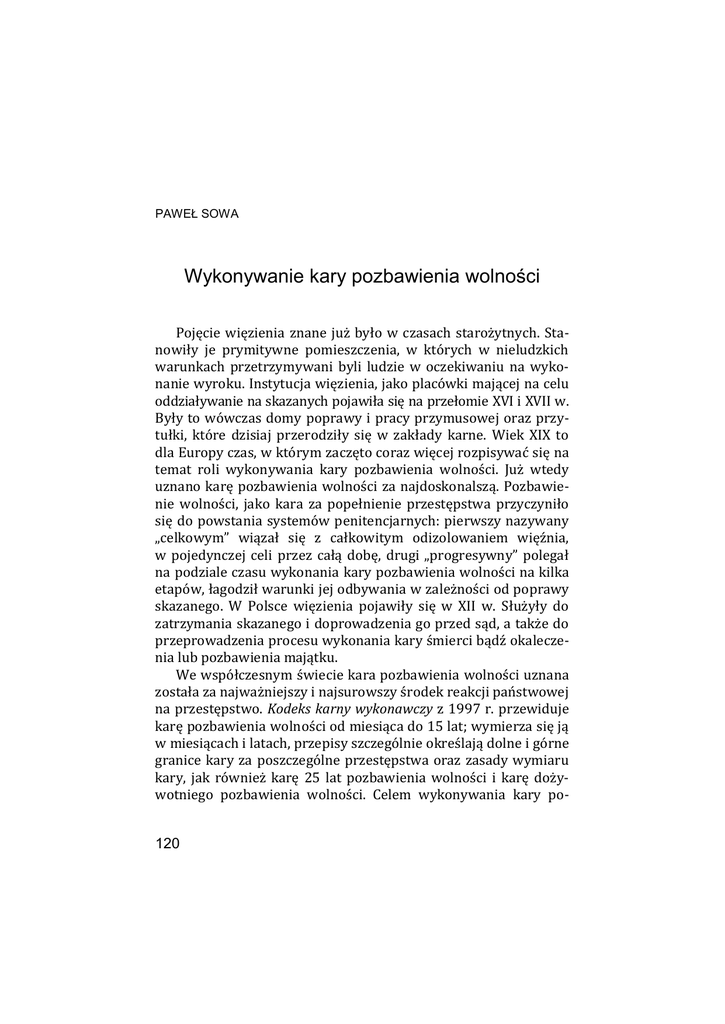 PAWEŁ SOWA Wykonywanie kary pozbawienia wolności Pojęcie więzienia znane już było w czasach starożytnych. Stanowiły je prymitywne pomieszczenia, w których w nieludzkich warunkach przetrzymywani byli ludzie w oczekiwaniu na wykonanie wyroku. Instytucja więzienia, jako placówki mającej na celu oddziaływanie na skazanych pojawiła się na przełomie XVI i XVII w. Były to wówczas domy poprawy i pracy przymusowej oraz przytułki, które dzisiaj przerodziły się w zakłady karne. Wiek XIX to dla Europy czas, w którym zaczęto coraz więcej rozpisywać się na temat roli wykonywania kary pozbawienia wolności. Już wtedy uznano karę pozbawienia wolności za najdoskonalszą. Pozbawienie wolności, jako kara za popełnienie przestępstwa przyczyniło się do powstania systemów penitencjarnych: pierwszy nazywany „celkowym” wiązał się z całkowitym odizolowaniem więźnia, w pojedynczej celi przez całą dobę, drugi „progresywny” polegał na podziale czasu wykonania kary pozbawienia wolności na kilka etapów, łagodził warunki jej odbywania w zależności od poprawy skazanego. W Polsce więzienia pojawiły się w XII w. Służyły do zatrzymania skazanego i doprowadzenia go przed sąd, a także do przeprowadzenia procesu wykonania kary śmierci bądź okaleczenia lub pozbawienia majątku. We współczesnym świecie kara pozbawienia wolności uznana została za najważniejszy i najsurowszy środek reakcji państwowej na przestępstwo. Kodeks karny wykonawczy z 1997 r. przewiduje karę pozbawienia wolności od miesiąca do 15 lat; wymierza się ją w miesiącach i latach, przepisy szczególnie określają dolne i górne granice kary za poszczególne przestępstwa oraz zasady wymiaru kary, jak również karę 25 lat pozbawienia wolności i karę dożywotniego pozbawienia wolności. Celem wykonywania kary po120 Wykonywanie kary pozbawienia wolności zbawienia wolności jest wzbudzanie w skazanym woli współdziałania w kształtowaniu jego społecznie pożądanych postaw, w szczególności poczucia odpowiedzialności oraz potrzeby przestrzegania porządku prawnego, a tym samym powstrzymania się od powrotu do przestępstwa. Należy przyjąć, że celami postępowania ze skazanym są utrzymanie stanu ich zdrowia, szacunku dla siebie, a także w zależności od tego, jak długo trwa kara, rozwijanie u nich poczucia odpowiedzialności i wspieranie takich postaw, które pomogą im w powrocie do społeczeństwa. Mówiąc o wykonywaniu kary pozbawienia wolności należy wspomnieć o podmiotach oraz pracownikach, którzy wykonują tę karę w zakładach karnych. W Polsce zakłady karne podlegają Ministerstwu Sprawiedliwości, które stanowi centralny organ nadzoru administracyjno-służbowego nad działalnością zakładów karnych. Zadania w zakresie wykonywania kary pozbawienia wolności realizuje Służba Więzienna podległa Ministrowi Sprawiedliwości. Jednostkami organizacyjnymi Służby Więziennej są: 1. Centralny Zarząd Służby Więziennej, którym kieruje Dyrektor Generalny Służby Więziennej. 2. Okręgowe inspektoraty Służby Więziennej kierowane przez dyrektorów okręgowych. 3. Zakłady karne i areszty śledcze. 4. Ośrodki szkolenia i doskonalenia kadr. Zakładem karnym kieruje dyrektor zakładu, w którym pracują również funkcjonariusze Służby Więziennej, którzy w postępowaniu wobec osób pozbawionych wolności zobowiązani są kierować się zasadami praworządności, bezstronności oraz humanitaryzmu; szanować ich prawa i godność; oddziaływać pozytywnie swoim własnym przykładem. W zakładach karnych istnieją komisje penitencjarne, w skład których wchodzić mogą powołani przez dyrektora funkcjonariusze i pracownicy tego zakładu. Mogą to być także osoby godne zaufania np. przedstawiciele stowarzyszeń, fundacji oraz kościołów i innych związków wyznaniowych, którym przysługuje głos 121 Paweł Sowa doradczy. Do zakresu działań komisji penitencjarnych należy m.in.: kierowanie skazanego do właściwego zakładu karnego, kierowanie skazanego do określonego systemu odbywania kary, jeżeli nie określił tego sąd w wyroku; ustalanie indywidualnych programów oddziaływań na skazanego i dokonywanie ocen ich wykonywania; dokonywanie ocen okresowych postępów skazanego w resocjalizacji; kwalifikowanie skazanych do nauczania w szkołach i na kursach; weryfikowanie indywidualnych programów oddziaływania albo indywidualnych programów terapeutycznych, a także kierowanie i wycofanie skazanych z oddziałów terapeutycznych; inne zadania przewidziane w ustawie i w przepisach wydanych na jej podstawie. Przy przyjęciu do zakładu karnego skazany okazuje dokument stwierdzający tożsamość, podaje dane osobowe, informuje o zmianie danych osobowych, o miejscu zameldowania lub przebywania bez meldowania, o uprzedniej karalności, o stanie zdrowia, a także o ciążącym na nim zobowiązaniach alimentacyjnych. Skazany może być także poddany czynnościom mającym na celu jego identyfikację, a w szczególności: sfotografowaniu, oględzinom zewnętrznym ciała, pobraniu odcisków oraz okazaniu innym osobom. Skazany przekazuje do depozytu dokumenty, pieniądze, przedmioty wartościowe i inne przedmioty, których nie może posiadać w celi. Po przyjęciu do zakładu karnego skazany zostaje umieszczony w celi przejściowej nie dłużej niż 14 dni. W tym czasie poddaje się go wstępnym badaniom lekarskim, zabiegom sanitarnym, a także wstępnym badaniom osobopoznawczym. Po osadzeniu w zakładzie karnym, skazanego należy bezzwłocznie poinformować o przysługujących mu prawach i ciążących na nim obowiązkach, zwłaszcza umożliwić mu zapoznanie się z przepisami kodeksu i regulaminu organizacyjno-porządkowego wykonywania kary pozbawienia wolności. W celu stworzenia warunków sprzyjających indywidualnemu postępowaniu ze skazanymi, zapobieganiu szkodliwym wpływom skazanych zdemoralizowanych oraz zapewnieniu skazanym bezpiec