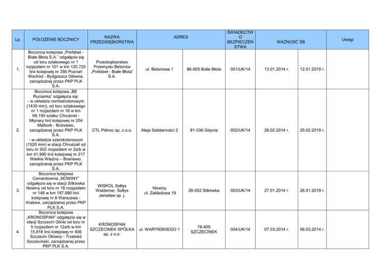 Lp. 1. 2. 3. 4. POŁOŻENIE BOCZNICY NAZWA PRZEDSIĘBIORSTWA Bocznica kolejowa „Prefabet Białe Błota S.A.” odgałęzia się od toru szlakowego nr 1 Przedsiębiorstwo rozjazdem nr 101 w km 120,725 Przemysłu Betonów linii kolejowej nr 356 Poznań „Prefabet - Białe Błota” S.A. Wschód - Bydgoszcz Główna, zarządzanej przez PKP PLK S.A. Bocznica kolejowa „BE Rucianka” odgałęzia się: - w układzie normalnotorowym (1435 mm), od toru szlakowego nr 1 rozjazdem nr 18 w km 69,190 szlaku Chruściel Młynary linii kolejowej nr 204 Malbork - Braniewo, zarządzanej przez PKP PLK CTL Północ sp. z o.o. S.A. - w układzie szerokotorowym (1520 mm) w stacji Chruściel od toru nr 502 rozjazdem nr 2a/b w km 41,990 linii kolejowej nr 217 Wielkie Wieżno – Braniewo, zarządzanej przez PKP PLK S.A. Bocznica kolejowa Cementownia „NOWINY” odgałęzia się w stacji Sitkówka WISKOL Sołtys Nowiny od toru nr 18 rozjazdem Waldemar, Sołtys nr 148 w km 197,990 linii Jarosław sp. j. kolejowej nr 8 Warszawa Kraków, zarządzanej przez PKP PLK S.A. Bocznica kolejowa „KRONOSPAN” odgałęzia się w stacji Szczecin Glinki od toru nr KRONOSPAN 5 rozjazdem nr 12a/b w km SZCZECINEK SPÓŁKA 15,918 linii kolejowej nr 406 sp. z o.o. Szczecin Główny - Trzebież Szczeciński, zarządzanej przez PKP PLK S.A. ŚWIADECTW O BEZPIECZEŃ STWA ADRES WAŻNOŚĆ ŚB ul. Betonowa 1 86-005 Białe Błota 001/UK/14 13.01.2014 r. 12.01.2019 r. Aleja Solidarności 2 81-336 Gdynia 002/UK/14 26.02.2014 r. 25.02.2019 r. Nowiny ul. Zakładowa 19 26-052 Sitkówka 003/UK/14 27.01.2014 r. 26.01.2019 r. ul. WARYŃSKIEGO 1 78-400 SZCZECINEK 004/UK/14 07.03.2014 r. 06.03.2014 r. Uwagi 5. 6. 7. 8. 9. 10. Bocznica kolejowa „SOLBET” odgałęzia się w stacji Solec Kujawski od toru nr 3 rozjazdem Cementownia „Warta” ul. Przemysłowa 17, nr 13 w km 138,272 linii S.A. Trębaczew kolejowej nr 18 Kutno - Piła Główna, zarządzanej przez PKP PLK S.A. Bocznica kolejowa „WBK 307” jest położona na linii kolejowej nr 118 Kraków Mydlniki Agencja Mienia Kraków Balice, zarządzanej ul. Nowowiejska 26 A Wojskowego przez PKP PLK S.A. Początkiem bocznicy jest km 5,100. Bocznica kolejowa „Siarkopol Gdańsk S.A.” odgałęzia się w stacji Gdańsk Port Północny od toru nr 80 rozjazdem nr 170 w ul. Mjr.H.Sucharskiego „Siarkopol” Gdańsk S.A. km 14,720 linii kolejowej nr 226 12 Pruszcz Gdański – Gdańsk Port Północny, zarządzanej przez PKP PLK S.A. Bocznica kolejowa „Alwernia S.A.” odgałęzia się w stacji Okleśna od toru nr 2 rozjazdem nr 1 w km 17,875 linii „ALWERNIA” S.A. ul. KAROLA kolejowych nr 103 Trzebinia – OLSZEWSKIEGO 25 Wadowice, zarządzanej przez PKP PLK S.A. Bocznica kolejowa „WBK 712” odgałęzia się w stacji Żagań od toru nr 127 rozjazdem nr 83 Jednostka Wojskowa Nr w km 0,456 linii kolejowej nr 14 ------------------5430 Łódź Kaliska - Tuplice, zarządzanej przez PKP PLK S.A. Bocznica kolejowa szerokotorowa (1520 mm) „ArcelorMittal Poland S.A.” odgałęzia się w stacji Sławków Arcelormittal Poland ul. Al. J. Piłsudskiego Południowy od toru stacyjnego S.A. 92 nr 3 rozjazdem nr 77 w km 394,457 linii kolejowej 065 Most na rzece Bug – Sławków, zarządzanej przez PKP LHS 98-355 Działoszyn 005/UK/14 20.01.2014 r. 19.01.2019 r. 00-911 Warszawa 006/UK/14 30.01.2014 r. 29.01.2019 r. 80-601 Gdańsk 007/UK/14 05.02.2014 r. 04.02.2019 r. 32-566 ALWERNIA 008/UK/14 04.03.2014 r. 03.03.2019 r. 67-320 Małomice 009/UK/14 24.01.2014 r. od 9.04.2014 r. do 8.04.2019 r. 41-308 Dąbrowa Górnicza 010/UK/14 30.01.2014 r. 29.01.2019 r. Przedłużenie świadectwa bezpieczeństwa nr 006/UK/09, wydane dnia 09.04.2009 r. Spółka z o.o. w Zamościu. 11. 12. 13. 14. Bocznica kolejowa „GlobTerminal sp. z o.o. w Białymstoku” odgałęzia się: - w układzie normalnotorowym (1435 mm), w stacji Braniewo od toru nr 1 rozjazdem nr 1 w km 48,100 linii kolejowej nr 254 Tropy - Braniewo, zarządzanej przez PKP PLK S.A. - w układzie szerokotorowym (1520 mm) w stacji Braniewo od toru nr 511 S rozjazdem nr 51 w km 54,565 linii nr 217 Wielkie Wieżno – Braniewo (Sz), zarządzanej przez PKP PLK S.A. Bocznica kolejowa GRUPA TAURON Południowy Koncern Węglowy S.A. Zakład Górniczy „Janina” odgałęzia się w stacji Libiąż od toru nr 2 rozjazdem nr 3 w km 10,921 linii kolejowej nr 93 Trzebinia – Zebrzydowice, zarządzanej przez PKP PLK S.A. Bocznica kolejowa KWK „MURCKI - STASZIC” Ruch Boże Dary odgałęzia się w stacji Katowice Kostuchna od toru nr 4 rozjazdem nr 35 w km 8,420 oraz od toru nr 2 rozjazdem nr 36 w km 8,450 linii kolejowej nr 142 Katowice Ligota – Tychy, zarządzanej przez PKP PLK S.A. Bocznica kolejowa „Elektrociepłownia Gorzów” odgałęzia się w stacji Wawrów od toru nr 9 rozjazdem nr 22a/b w km 293,112 linii kolejowej nr 203 Tczew - Kostrzyn, zarządzanej przez PKP PLK S.A. „Glob-Terminal” sp. z o.o. Al. 1000-Lecia P.P. 4 Południowy Koncern Węglowy S.A. ul. Grunwaldzka 37 PKP Cargo Service sp. z o.o. ul. Grójecka 17 PGE Górnictwo I Energetyka Konwencjonalna S.A. ul. Węglowa 5 15-111 Białystok 43-600 Jaworzno 02-021 Warszawa 97-400 Bełchatów 011/UK/14 06.02.2014 r. 05.02.2019 r. 012/UK/14 06.02.2014 r. 05.02.2019 r. 013/UK/14 30.01.2014 r. 29.01.2019 r. 014/UK/14 25.02.2014 r. 24.02.2019 r. 15. 16. 17. 18. 19. 20. Bocznica kolejowa „Punkt utrzymania taboru sekcji Poznań 2” odgałęzia się w stacji Gniezno od toru nr 102 rozjazdem nr 211 w km 46,162 linii kolejowej nr 353 Poznań Koleje Wielkopolskie sp. Wschód – Skandawa, z o.o. zarządzanej przez PKP PLK S.A. Bocznica kolejowa „Kopalnia Kruszywa Rakowice” odgałęzia się rozjazdem nr 101 w km 36,339 od toru szlaku Lwówek Górażdże Kruszywa Śląski - Niwice linii kolejowej nr sp. z o.o. 283 Jelenia Góra - Ławszowa, zarządzanej przez PKP PLK S.A. Bocznica kolejowa „Nordkalk Wolica” odgałęzia się w stacji Wolica od toru nr 4 rozjazdem nr 6 w km 207,312 linii kole