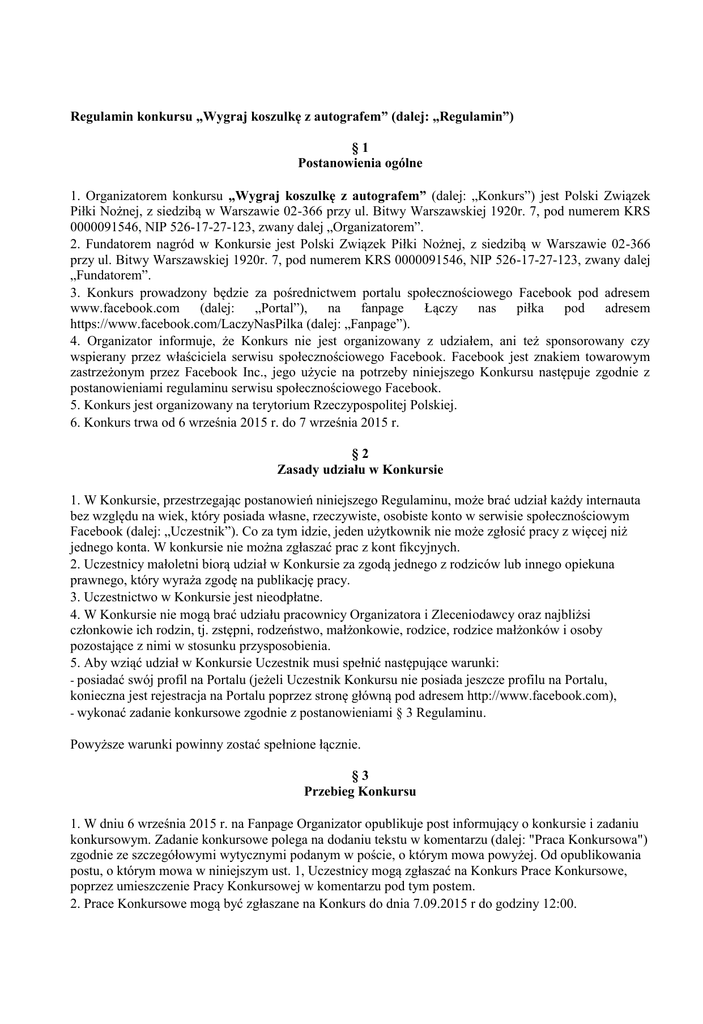 Regulamin konkursu „Wygraj koszulkę z autografem” (dalej: „Regulamin”) §1 Postanowienia ogólne 1. Organizatorem konkursu „Wygraj koszulkę z autografem” (dalej: „Konkurs”) jest Polski Związek Piłki Nożnej, z siedzibą w Warszawie 02-366 przy ul. Bitwy Warszawskiej 1920r. 7, pod numerem KRS 0000091546, NIP 526-17-27-123, zwany dalej „Organizatorem”. 2. Fundatorem nagród w Konkursie jest Polski Związek Piłki Nożnej, z siedzibą w Warszawie 02-366 przy ul. Bitwy Warszawskiej 1920r. 7, pod numerem KRS 0000091546, NIP 526-17-27-123, zwany dalej „Fundatorem”. 3. Konkurs prowadzony będzie za pośrednictwem portalu społecznościowego Facebook pod adresem www.facebook.com (dalej: „Portal”), na fanpage Łączy nas piłka pod adresem https://www.facebook.com/LaczyNasPilka (dalej: „Fanpage”). 4. Organizator informuje, że Konkurs nie jest organizowany z udziałem, ani też sponsorowany czy wspierany przez właściciela serwisu społecznościowego Facebook. Facebook jest znakiem towarowym zastrzeżonym przez Facebook Inc., jego użycie na potrzeby niniejszego Konkursu następuje zgodnie z postanowieniami regulaminu serwisu społecznościowego Facebook. 5. Konkurs jest organizowany na terytorium Rzeczypospolitej Polskiej. 6. Konkurs trwa od 6 września 2015 r. do 7 września 2015 r. §2 Zasady udziału w Konkursie 1. W Konkursie, przestrzegając postanowień niniejszego Regulaminu, może brać udział każdy internauta bez względu na wiek, który posiada własne, rzeczywiste, osobiste konto w serwisie społecznościowym Facebook (dalej: „Uczestnik”). Co za tym idzie, jeden użytkownik nie może zgłosić pracy z więcej niż jednego konta. W konkursie nie można zgłaszać prac z kont fikcyjnych. 2. Uczestnicy małoletni biorą udział w Konkursie za zgodą jednego z rodziców lub innego opiekuna prawnego, który wyraża zgodę na publikację pracy. 3. Uczestnictwo w Konkursie jest nieodpłatne. 4. W Konkursie nie mogą brać udziału pracownicy Organizatora i Zleceniodawcy oraz najbliżsi członkowie ich rodzin, tj. zstępni, rodzeństwo, małżonkowie, rodzice, rodzice małżonków i osoby pozostające z nimi w stosunku przysposobienia. 5. Aby wziąć udział w Konkursie Uczestnik musi spełnić następujące warunki: - posiadać swój profil na Portalu (jeżeli Uczestnik Konkursu nie posiada jeszcze profilu na Portalu, konieczna jest rejestracja na Portalu poprzez stronę główną pod adresem http://www.facebook.com), - wykonać zadanie konkursowe zgodnie z postanowieniami § 3 Regulaminu. Powyższe warunki powinny zostać spełnione łącznie. §3 Przebieg Konkursu 1. W dniu 6 września 2015 r. na Fanpage Organizator opublikuje post informujący o konkursie i zadaniu konkursowym. Zadanie konkursowe polega na dodaniu tekstu w komentarzu (dalej: "Praca Konkursowa") zgodnie ze szczegółowymi wytycznymi podanym w poście, o którym mowa powyżej. Od opublikowania postu, o którym mowa w niniejszym ust. 1, Uczestnicy mogą zgłaszać na Konkurs Prace Konkursowe, poprzez umieszczenie Pracy Konkursowej w komentarzu pod tym postem. 2. Prace Konkursowe mogą być zgłaszane na Konkurs do dnia 7.09.2015 r do godziny 12:00. 3. Prace Konkursowe powinny być wolne od wulgaryzmów i treści powszechnie uznanych za obraźliwe, a także od treści o charakterze pornograficznym lub mogących obrazić uczucia lub przekonania innych osób, bądź naruszających prawa osób trzecich (w tym w szczególności dóbr osobistych i praw autorskich). 4. Zgłaszając Pracę Konkursową na Konkurs, Uczestnik udziela Organizatorowi nieodpłatnej licencji na opublikowanie Pracy Konkursowej na następujących zasadach: - terytorium: bez ograniczeń, - pola eksploatacji: publikacja na Fanpage; - okres: 5 lat. §4 Zasady wyłaniania zwycięzców oraz nagrody 1. Prace Konkursowe zostaną poddane ocenie Komisji Konkursowej składającej się z przedstawicieli Organizatora (dalej: „Komisja”). 2. Komisja Konkursowa wytypuje 1 (słownie: jednego) Uczestnika(dalej: „Zwycięzca”), który otrzyma nagrodę w postaci koszulki reprezentacji o wartości 249,00 złotych brutto. 3. Nagroda zostanie wydana zgodnie z przepisami Ustawy o podatku dochodowym od osób fizycznych z dnia 26 lipca 1991 r. (Dz. U. z 2000 r., Nr 14, poz. 176). W przypadku nagród, których wartość przekracza 760, 00 zł brutto, obowiązek uiszczenia opłat podatkowych od nagród leży po stronie uczestnika Konkursu. 4. W terminie 2 (słownie: dwóch) dni roboczych po zakończeniu Konkursu, Zwycięzca zostanie poinformowany przez Organizatora o przyznaniu nagrody, poprzez wskazanie na Fanpage Pracy Konkursowej wybranej przez Komisję. 5. Zwycięzca powinien przesłać, w terminie 5 (słownie: pięciu) dni od dnia powiadomienia, o którym mowa w ust. 4 powyżej, za pośrednictwem prywatnej wiadomości na Fanpage’u, swoje imię i nazwisko, numer telefonu oraz adres, na który nagroda zostanie wysłana. Jeżeli Zwycięzca nie uczyni zadość powyższemu obowiązkowi, nagroda pozostaje w dyspozycji Organizatora. 6. Nagroda zostanie wydana poprzez wysłanie jej do Zwycięzcy drogą pocztową lub za pośrednictwem kuriera na adres wskazany przez Zwycięzcę w terminie 14 dniu od dnia powiadomienia, o którym mowa w ust. 4. §5 Dane osobowe 1. Dane osobowe Uczestników będą przetwarzane zgodnie z warunkami określonymi w ustawie z dnia 29 sierpnia 1997 r. o ochronie danych osobowych (tekst jednolity: Dz. U. z 2002 r., Nr 101 poz. 926) wyłącznie w celu przeprowadzenia Konkursu. Uczestnik ma prawo wglądu w swoje dane, prawo ich zmiany i żądania usunięcia. 2. Administratorem danych osobowych jest Organizator. 3. W celu przeprowadzenia Konkursu Organizator będzie przetwarzać następujące dane osobowe Zwycięzców, które zostaną wykorzystane do wydania nagród, a następnie niezwłocznie usunięte: - imię, - nazwisko, - adres, - nr telefonu. §6 Postępowanie reklamacyjne. 1. Reklamacje dotyczące spraw zwią