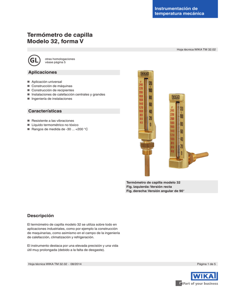 Instrumentación de temperatura mecánica Termómetro de capilla Modelo 32, forma V Hoja técnica WIKA TM 32.02 otras homologaciones véase página 5 Aplicaciones ■■ Aplicación universal ■■ Construcción de máquinas ■■ Construcción de recipientes ■■ Instalaciones de calefacción centrales y grandes ■■ Ingeniería de instalaciones Características ■■ Resistente a las vibraciones ■■ Líquido termométrico no tóxico ■■ Rangos de medida de -30 ... +200 °C Termómetro de capilla modelo 32 Fig. izquierda: Versión recta Fig. derecha: Versión angular de 90° Descripción El termómetro de capilla modelo 32 se utiliza sobre todo en aplicaciones industriales, como por ejemplo la construcción de maquinarias, como asimismo en el campo de la ingeniería de calefacción, climatización y refrigeración. El instrumento destaca por una elevada precisión y una vida útil muy prolongada (debido a la falta de desgaste). Hoja técnica WIKA TM 32.02 ∙ 08/2014 Página 1 de 5 Versión estándar Diámetro nominal 110 x 30 mm Diámetro en mm 110, 150 y 200 Forma de conexión Forma E, racor roscado Principio de medición Dilatación del líquido ■■ Versión recta según DIN 16181 Límite de error DIN 16195 Presión admisible en bulbo Máx. 6 bar Bulbo Ø 10 mm Ø 6,5 mm para tamaño nominal 200 x 36 con tuerca loca M24 x 1,5 Caja Aluminio, color latón, anodizado Subdivisión Impresa con pintura especial, protegida por anodización Inserto de vidrio Forma de varilla, capilar prismático Racor roscado - G ½ B, M20 x 1,5 (forma B según DIN) - G ⅜ B, M16 x 1,5 (forma B1 según DIN) Racor roscado enroscado en la caja Longitud de montaje l1 = 30, 40, 63, 100, 160, 250 mm Aleación de cobre ■■ Versión angular de 90° según DIN 16182 Racor roscado - G ½ B, M20 x 1,5 (forma S según DIN) - G ⅜ B, M16 x 1,5 (forma S1 según DIN) Racor roscado enchufado en la caja, desmontable Longitud de montaje l1 = 30, 40, 63, 100, 160, 250 mm Aleación de cobre ■■ Versión angular de 135° Racor roscado - G ½ B, M20 x 1,5 - G ⅜ B, M16 x 1,5 Racor roscado enroscado en la caja Longitud de montaje l1 = 30, 40, 63, 100, 160, 250 mm Aleación de cobre Líquido termométrico Azul, mojando Diámetro nominal 150 x 36 mm Diámetro nominal 200 x 36 mm Forma de conexión Forma E, racor roscado Forma de conexión Forma E, racor roscado ■■ Versión recta según DIN 16185 ■■ Versión recta según DIN 16189 ■■ Versión angular de 90° según DIN 16186 ■■ Versión angular de 90° según DIN 16190 ■■ Versión angular de 135° ■■ Versión angular de 135° Racor roscado - G ½ B, M20 x 1,5 (forma B según DIN) - G ¾ B, M27 x 2 Racor roscado enroscado en la caja Longitud de montaje l1 = 63, 100, 160, 250 mm Aleación de cobre Racor roscado - G ½ B, M20 x 1,5 (forma S según DIN) - G ¾ B, M27 x 2 Racor roscado enchufado en la caja, desmontable Longitud de montaje l1 = 63, 100, 160, 250 mm Aleación de cobre Racor roscado - G ½ B, M20 x 1,5 - G ¾ B, M27 x 2 Racor roscado enroscado en la caja Longitud de montaje l1 = 63, 100, 160, 250 mm Aleación de cobre Página 2 de 5 Racor roscado - G ½ B, M20 x 1,5 (forma B1 según DIN) - G ¾ B, M27 x 2 (forma B según DIN) Racor roscado enroscado en la caja Longitud de montaje l1 = 63, 100, 160, 250 mm Aleación de cobre Racor roscado - G ½ B, M20 x 1,5 (forma S1 según DIN) - G ¾ B, M27 x 2 (forma S según DIN) Racor roscado enchufado en la caja, desmontable Longitud de montaje l1 = 63, 100, 160, 250 mm Aleación de cobre Racor roscado - G ½ B, M20 x 1,5 (forma B1 según DIN) - G ¾ B, M27 x 2 (forma B según DIN) Racor roscado enroscado en la caja Longitud de montaje l1 = 63, 100, 160, 250 mm Aleación de cobre Hoja técnica WIKA TM 32.02 ∙ 08/2014 Rangos de indicación Diámetro en mm DN 110 DN 150 DN 200 Modelos Diámetro en mm DN 110 DN 150 DN 200 Rango de medida en °C Subdivisiones en °C Límite de error en °C Modelo Posición de la conexión DIN -30 ... +50 0 ... 60 0...100 0...120 0 ...160 0...200 -30 ... +50 0 ... 60 0...100 0...120 0 ...160 0...200 -30 ... +50 0 ... 60 0...100 0...120 0 ...160 0...200 G 3200 W 3201 W 3202 G 3210 W 3211 W 3212 G 3220 W 3221 W 3222 1 1 2 2 4 5 1 1 2 2 2 2 1 1 1 1 2 2 recto ángulo de 90° ángulo de 135° recto ángulo de 90° ángulo de 135° recto ángulo de 90° ángulo de 135° 2 1,5 2 2 4 5 2 1,5 2 2 4 4 2 1,5 2 2 4 4 DIN 16181 DIN 16182 DIN 16185 DIN 16186 DIN 16189 DIN 16190 DIN 16191 Opciones (para todos los diámetros nominales) ■■ Escala doble °F/°C ■■ Otros rangos de indicación ■■ Racor roscado de otros materiales ■■ Vainas según DIN de aleación de cobre, acero, acero inoxidable u otros materiales ■■ Forma de conexión (opcional): forma 3, tuerca de unión ■■ Tipos de construcción - Versión recta según DIN 16189 Tuerca loca - G ½, M20 x 1,5 (forma C1 según DIN) - G ¾, M27 x 2 (forma C según DIN) - M24 x 1,5 (forma F según DIN) Pieza de conexión enroscada en la caja, desmontable Longitud de montaje l1: - Forma C1: l1 = 89, 126, 186, 276, 426 mm - Forma C: l1 = 93, 130, 190, 280, 430 mm - Forma F: l1 = 155, 215, 275, 295, 355, 415 mm Tuerca loca y pieza de conexión de aleación de cobre, tubo de acero St. 35 Hoja técnica WIKA TM 32.02 ∙ 08/2014 - Versión angular de 90° según DIN 16190 Tuerca loca - G ½, M20 x 1,5 (forma C1 según DIN) - G ¾, M27 x 2 (forma C según DIN) - M24 x 1,5 (forma F según DIN) Pieza de conexión enchufada en la caja, desmontable Longitud de montaje l1: - Forma C1:l1 = 89, 126, 186, 276, 426 mm - Forma C: l1 = 93, 130, 190, 280, 430 mm - Forma F: l1 = 155, 215, 275, 295, 355, 415 mm Tuerca loca y pieza de conexión de aleación de cobre, tubo de acero St. 35 - Versión angular de 135° según DIN 16191 Tuerca loca - G ½, M20 x 1,5 (forma C1 según DIN) - G ¾, M27 x 2 (forma C según DIN) - M24 x 1,5 (forma F según DIN) Pieza de conexión enroscada en la caja, desmontable Longitud de montaje 
