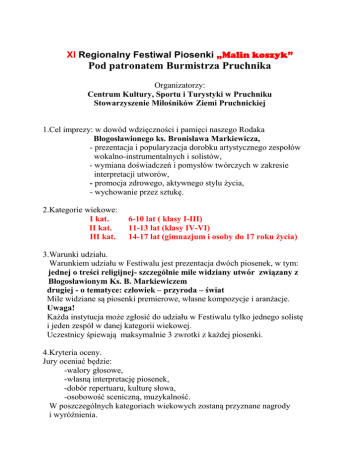XI Regionalny Festiwal Piosenki „Malin koszyk” Pod patronatem Burmistrza Pruchnika Organizatorzy: Centrum Kultury, Sportu i Turystyki w Pruchniku Stowarzyszenie Miłośników Ziemi Pruchnickiej 1.Cel imprezy: w dowód wdzięczności i pamięci naszego Rodaka Błogosławionego ks. Bronisława Markiewicza, - prezentacja i popularyzacja dorobku artystycznego zespołów wokalno-instrumentalnych i solistów, - wymiana doświadczeń i pomysłów twórczych w zakresie interpretacji utworów, - promocja zdrowego, aktywnego stylu życia, - wychowanie przez sztukę. 2.Kategorie wiekowe: I kat. II kat. III kat. 6-10 lat ( klasy I-III) 11-13 lat (klasy IV-VI) 14-17 lat (gimnazjum i osoby do 17 roku życia) 3.Warunki udziału. Warunkiem udziału w Festiwalu jest prezentacja dwóch piosenek, w tym: jednej o treści religijnej- szczególnie mile widziany utwór związany z Błogosławionym Ks. B. Markiewiczem drugiej - o tematyce: człowiek – przyroda – świat Mile widziane są piosenki premierowe, własne kompozycje i aranżacje. Uwaga! Każda instytucja może zgłosić do udziału w Festiwalu tylko jednego solistę i jeden zespół w danej kategorii wiekowej. Uczestnicy śpiewają maksymalnie 3 zwrotki z każdej piosenki. 4.Kryteria oceny. Jury oceniać będzie: -walory głosowe, -własną interpretację piosenek, -dobór repertuaru, kulturę słowa, -osobowość sceniczną, muzykalność. W poszczególnych kategoriach wiekowych zostaną przyznane nagrody i wyróżnienia. 5.Termin i miejsce: 22 maja (piątek) godz. 11.00 zespoły i soliści w kat. I, II, III Centrum Kultury, Sportu i Turystyki w Pruchniku 6.Zasady organizacyjne. Organizatorzy zapewniają: - aparaturę nagłaśniającą, - mikrofony - odtwarzacz CD, mp3 - pianino cyfrowe Uczestnicy przyjeżdżają na koszt własny. 7.Opiekunowie uczestnika wyrażają zgodę na wykorzystywanie wizerunku dziecka na stronach internetowych www.ckpruchnik.pl, www.pruchnik.pl na Facebooku CKPRUCHNIK oraz podczas transmisji w telewizji internetowej POD24.pl Udział w Festiwalu prosimy potwierdzić na załączonej karcie zgłoszenia w nieprzekraczalnym terminie do dnia 08 maja 2015 i przesłać na adres Organizatora: Centrum Kultury, Sportu i Turystyki ul. Ks. B. Markiewicza 20 37-560 PRUCHNIK lub pocztą elektroniczną: e-mail: [email protected] 7.Przepisy ogólne. Sprawy nie ujęte w regulaminie rozstrzyga Organizator. Szczegółowych informacji udziela Biuro Organizacyjne tel. (0-16)6288065. od wtorku do soboty w godz. od 13.00 do 20.00.