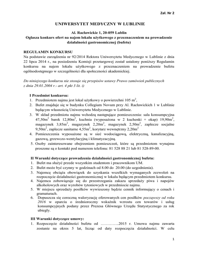 Zał. Nr 2 UNIWERSYTET MEDYCZNY W LUBLINIE Al. Racławickie 1, 20-059 Lublin Ogłasza konkurs ofert na najem lokalu użytkowego z przeznaczeniem na prowadzenie działalności gastronomicznej (bufetu) REGULAMIN KONKURSU Na podstawie zarządzenia nr 92/2014 Rektora Uniwersytetu Medycznego w Lublinie z dnia 22 lipca 2014 r., na posiedzeniu Komisji przetargowej został ustalony poniższy Regulamin konkursu na najem lokalu użytkowego z przeznaczeniem na prowadzenie bufetu ogólnodostępnego w szczególności dla społeczności akademickiej. Do niniejszego konkursu nie stosuje się przepisów ustawy Prawo zamówień publicznych z dnia 29.01.2004 r.- art. 4 pkt 3 lit. i) I Przedmiot konkursu: 1. Przedmiotem najmu jest lokal użytkowy o powierzchni 105 m2, 2. Bufet znajduje się w budynku Collegium Novum przy Al. Racławickich 1 w Lublinie będącym własnością Uniwersytetu Medycznego w Lublinie. 3. W skład przedmiotu najmu wchodzą następujące pomieszczenia: sala konsumpcyjna 47,50m2 barek 12,80m2, kuchnia (wyposażona w 2 kuchenki + okap) 19,90m2, magazynek 3,85m2, magazynek 2,20m2, magazynek 2,50m2, zaplecze socjalne 9,50m2, zaplecze sanitarne 4,55m2, korytarz wewnętrzny 2,20m2 4. Pomieszczenia wyposażone są w sieć wodociągową, elektryczną, kanalizacyjną, gazową, grzewczo-wentylacyjną i klimatyzacyjną. 5. Osoby zainteresowane obejrzeniem pomieszczeń, które są przedmiotem wynajmu proszone są o kontakt pod numerem telefonu: 81 528 88 21 lub 81 528-89-00. II Warunki dotyczące prowadzenia działalności gastronomicznej bufetu: 1. Bufet ma służyć przede wszystkim studentom i pracownikom UM. 2. Bufet może być czynny w godzinach od 8.00 do 20.00 (do uzgodnienia). 3. Najemcę obciąża obowiązek do uzyskania wszelkich wymaganych zezwoleń na rozpoczęcie działalności gastronomicznej w lokalu będącym przedmiotem konkursu. 4. Najemca zobowiązuje się do przestrzegania zakazu sprzedaży piwa i napojów alkoholowych oraz wyrobów tytoniowych w przedmiocie najmu. 5. W miejscu sprzedaży posiłków wywieszony będzie cennik informujący o cenach i gramaturach. 6. Dopuszcza się coroczną waloryzację oferowanych cen posiłków począwszy od roku 2016 w oparciu o średnioroczny wskaźnik wzrostu cen towarów i usług konsumpcyjnych podany przez Prezesa Głównego Urzędu Statystycznego za rok ubiegły. III Warunki dotyczące umowy: 1. Rozpoczęcie działalności bufetu od …………..2015 r. Umowa najmu zawarta zostanie na okres 5 lat, licząc od daty rozpoczęcia działalności. W celu 1 Zał. Nr 2 przygotowania lokalu do prowadzenia działalności Organizator dopuszcza możliwość wcześniejszego udostępnienia lokalu na 7 dni za protokolarnym przekazaniem. 2. Czynsz najmu będzie liczony w ten sposób, że stawka netto, wyłoniona w drodze konkursu będzie nie mniejsza niż 15,20 zł (słownie: piętnaście zł 20/100), pomnożona przez ilość m2 powierzchni i powiększona o należny podatek VAT. 3. Niezależnie od czynszu, o którym mowa w pkt. 2, Najemcę obciążają wszystkie inne opłaty związane z eksploatacją przedmiotu najmu zgodnie z wystawioną na rzecz Najemcy fakturą (w ramach tzw. refakturowania), w szczególności: - z tytułu zużytej energii elektrycznej w/g wskazań licznika, - wody i ścieków wg wskazań wodomierza, - gazu wg wskazań gazomierza, według stawek określonych przez dostawcę mediów Organizatora, oraz opłaty z tytułu konserwacji urządzeń wentylacyjnych i klimatyzacyjnych. 4. Stawka czynszu ulega corocznej waloryzacji o średnioroczny wskaźnik wzrostu cen towarów i usług konsumpcyjnych za rok ubiegły podany przez Prezesa Głównego Urzędu Statystycznego, począwszy od 2016 r. 5. Najemca będzie ponosił ewentualne koszty dezynsekcji i deratyzacji. 6. Najemca będzie zobowiązany do zawarcia odrębnej umowy wywozu nieczystości, której kopię należy przedłożyć Wynajmującemu do 7 dni od dnia podpisania umowy. 7. Wszelkie koszty związane z używaniem lokalu będzie ponosił Najemca. 8. Wynajmujący zobowiązuje się do zawarcia umowy ubezpieczenia odpowiedzialności cywilnej deliktowej i kontraktowej z tytułu prowadzonej działalności gospodarczej przez cały okres trwania niniejszej umowy. Umowa ubezpieczenia powinna obejmować tylko i wyłącznie działalność będącą przedmiotem niniejszej umowy i nie może obejmować pozostałej działalności prowadzonej w ramach innych umów zawartych przez Najemcę.. 9. Zakres ubezpieczenia powinien zawierać: a) odpowiedzialność cywilną Najemcy za szkody w nieruchomościach i mieniu ruchomym w związku z wynajmem pomieszczeń bufetu na sumę ubezpieczenia w wysokości co najmniej 100 000,00 zł na jedno i wszystkie zdarzenia. Dopuszcza się franszyzę redukcyjną w wysokości 500,00 zł dla szkód rzeczowych, b) odpowiedzialność cywilną deliktową i kontraktową za szkody rzeczowe i osobowe wyrządzone osobom trzecim w tym pracownikom i studentom Wynajmującego wyrządzone w związku z prowadzoną działalnością gastronomiczną na sumę ubezpieczenia w wysokości co najmniej 100 000,00 zł na jedno i wszystkie zdarzenia. Dopuszcza się franszyzę redukcyjną w wysokości 200,00 zł dla szkód rzeczowych, dla szkód osobowych franszyza redukcyjna zniesiona 10. Polisy o których mowa w pkt. 9 winny mieć cesję na rzecz Uniwersytetu Medycznego w Lublinie. Szczegółowe warunki ubezpieczenia zostały określone w Załączniku Nr 5 (wzór umowy). IV Warunki udziału w konkursie: W konkursie mogą uczestniczyć oferenci, którzy: 1. Prawidłowo złożą ofertę wraz z załącznikami wymienionymi w p. V Regulaminu Konkursu. 2. Są podmiotami prowadzącymi działalność gastronomiczną co najmniej od 3 lat. 2 Zał. Nr 2 3. Dołączą do oferty co najmniej 2 referencje z okresu ostatnich 2 lat prowadzonej działalności gastronomicznej w zakresie zbiorowego żywienia. 4. Wpłacą wadium w wysokości 3000,00 zł (słownie: trzy tysiące złotych) na konto Uniwersytetu w Ban