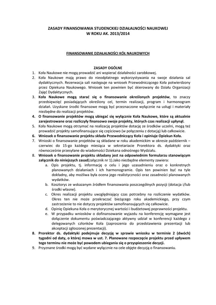 ZASADY FINANSOWANIA STUDENCKIEJ DZIAŁALNOŚCI NAUKOWEJ W ROKU AK. 2013/2014 FINANSOWANIE DZIAŁALNOŚCI KÓŁ NAUKOWYCH 1. 2. 3. 4. 5. 6. 7. 8. 8. 9. ZASADY OGÓLNE Koła Naukowe nie mogą prowadzić ani wspierać działalności zarobkowej. Koła Naukowe mają prawo do nieodpłatnego wykorzystywania na swoje działania sal dydaktycznych. Rezerwacja sali następuje na wniosek Przewodniczącego Koła potwierdzony przez Opiekuna Naukowego. Wniosek ten powinien być skierowany do Działu Organizacji Zajęć Dydaktycznych. Koła Naukowe mogą starać się o finansowanie określonych projektów, to znaczy przedsięwzięć posiadających określony cel, termin realizacji, program i harmonogram działań. Uzyskane środki finansowe mogą być przeznaczone wyłącznie na usługi i materiały niezbędne do realizacji projektów. O finansowanie projektów mogą ubiegać się wyłącznie Koła Naukowe, które są aktualnie zarejestrowane oraz rozliczyły finansowo swoje projekty, których czas realizacji upłynął. Koła Naukowe mogą otrzymać na realizację projektów dotację ze środków uczelni, mogą też prowadzić projekty samofinansujące się częściowo (w połączeniu z dotacją) lub całkowicie. Wniosek o finansowanie projektu składa Przewodniczący Koła i opiniuje Opiekun Koła. Wnioski o finansowanie projektów są składane w roku akademickim w okresie październik – czerwiec do 15-go każdego miesiąca w sekretariacie Prorektora ds. dydaktyki oraz równocześnie przesyłane do wiadomości Dziekana odnośnego Wydziału. Wniosek o finansowanie projektu składany jest na odpowiednim formularzu stanowiącym załącznik do niniejszych zasad(załącznik nr 1).Jako niezbędne elementy zawiera: a. Opis projektu, tj. informację o celu i jego uzasadnieniu oraz o konkretnych planowanych działaniach i ich harmonogramie. Opis ten powinien być na tyle dokładny, aby możliwa była ocena jego realistyczności oraz zasadności planowanych wydatków. b. Kosztorys ze wskazanym źródłem finansowania poszczególnych pozycji (dotacja i/lub środki własne). c. Okres realizacji projektu uwzględniający czas potrzebny na rozliczenie wydatków. Okres ten nie może przekraczać bieżącego roku akademickiego, przy czym zastrzeżenie to nie dotyczy projektów samofinansujących się całkowicie. d. Opinię Opiekuna Koła o merytorycznej wartości i budżetowej poprawności projektu. e. W przypadku wniosków o dofinansowanie wyjazdu na konferencję wymagane jest dołączenie dokumentu poświadczającego aktywny udział w konferencji każdego z delegowanych członków Koła (zaproszenia do przedstawienia prezentacji lub akceptacji zgłoszonej prezentacji). Prorektor ds. dydaktyki podejmuje decyzję w sprawie wniosku w terminie 2 (dwóch) tygodni od daty, o której mowa w ust. 7. Planowane rozpoczęcie projektu przed upływem tego terminu nie może być powodem ubiegania się o przyspieszenie decyzji. Przyznane środki mogą być wydane wyłącznie na cele objęte decyzją o finansowaniu. ZASADY SZCZEGÓŁOWE 1. Działalność Kół Naukowych jest wspierana finansowo przez uczelnię z FUNDUSZU NA AKTYWNOŚĆ NAUKOWĄ STUDENTÓW SWPS. Środkami należącymi do FUNDUSZU dysponuje Prorektor ds. dydaktyki. 2. Środki z FUNDUSZU przydzielane są z uwzględnieniem następujących priorytetów uczelni: a. Działania angażujące znaczną liczbę studentów, o zasięgu ogólnoakademickim, regionalnym, ogólnopolskim, międzynarodowym. b. Badania naukowe związane tematycznie z profilem Koła Naukowego. c. Aktywny udział (grupowy lub indywidualny) w krajowych konferencjach i seminariach związanych z tematyką działalności Koła Naukowego. d. Wydarzenia budujące pozytywny wizerunek SWPS w mediach, w środowisku akademickim lub społecznym. e. Imprezy cykliczne. f. Wydarzenia zaopiniowane przez Samorząd Studencki jako szczególnie wartościowe dla środowiska studenckiego SWPS. g. Wydarzenia organizowane we współpracy z instytucjami lub osobami, których dotychczasowy udział w działalności SWPS lub na szerszym forum społecznym budzi uznanie. 3. Maksymalne finansowanie jednego projektu wynosi 1 500 zł. 4. Dotacje przyznawane są w miarę dostępnych środków FUNDUSZU. W związku z ilością dostępnych środków, jak też na podstawie oceny zasadności kosztorysu projektu, przyznane finansowanie może być niższe niż kwota wnioskowana, a także niektóre przedstawione we wniosku wydatki mogą być wyłączone z finansowania. 6. Przyznane środki są rezerwowane na czas podany we wniosku jako okres realizacji projektu. Po upływie tego czasu środki niewykorzystane automatycznie wracają do puli FUNDUSZU i są przeznaczone na realizację zgłaszanych na bieżąco projektów. 7. Konferencje mogą być organizowanie przez Koła Naukowe wyłącznie jako projekty całkowicie lub częściowo samofinansujące się na bazie opłat pobieranych od uczestników. Dofinansowanie konferencji z FUNDUSZU tak jak w przypadku wszystkich innych projektów może wynosić maksymalnie 1 500 zł. 10. Wniosek dotyczący organizacji konferencji oprócz pełnego zestawu informacji wymaganych przy wszystkich projektach, powinien zawierać dodatkowo: • imienny skład komitetu organizacyjnego ze wskazaniem osoby odpowiedzialnej za merytoryczny poziom konferencji, • Informacje o terminie i miejscu konferencji oraz planowanej liczbie uczestników, • Ramowy program konferencji, • Informację o sposobie pozyskiwania prezentacji (np. zaproszeni mówcy lub swobodne zgłoszenia i kwalifikacja wystąpień przez komitet organizacyjny) • Informację o wysokości opłaty za uczestnictwo. 11. Na podstawie zgody Prorektora ds. dydaktyki na organizację konferencji Przewodniczący Koła występuje do Kwestora o otworzenie konta, na które będą wpływały opłaty od uczestników oraz o wskazanie komórki kosztowej. ODMOWA FINANSOWANIA PROJEKTÓW 1. Odmowa finansowania będzie dotyczyć: a. Przedsięwzięć o charakterze komerc
