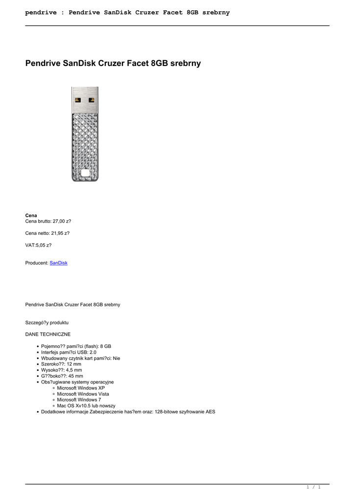 pendrive : Pendrive SanDisk Cruzer Facet 8GB srebrny Pendrive SanDisk Cruzer Facet 8GB srebrny Cena Cena brutto: 27,00 z? Cena netto: 21,95 z? VAT:5,05 z? Producent: SanDisk Pendrive SanDisk Cruzer Facet 8GB srebrny Szczegó?y produktu DANE TECHNICZNE Pojemno?? pami?ci (flash): 8 GB Interfejs pami?ci USB: 2.0 Wbudowany czytnik kart pami?ci: Nie Szeroko??: 12 mm Wysoko??: 4,5 mm G??boko??: 45 mm Obs?ugiwane systemy operacyjne Microsoft Windows XP Microsoft Windows Vista Microsoft Windows 7 Mac OS Xv10.5 lub nowszy Dodatkowe informacje Zabezpieczenie has?em oraz: 128-bitowe szyfrowanie AES 1 / 1 Powered by TCPDF (www.tcpdf.org)