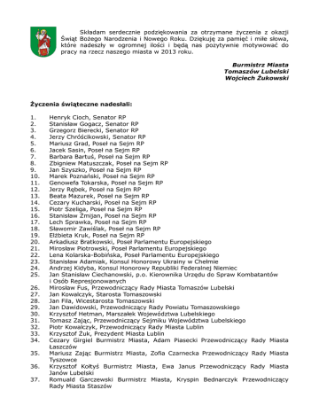 Składam serdecznie podziękowania za otrzymane życzenia z okazji Świąt Bożego Narodzenia i Nowego Roku. Dziękuję za pamięć i miłe słowa, które nadeszły w ogromnej ilości i będą nas pozytywnie motywować do pracy na rzecz naszego miasta w 2013 roku. Burmistrz Miasta Tomaszów Lubelski Wojciech Żukowski Życzenia świąteczne nadesłali: 1. 2. 3. 4. 5. 6. 7. 8. 9. 10. 11. 12. 13. 14. 15. 16. 17. 18. 19. 20. 21. 22. 23. 24. 25. 26. 27. 28. 29. 30. 31. 32. 33. 34. 35. 36. 37. Henryk Cioch, Senator RP Stanisław Gogacz, Senator RP Grzegorz Bierecki, Senator RP Jerzy Chróścikowski, Senator RP Mariusz Grad, Poseł na Sejm RP Jacek Sasin, Poseł na Sejm RP Barbara Bartuś, Poseł na Sejm RP Zbigniew Matuszczak, Poseł na Sejm RP Jan Szyszko, Poseł na Sejm RP Marek Poznański, Poseł na Sejm RP Genowefa Tokarska, Poseł na Sejm RP Jerzy Rębek, Poseł na Sejm RP Beata Mazurek, Poseł na Sejm RP Cezary Kucharski, Poseł na Sejm RP Piotr Szeliga, Poseł na Sejm RP Stanisław Żmijan, Poseł na Sejm RP Lech Sprawka, Poseł na Sejm RP Sławomir Zawiślak, Poseł na Sejm RP Elżbieta Kruk, Poseł na Sejm RP Arkadiusz Bratkowski, Poseł Parlamentu Europejskiego Mirosław Piotrowski, Poseł Parlamentu Europejskiego Lena Kolarska-Bobińska, Poseł Parlamentu Europejskiego Stanisław Adamiak, Konsul Honorowy Ukrainy w Chełmie Andrzej Kidyba, Konsul Honorowy Republiki Federalnej Niemiec Jan Stanisław Ciechanowski, p.o. Kierownika Urzędu do Spraw Kombatantów i Osób Represjonowanych Mirosław Fus, Przewodniczący Rady Miasta Tomaszów Lubelski Jan Kowalczyk, Starosta Tomaszowski Jan Fila, Wicestarosta Tomaszowski Jan Dawidowski, Przewodniczący Rady Powiatu Tomaszowskiego Krzysztof Hetman, Marszałek Województwa Lubelskiego Tomasz Zając, Przewodniczący Sejmiku Województwa Lubelskiego Piotr Kowalczyk, Przewodniczący Rady Miasta Lublin Krzysztof Żuk, Prezydent Miasta Lublin Cezary Girgiel Burmistrz Miasta, Adam Piasecki Przewodniczący Rady Miasta Łaszczów Mariusz Zając Burmistrz Miasta, Zofia Czarnecka Przewodniczący Rady Miasta Tyszowce Krzysztof Kołtyś Burmistrz Miasta, Ewa Janus Przewodniczący Rady Miasta Janów Lubelski Romuald Garczewski Burmistrz Miasta, Kryspin Bednarczyk Przewodniczący Rady Miasta Staszów 38. 39. 40. 41. 42. 43. 44. 45. 46. 47. 48. 49. 50. 51. 52. 53. 54. 55. 56. 57. 58. 59. 60. 61. 62. 63. 64. 65. 66. 67. 68. 69. Tadeusz Garaj Burmistrz Miasta, Eugeniusz Paczała Przewodniczący Rady Miasta Hrubieszów Kajetan Protas Wójt Gminy, Edwarda Tukiendorf Przewodniczący Rady Gminy Sitno Wiesława Sieńkowska Wójt Gminy, Jerzy Pałczyński Przewodniczący Rady Gminy Komarów -Osada Irena Elżbieta Witkowska Wójt Gminy, Dariusz Dziedzic Przewodniczący Rady Gminy Telatyn Franciszek Kawa Wójt Gminy, Wiesław Ćmiel Przewodniczący Rady Gminy Susiec Kazimierz Organista Wójt Gminy, Krzystof Gryglicki Przewodniczący Rady Gminy Rachanie Andrzej Adamek Wójt Gminy, Kazimierz Marynicz Przewodniczący Rady Gminy Bełżec Zdzisław Wojnar Wójt Gminy, Piotr Kowalski Przewodniczący Rady Gminy Jarczów Ryszard Urban, Wójt Gminy Horyniec–Zdrój Piotr Pasieczny, Wójt Gminy Tarnawatka Wiesław Chmielowiec, Burmistrz Miasta Krasnystaw Zespół INFORLEX.PL Zarząd i pracownicy MIKROBIT Sp. z o.o. Zarząd i Członkowie Stowarzyszenia Osób Niepełnosprawnych Narządu Ruchu „PROMYK” Maria Piasecka Dyrektor, Pracownicy, Dzieci i Rodzice Przedszkola Samorządowego Nr 1 w Tomaszowie Lubelskim Teresa Koszel Dyrektor, Pracownicy, Dzieci i Rodzice Przedszkola Samorządowego Nr 2 w Tomaszowie Lubelskim Maria Majak–Rebizant Dyrektor, Pracownicy, Dzieci i Rodzice Przedszkola Samorządowego Nr 5 w Tomaszowie Lubelskim Dyrekcja, Grono Pedagogiczne, Pracownicy i Uczniowie Szkoły Podstawowej Nr 3 im. Janusza Petera w Tomaszowie Lubelskim Dyrekcja, Nauczyciele, Pracownicy i Uczniowie Szkoły Podstawowej Nr 2 im. Marszałak Józefa Piłsudskiego w Tomaszowie Lubelskim Dyrekcja, Grono Pedagogiczne Pracownicy oraz Uczniowie Gimnazjum Nr 1 im. Orląt Lwowskich w Tomaszowie Lubelskim Dr. hab. Paweł Marzec, prof. KUL, Dziekan Wydziału Zamiejscowego Nauk Prawnych i Ekonomicznych KUL w Tomaszowie Lubelskim Danuta Borkowska, Dziekan Wydziału Nauk Rolniczych Uniwersytetu Przyrodniczego w Lublinie dr hab. Stanisław Michałowski, prof. nadzw. , Rektor UMCS w Lublinie Dyrekcja, Grono Pedagogiczne, Pracownicy i Uczniowie Zespołu Szkół Nr 1 im. Bartosza Głowackiego w Tomaszowie Lubelskim Ks. prof. Dr hab. Antonii Dębiński Rektor Katolickiego Uniwersytetu Lubelskiego Jana Pawła II Gen. bryg SG Jarosław Frączyk, Komendant Nadbużańskiego Oddziału Straży Granicznej Płk SG Jacek Gartman, Zastępca Komendanta Nadbużańskiego Oddziału Straży Granicznej Płk SG Janusz Gąsiorowski, Zastępca Komendanta Nadbużańskiego Oddziału Straży Granicznej St. bryg. Stanisław Kielech, Komendant Powiatowy Państwowej Straży Pożarnej w Tomaszowie Lubelskim Mł. insp. Paweł Solarski, Komendant Powiatowy Policji w Tomaszowie Lubelskim Strzelcy Jednostki Strzeleckiej 2019 im. Gen. Tadeusza Piskora w Tomaszowie Lubelskim Zarząd Koła Miejskiego Związku Kombatantów RP i Byłych Więźniów 70. 71. 72. 73. 74. 75. 76. 77. 78. 79. 80. 81. 82. 83. 84. 85. 86. 87. 88. 89. 90. 91. 92. 93. 94. 95. 96. 97. 98. 99. 100. 101. 102. 103. 104. 105. 106. 107. 108. 109. 110. 111. 112. 113. 114. 115. 116. 117. 118. Politycznych w Tomaszowie Lubelskim Koło Rejonowe Światowego Związku Żołnierzy Armii Krajowej w Tomaszowie Lubelskim Ppłk Adam Pilip, Wojskowy Komendant Uzupełnień w Zamościu Mł. Inspektor Celny Remigiusz Woźniak, Dyrektor Izby Celnej w Białej Podlaskiej Antoni Rzeźnik, Nadleśniczy Nadleśnictwa Tomaszów PSOUU koło w Tomaszowie Lubelskim M. Kusztykiewicz Zdzisław Sadurski, Prezes Wojewódzkiego Sądu Administracyjnego w Lublinie Arcybiskup Abel, Prawosławny Arcybiskup Lubelski i Chełmski Mjr Andrzej Drozd Komendant Wydziału Żandarmerii Wojskowej w Lublinie Toma
