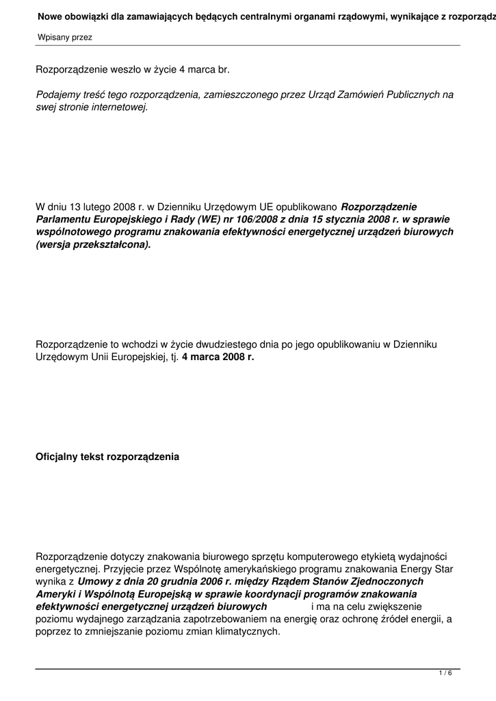 Nowe obowiązki dla zamawiających będących centralnymi organami rządowymi, wynikające z rozporządz Wpisany przez Rozporządzenie weszło w życie 4 marca br. Podajemy treść tego rozporządzenia, zamieszczonego przez Urząd Zamówień Publicznych na swej stronie internetowej. W dniu 13 lutego 2008 r. w Dzienniku Urzędowym UE opublikowano Rozporządzenie Parlamentu Europejskiego i Rady (WE) nr 106/2008 z dnia 15 stycznia 2008 r. w sprawie wspólnotowego programu znakowania efektywności energetycznej urządzeń biurowych (wersja przekształcona). Rozporządzenie to wchodzi w życie dwudziestego dnia po jego opublikowaniu w Dzienniku Urzędowym Unii Europejskiej, tj. 4 marca 2008 r. Oficjalny tekst rozporządzenia Rozporządzenie dotyczy znakowania biurowego sprzętu komputerowego etykietą wydajności energetycznej. Przyjęcie przez Wspólnotę amerykańskiego programu znakowania Energy Star wynika z Umowy z dnia 20 grudnia 2006 r. między Rządem Stanów Zjednoczonych Ameryki i Wspólnotą Europejską w sprawie koordynacji programów znakowania efektywności energetycznej urządzeń biurowych i ma na celu zwiększenie poziomu wydajnego zarządzania zapotrzebowaniem na energię oraz ochronę źródeł energii, a poprzez to zmniejszanie poziomu zmian klimatycznych. 1/6 Nowe obowiązki dla zamawiających będących centralnymi organami rządowymi, wynikające z rozporządze Wpisany przez Artykuł 6 Rozporządzenia (Propagowanie kryteriów efektywności energetycznej) stanowi, że w okresie obowiązywania Umowy między Wspólnotą a Stanami Zjednoczonymi Komisja i inne instytucje Wspólnoty, jak również centralne organy rządowe w rozumieniu dyrektywy 2004/18/WE w sprawie koordynacji procedur udzielania zamówień publicznych na roboty budowlane, dostawy i usługi, bez uszczerbku dla przepisów krajowych i wspólnotowych oraz kryteriów ekonomicznych, określają wymagania w zakresie efektywności energetycznej co najmniej równoważne ze wspólnymi specyfikacjami technicznymi Energy Star dla zamówień publicznych na dostawy o wartości równej lub wyższej od kwot progowych określonym w art. 7 wspomnianej dyrektywy. W związku z powyższym, Rozporządzenie nakłada na krajowe centralne organy rządowe obowiązek stosowania kryteriów efektywności energetycznej co najmniej równoważne tym określonym w specyfikacjach programu Energy Star przy udzielaniu zamówień publicznych na sprzęt biurowy o wartości równej lub przekraczającej równowartość w złotych 133 000 euro. Wskazane kryteria efektywności energetycznej zawarte są załączniku C Umowy między rządem Stanów Zjednoczonych Ameryki a Wspólnotą Europejską w sprawie koordynacji programów znakowania efektywności energetycznej urządzeń biurowych: - specyfikacje komputerów, specyfikacje monitorów komputerowych, specyfikacje urządzeń do przetwarzania obrazu. 2/6 Nowe obowiązki dla zamawiających będących centralnymi organami rządowymi, wynikające z rozporządze Wpisany przez Oznakowanie efektywności energetycznej Energy Star jest stosowane na całym świecie. Aby mieć wpływ na wymogi programu znakowania Energy Star, Komisja Europejska wspólnie z Agencją Ochrony Środowiska Stanów Zjednoczonych uczestniczy w programie i w opracowywaniu wymaganych specyfikacji technicznych. Jednocześnie instytucje te zastrzegają sobie prawo zmiany specyfikacji w przypadku, gdy zmiany technologiczne lub rynkowe wpłyną na ich przydatność dla konsumentów, branży lub ich oddziaływanie na środowisko naturalne. W przypadku zmiany specyfikacji kwalifikacja Energy Star nie jest udzielana automatycznie na okres żywotności modelu produktu. Aby zakwalifikować się do oznaczenia Energy Star model produktu musi spełniać wymogi specyfikacji Energy Star obowiązujące w dniu produkcji tego modelu. W celu dokonywania przeglądu wdrożenia programu Energy Star w UE powołano Biuro Wspólnoty Europejskiej ds. Energy Star (ang. European Community Energy Star Board składające się z przedstawicieli państw członkowskich UE oraz przedstawicieli zainteresowanych stron. Wszelki informacje dot. działalności Biura znajdują się pod adresem internetowym: www.eu-energystar.org Zakres obowiązywania Rozporządzenia Energy Star Rozporządzenie obejmuje swoim zakresem centralne organy rządowe w rozumieniu dyrektywy 2004/18/WE oraz sprzęt biurowy określony w załączniku C Umowy między rządem Stanów Zjednoczonych Ameryki a Wspólnotą Europejską w sprawie koordynacji programów znakowania efektywności energetycznej urządzeń biurowych. Oznacza to, że poniżej wymienione podmioty są zobowiązane do stosowania kryteriów efektywności energetycznej co najmniej równoważnych kryteriom Energy Star przy 3/6 Nowe obowiązki dla zamawiających będących centralnymi organami rządowymi, wynikające z rozporządze Wpisany przez dokonywaniu zakupów następujących urządzeń biurowych: komputery, monitory oraz urządzenia do przetwarzania obrazu (kopiarki, powielacze cyfrowe, faksy, urządzenia do nadawania listów, urządzenia wielofunkcyjne, drukarki i skanery): 1. Kancelaria Prezydenta RP 2. Kancelaria Sejmu RP 3. Kancelaria Senatu RP 4. Kancelaria Prezesa Rady Ministrów 5. Sąd Najwyższy 6. Naczelny Sąd Administracyjny 7. Sądy powszechne i sądy administracyjne 8. Trybunat Konstytucyjny 9. Najwyższa Izba Kontroli 10. Biuro Rzecznika Praw Obywatelskich 11. Biuro Rzecznika Praw Dziecka 12. Biuro Ochrony Rządu 13. Biuro Bezpieczeństwa Narodowego 14. Centralne Biuro Antykorupcyjne 15. Ministerstwo Pracy i Polityki Społecznej 16. Ministerstwo Finansów 17. Ministerstwo Gospodarki 18. Ministerstwo Rozwoju Regionalnego 19. Ministerstwo Kultury i Dziedzictwa Narodowego 20. Ministerstwo Edukacji Narodowej 21. Ministerstwo Obrony Narodowej 22. Ministerstwo Rolnictwa i Rozwoju Wsi 23. Ministerstwo Skarbu Państwa 24. Ministerstwo Sprawiedliwości 25. Ministerstwo Infrastruktury 26. Ministerstwo Nauki i Szkolnictwa Wyżs