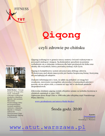 Qiqong czyli zdrowie po chińsku Prowadzący: Qigong (czikung) to w gruncie rzeczy zestawy ćwiczeń wykonywane w pozycjach siedzącej i stojącej. Są doskonałym sposobem na poranne rozbudzenie się a wskazane zwłaszcza dla ludzi przykutych do łóżka oraz idealny dla wszystkich, którzy prowadzą siedzący tryb życia. Qigong to kompleksowy system utrzymywania dobrego zdrowia. Wykonywany pod okiem nauczyciela jest bardzo bezpieczną formą i korzystną dla początkujących adeptów. Znakami informującymi o tym, że udało się pobudzić czi mogą być: swędzenie, mrowienie (szczególnie odczuwalne w koniuszkach palców) i pocenie się na całym ciele, a czasem też tępy ból w okolicach punktów akupunkturowch. Rafał Becker – Trenuje kung-fu od 15-go roku życia, instruktor czikungu według linii przekazu z klasztoru Shaolin. Jest uczniem Sławomira Pawłowskiego, który jest bezpośrednim uczniem mnichówmistrzów z klasztoru Shaolin w Chinach. Założyciel Warszawskiej Grupy Shaolińskiego Qigong w Warszawie. Zdrowotne działanie qigong zostało oficjalnie uznane za technikę leczniczą w chińskich szpitalach w roku 1989. Ogłoszono przez Rząd Chin w 1996 roku jako oficjalną część Narodowego Planu Zdrowia. . www przebudzenie.net/autorzy/Rafal-Becker/ Środa godz. 20:00 Kontakt: [email protected] tel: 48 660599733 Konarskiego 3, Warszawa www.atut.warszawa.pl